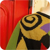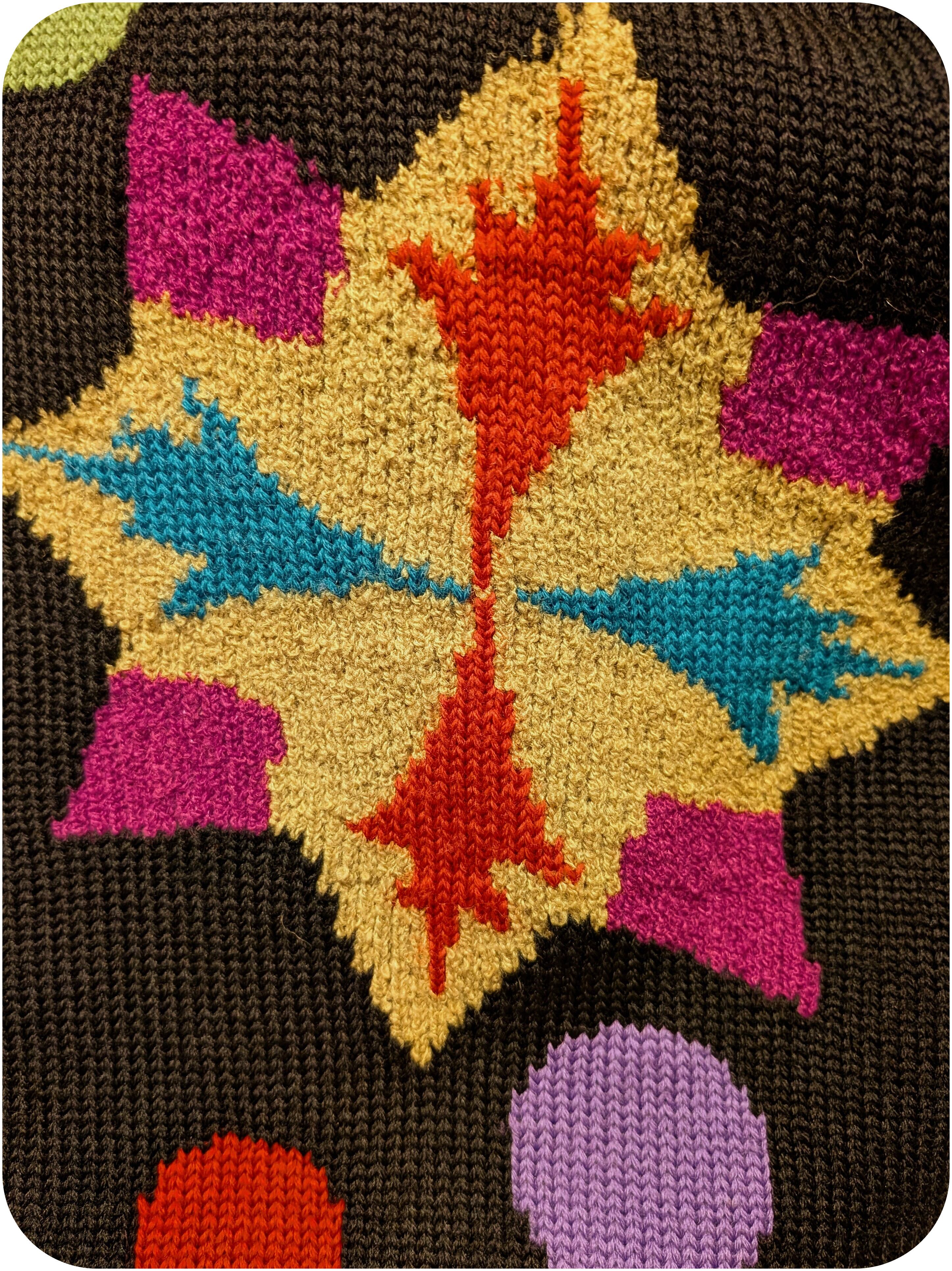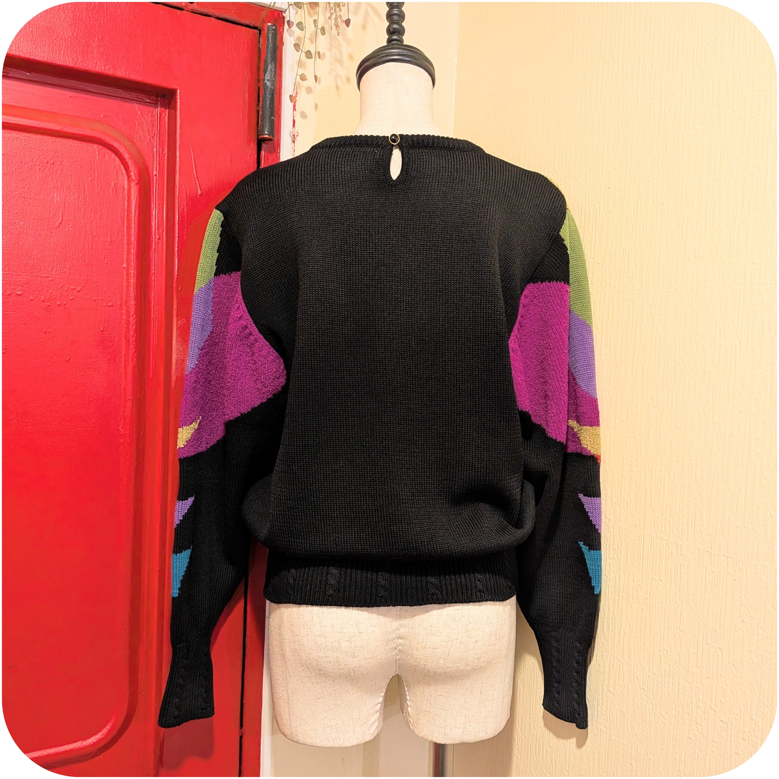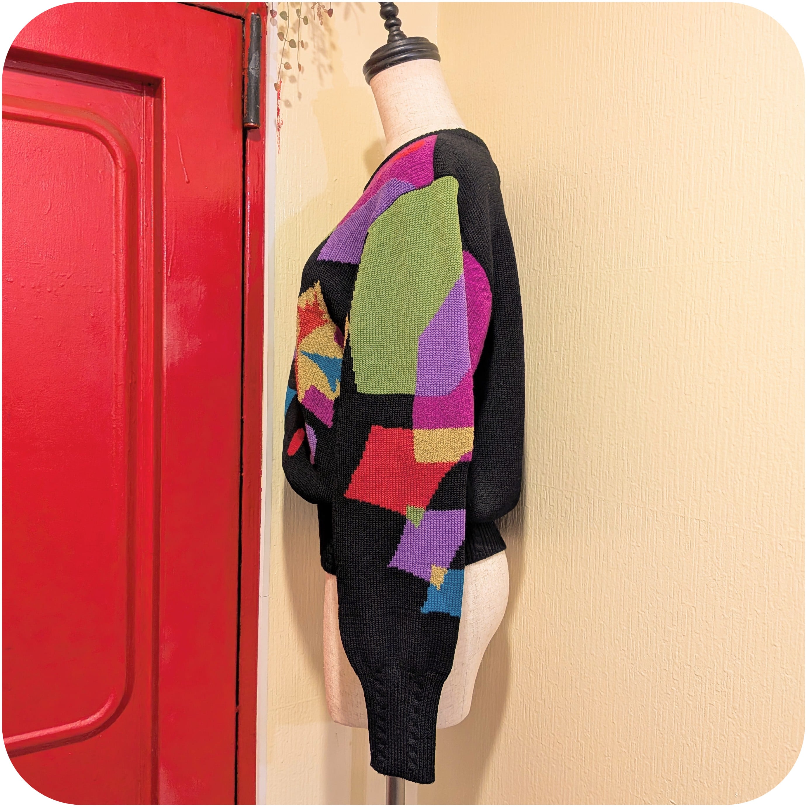 モードなブラック×グリーン×ラズベリーのカラフルモチーフ柄ニットです。