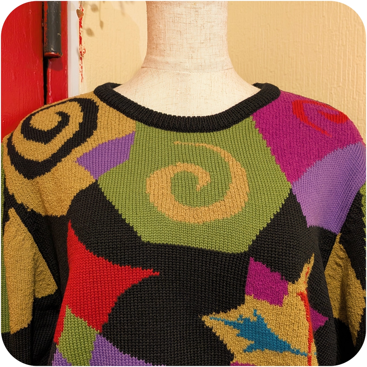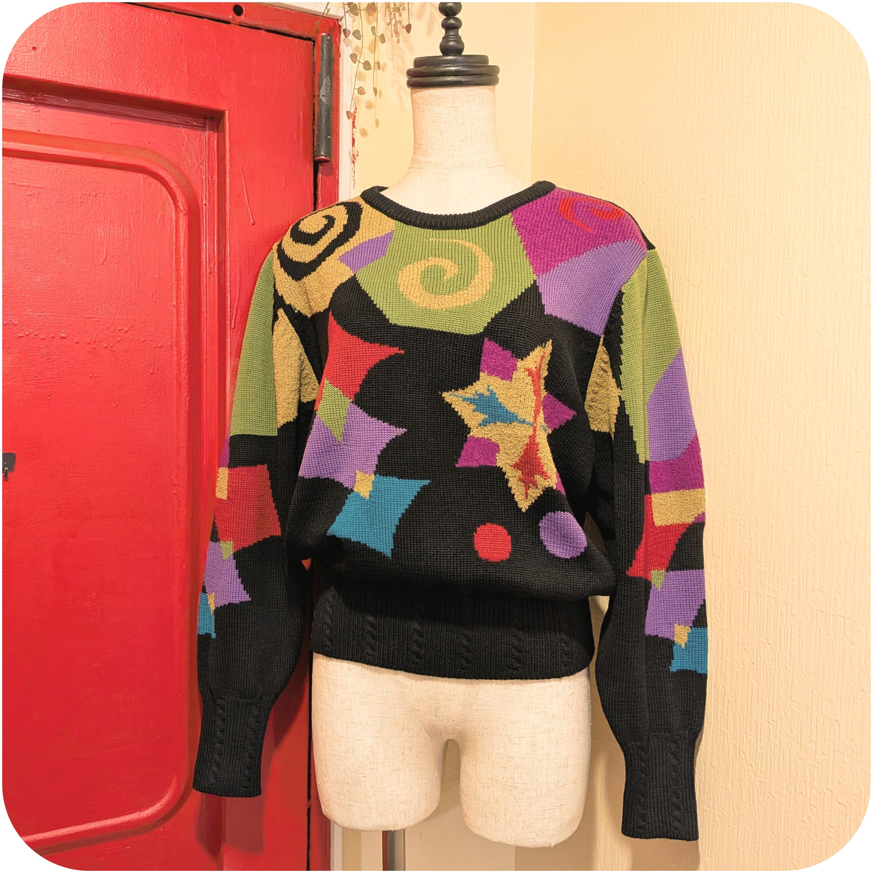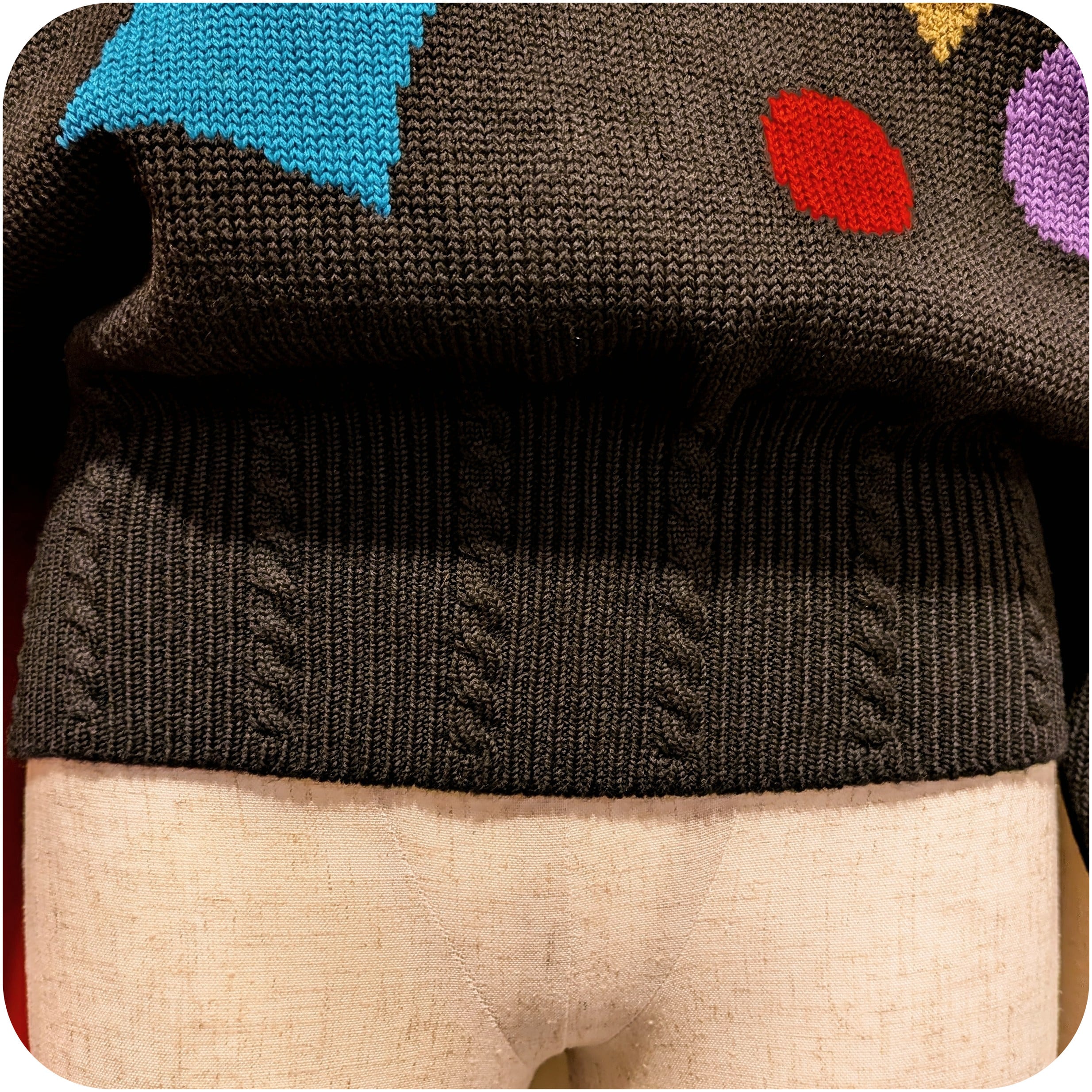 古着ならではのカラフルでユニークなモチーフ柄と、リブ部分にほどこされたクラシカルなケーブル編みがとっても素敵。