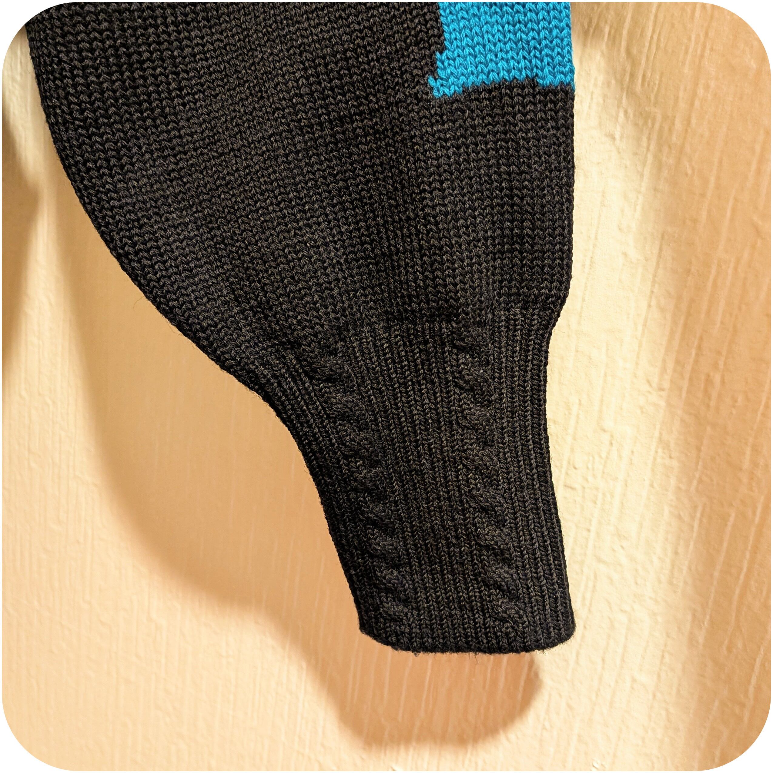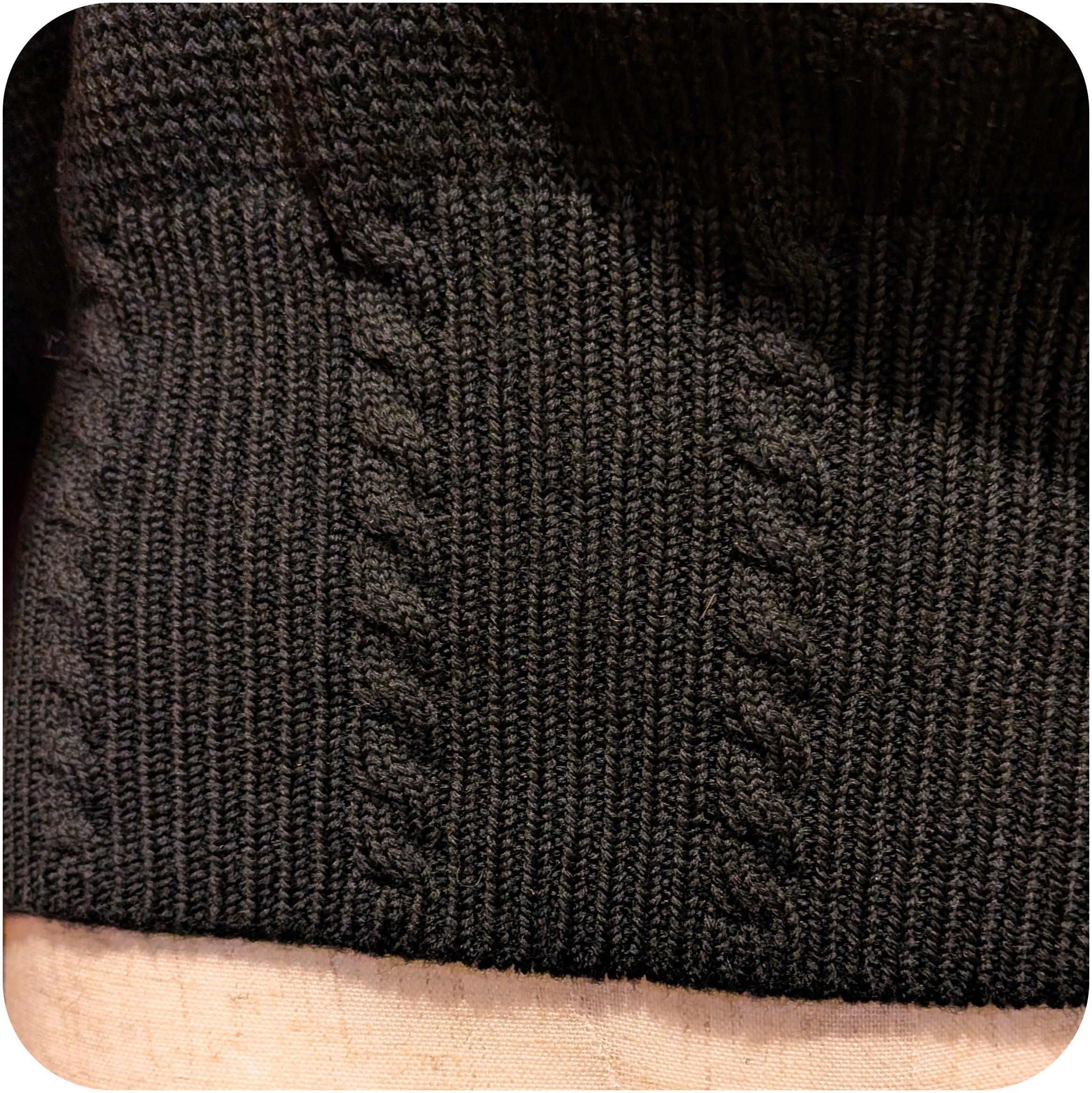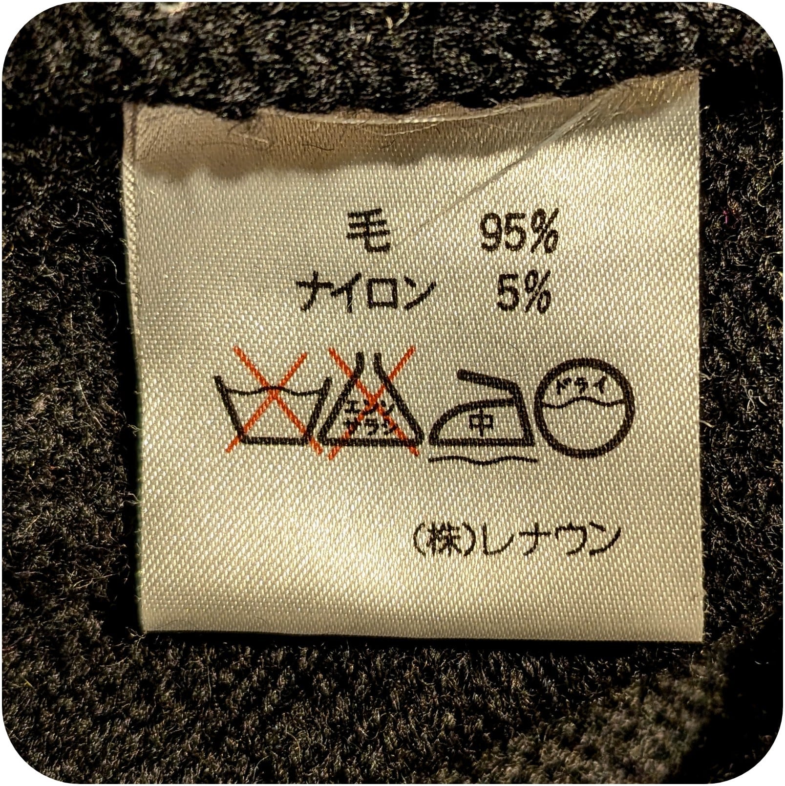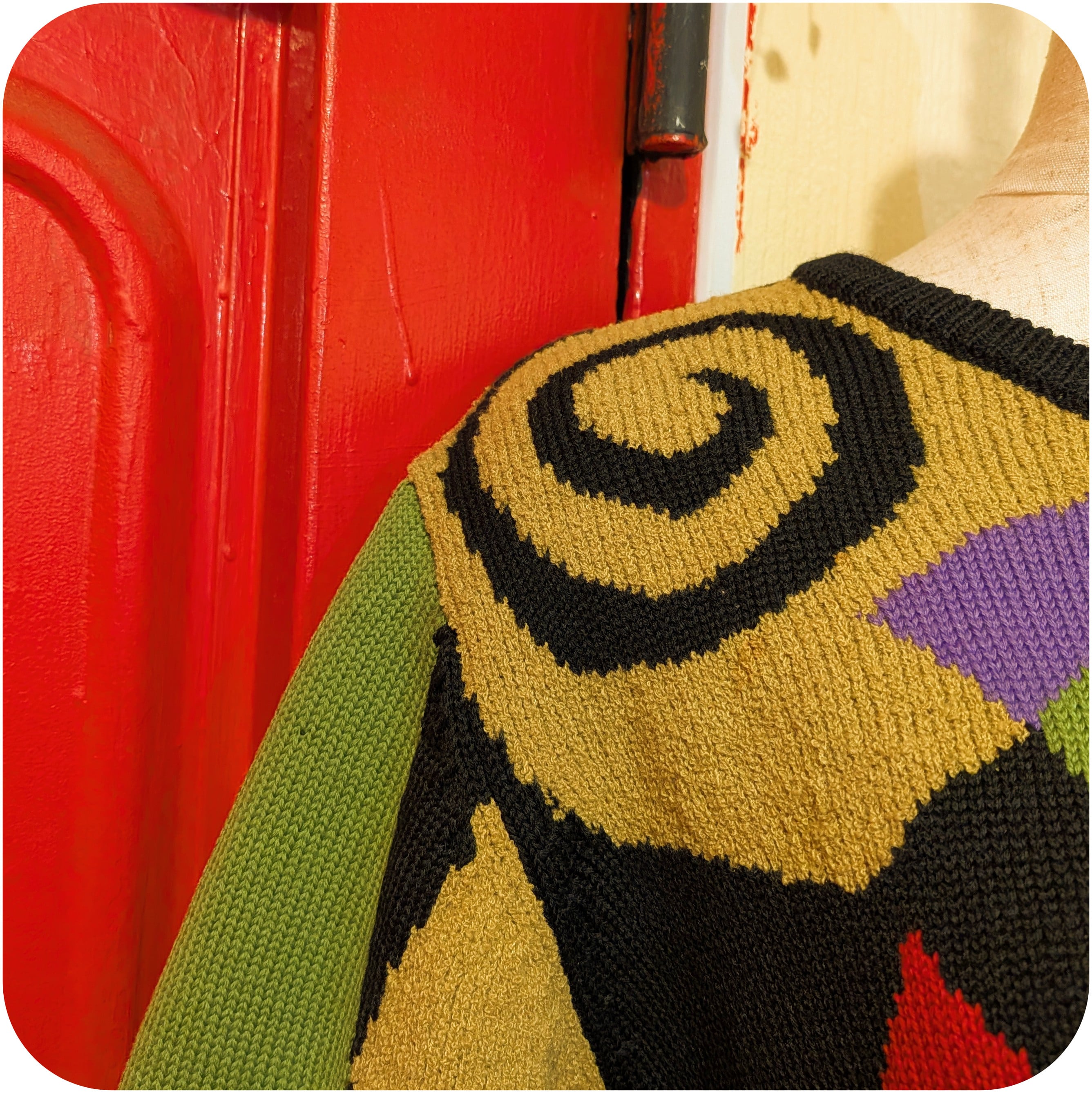 古着ならではのカラフルでユニークなモチーフ柄と、リブ部分にほどこされたクラシカルなケーブル編みがとっても素敵。
