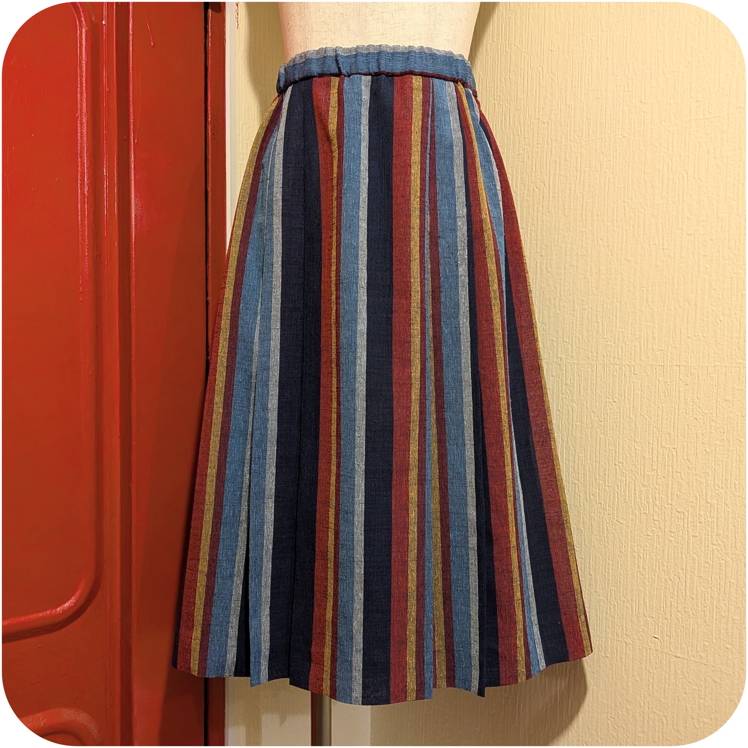 レトロなスモーキーブルー×レッド×ネイビーのストライプ柄スカートです。