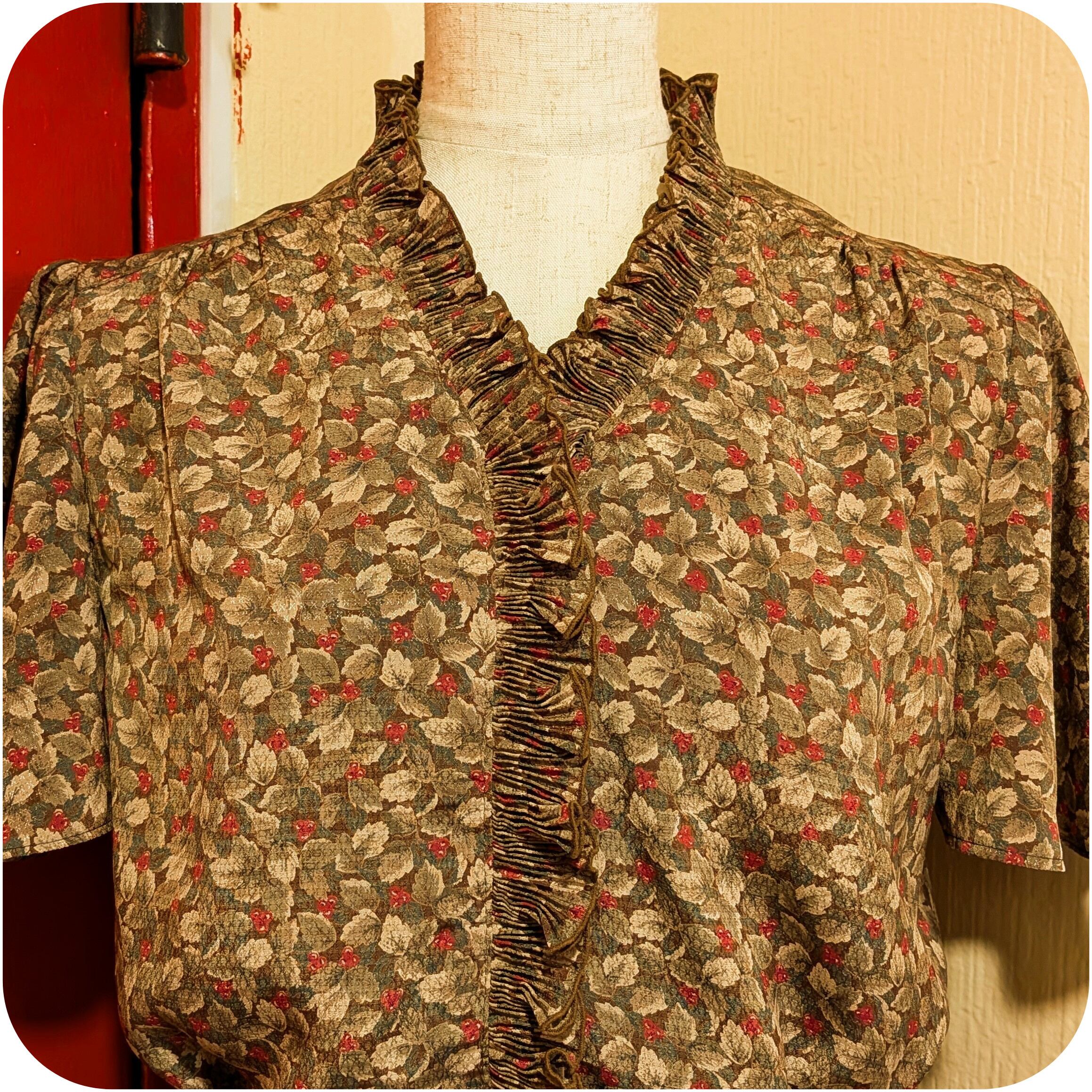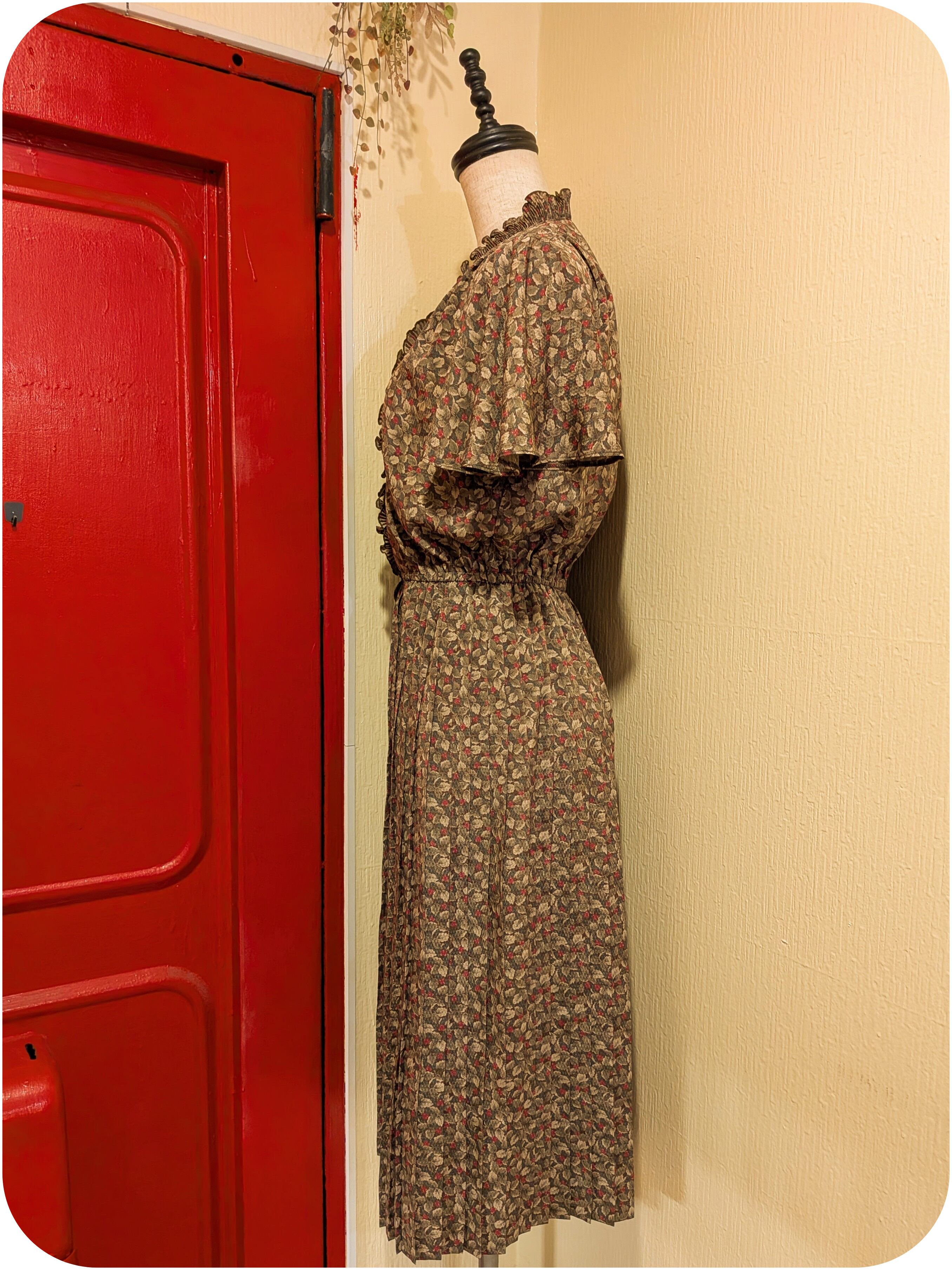 シックなカーキ×レッドのベリー柄プリーツワンピースです。