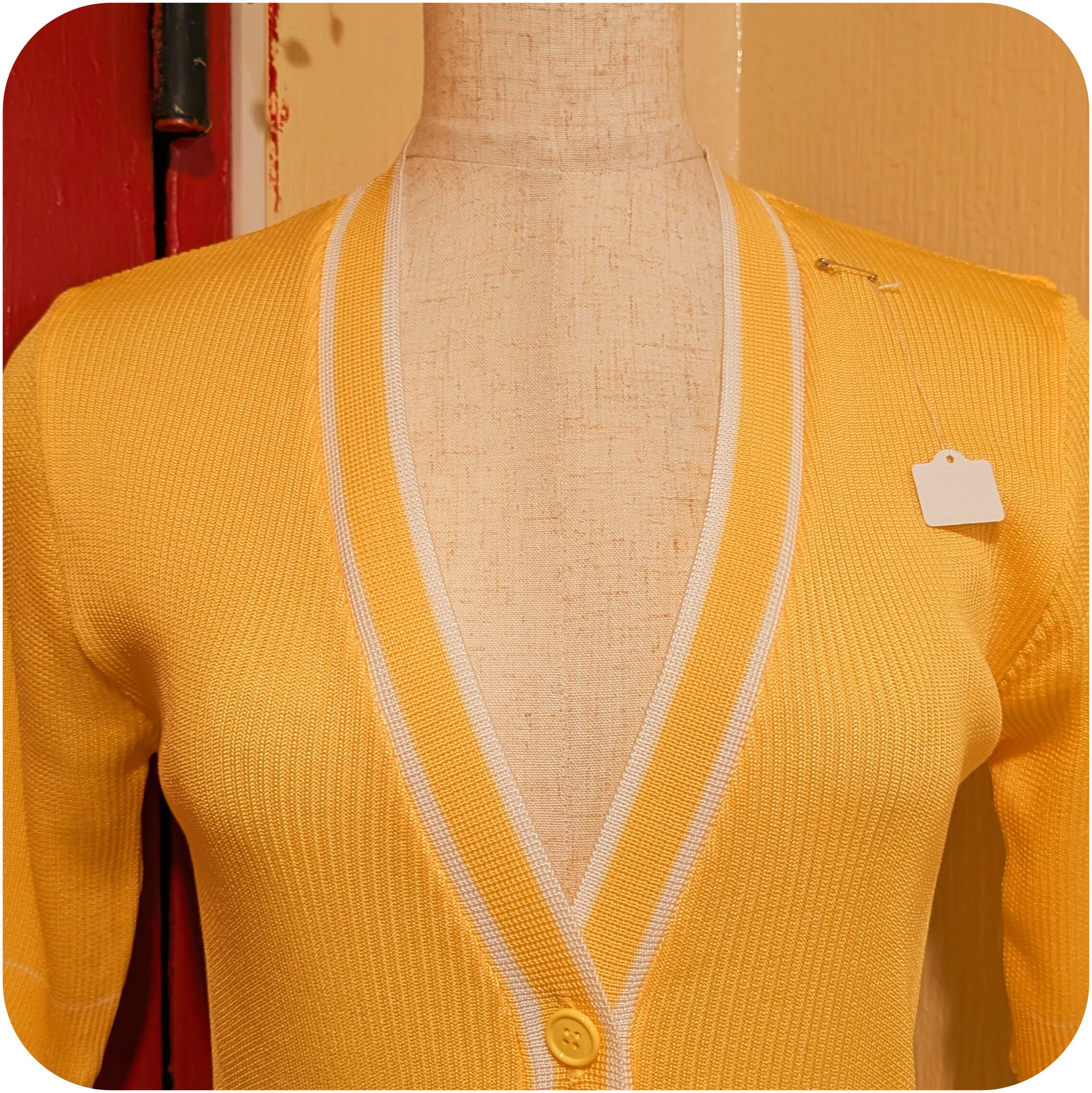 昭和レトロなイエロー×ホワイトのVネックリブカーディガンです。