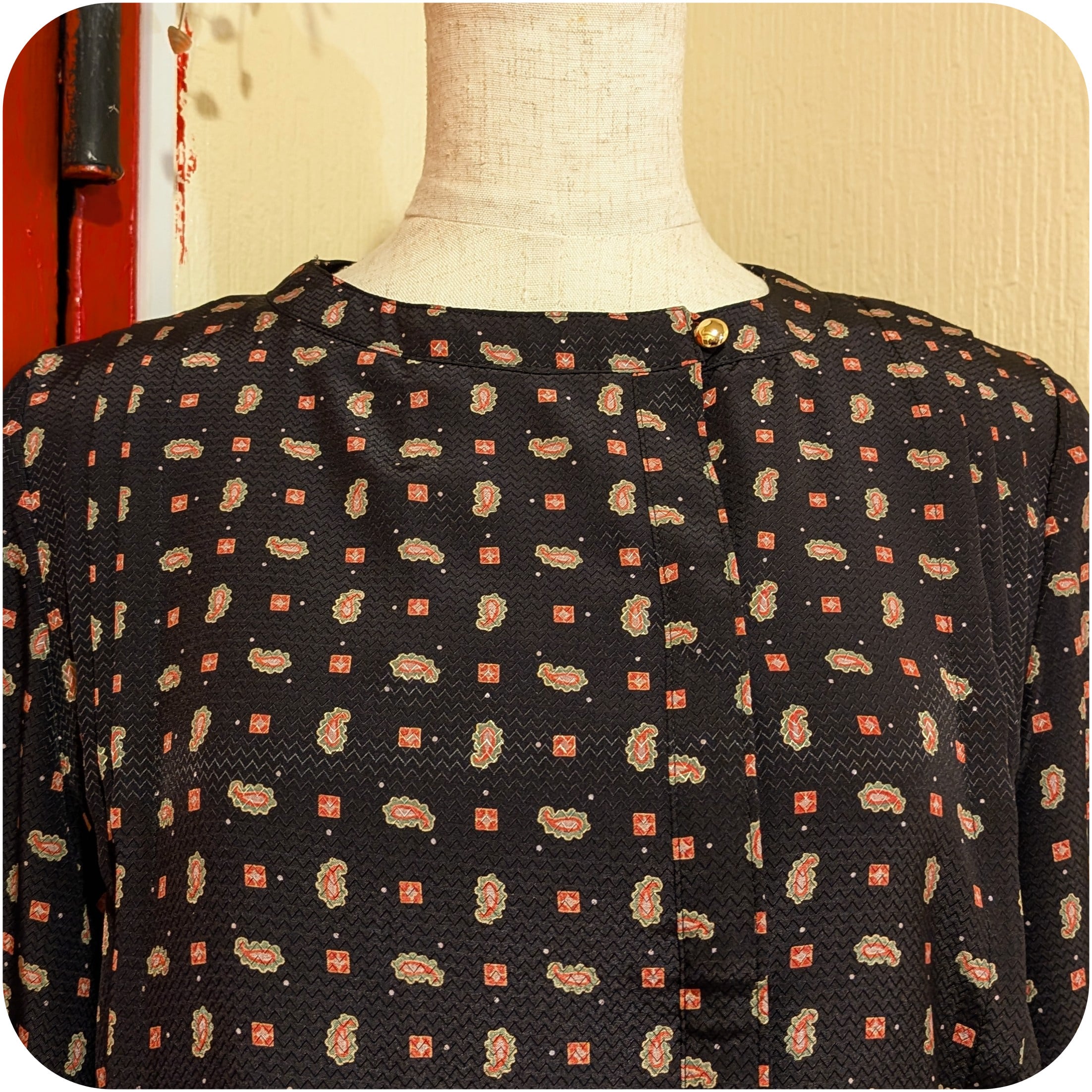 シックなダークネイビー×レッド×カーキのペイズリー柄ブラウス