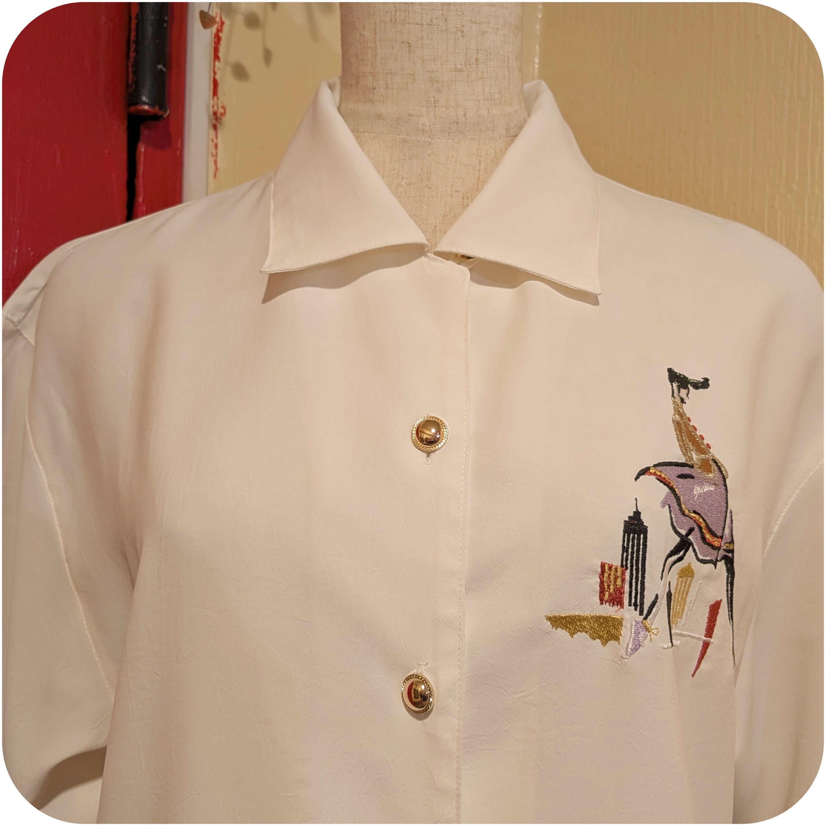 モードなホワイト×ラベンダー×ブラックのレディ柄刺繍入りブラウスです。