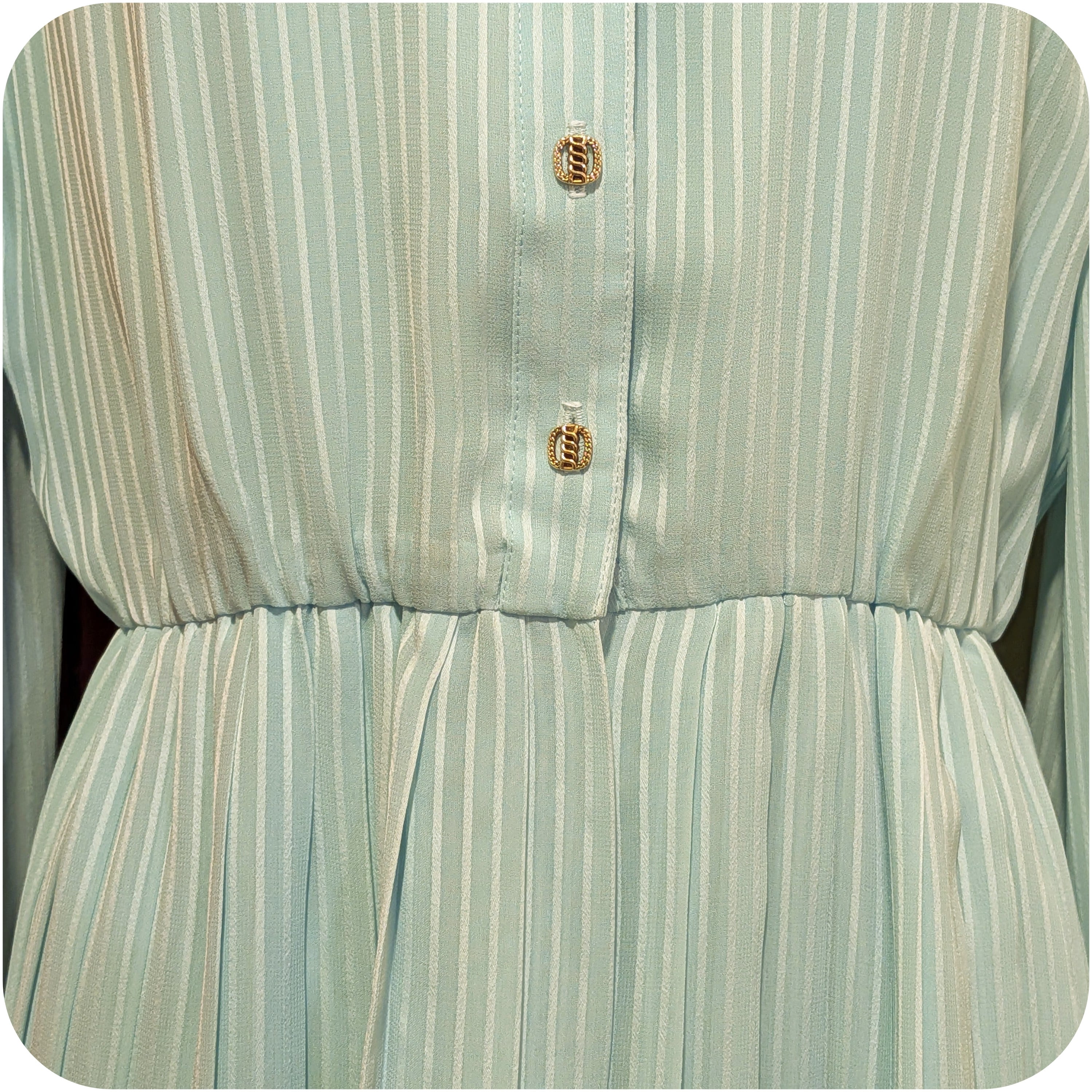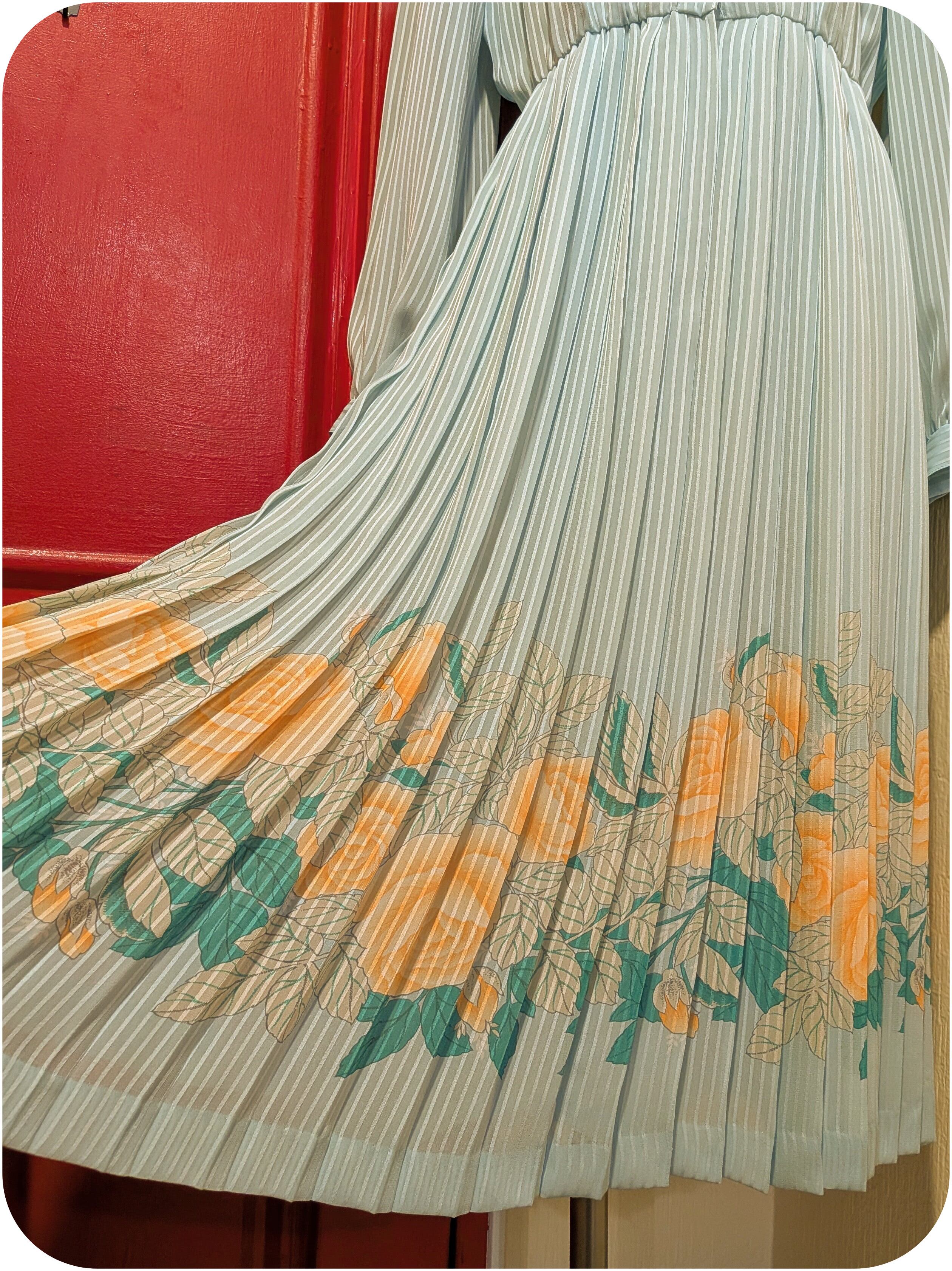 エレガントなミントグリーン×サンイエローのフラワー柄プリーツワンピース