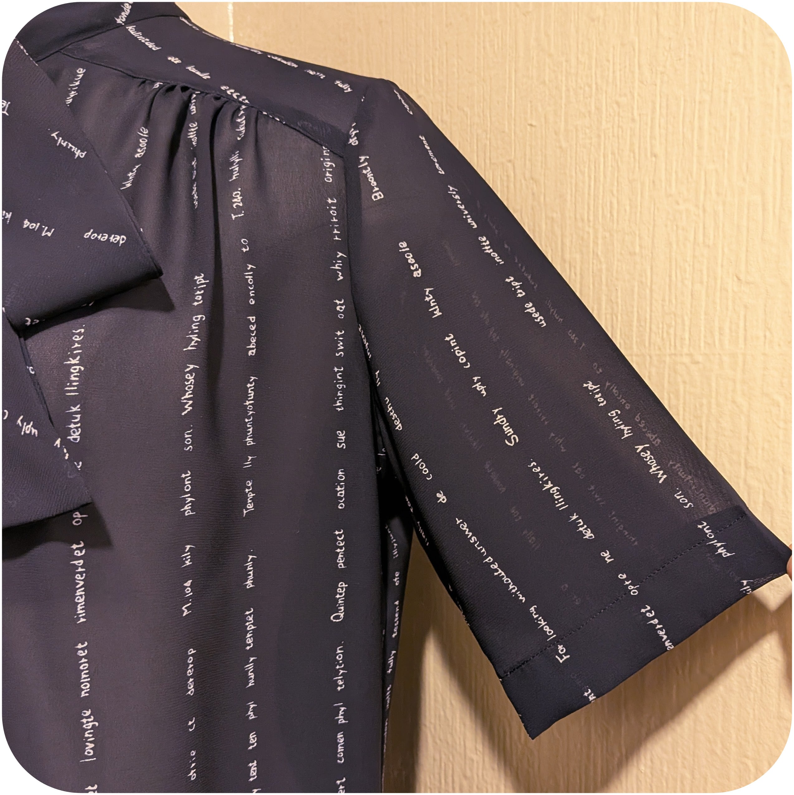 シックなネイビー×ホワイトの英字柄ボウタイブラウス