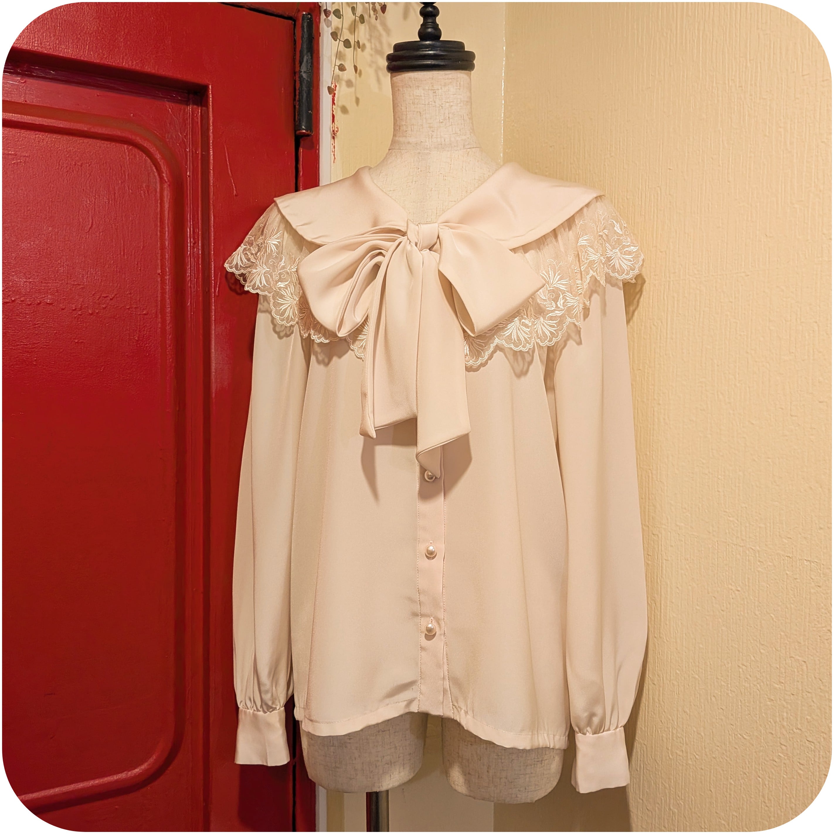 エレガントなライトピンクベージュのケープカラーデザインブラウスです。