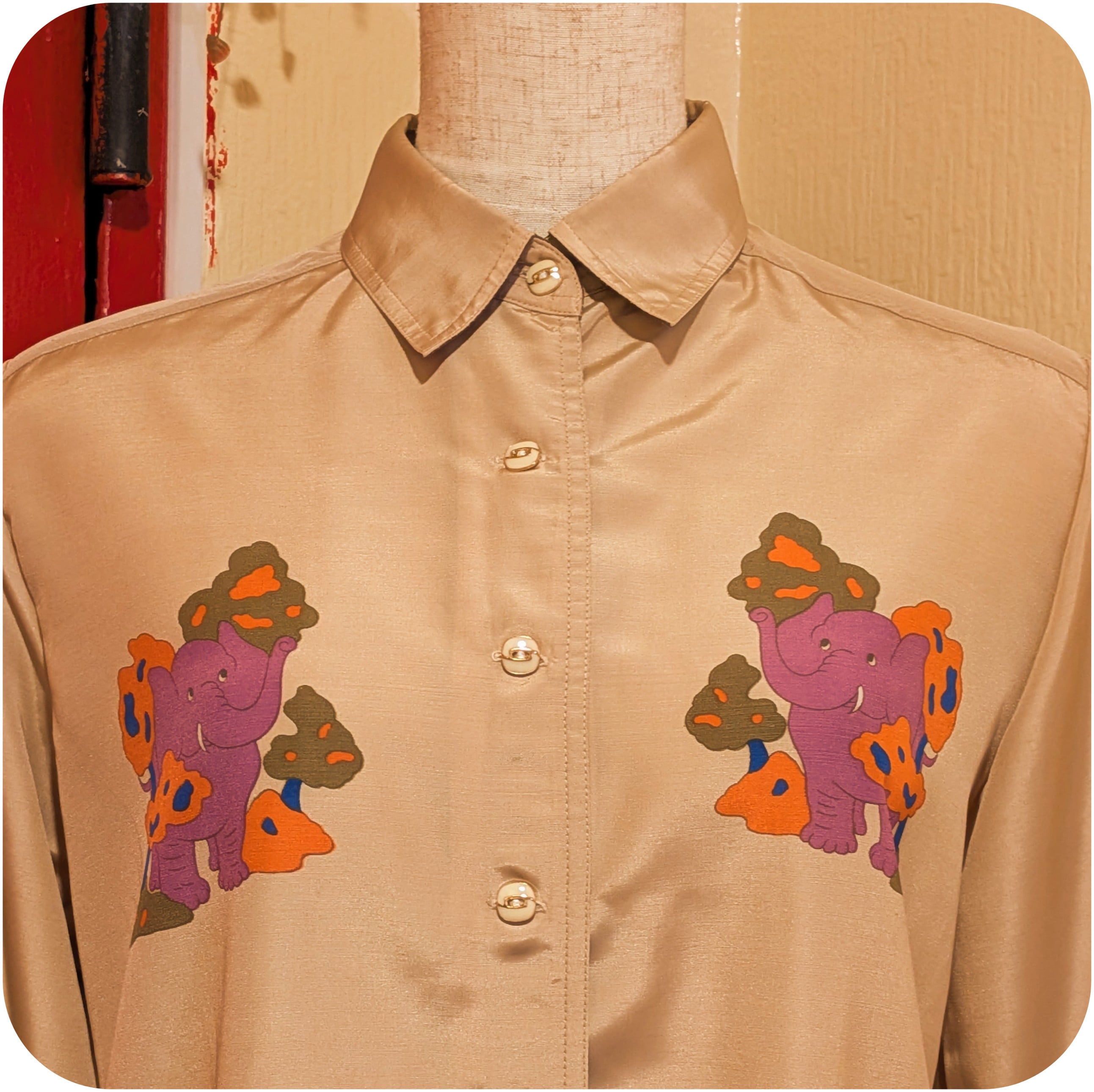 レトロなベージュ×パープル×オレンジのエレファント柄ブラウスです。