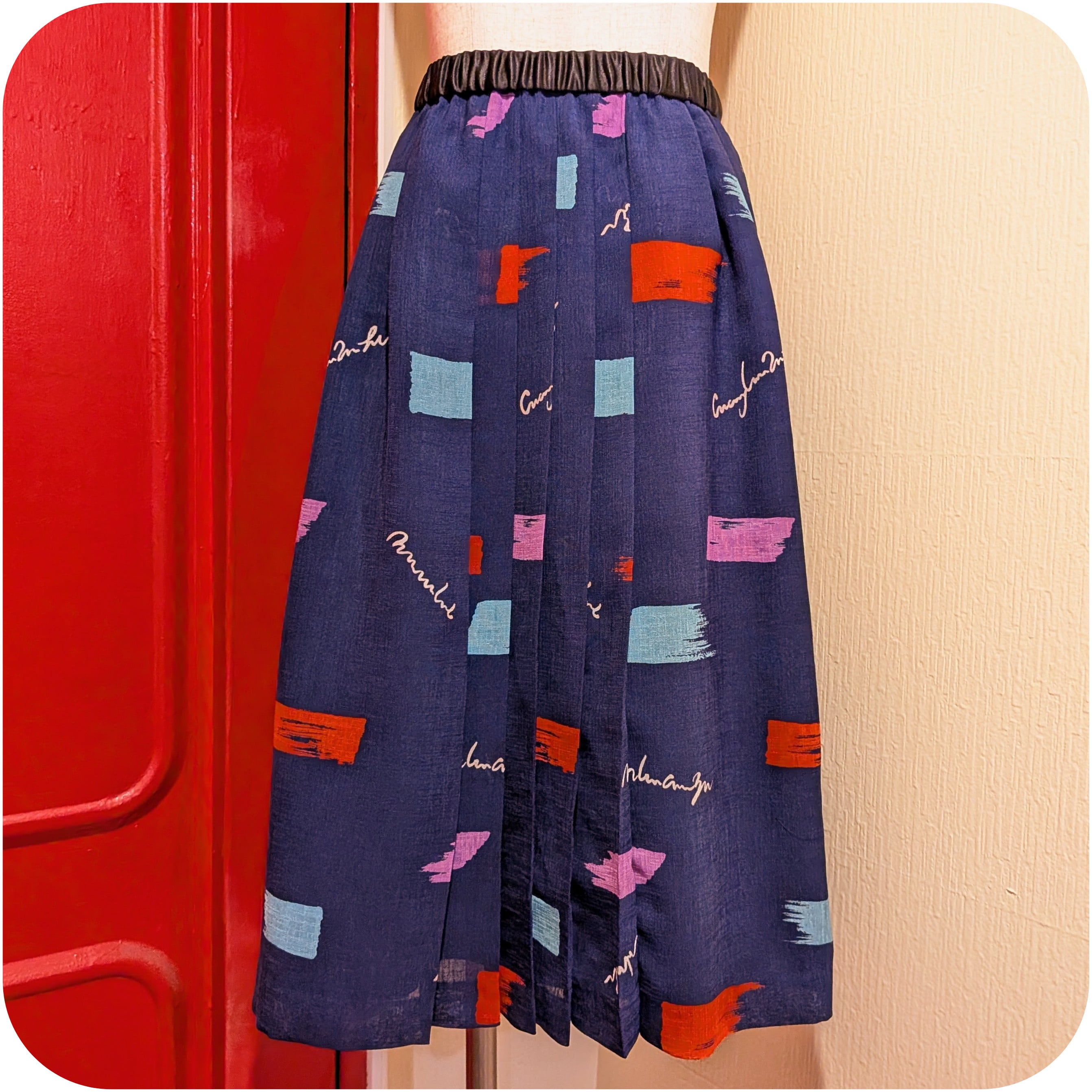 レトロなネイビー×レッド×ブルーのスクエアモチーフ柄スカート