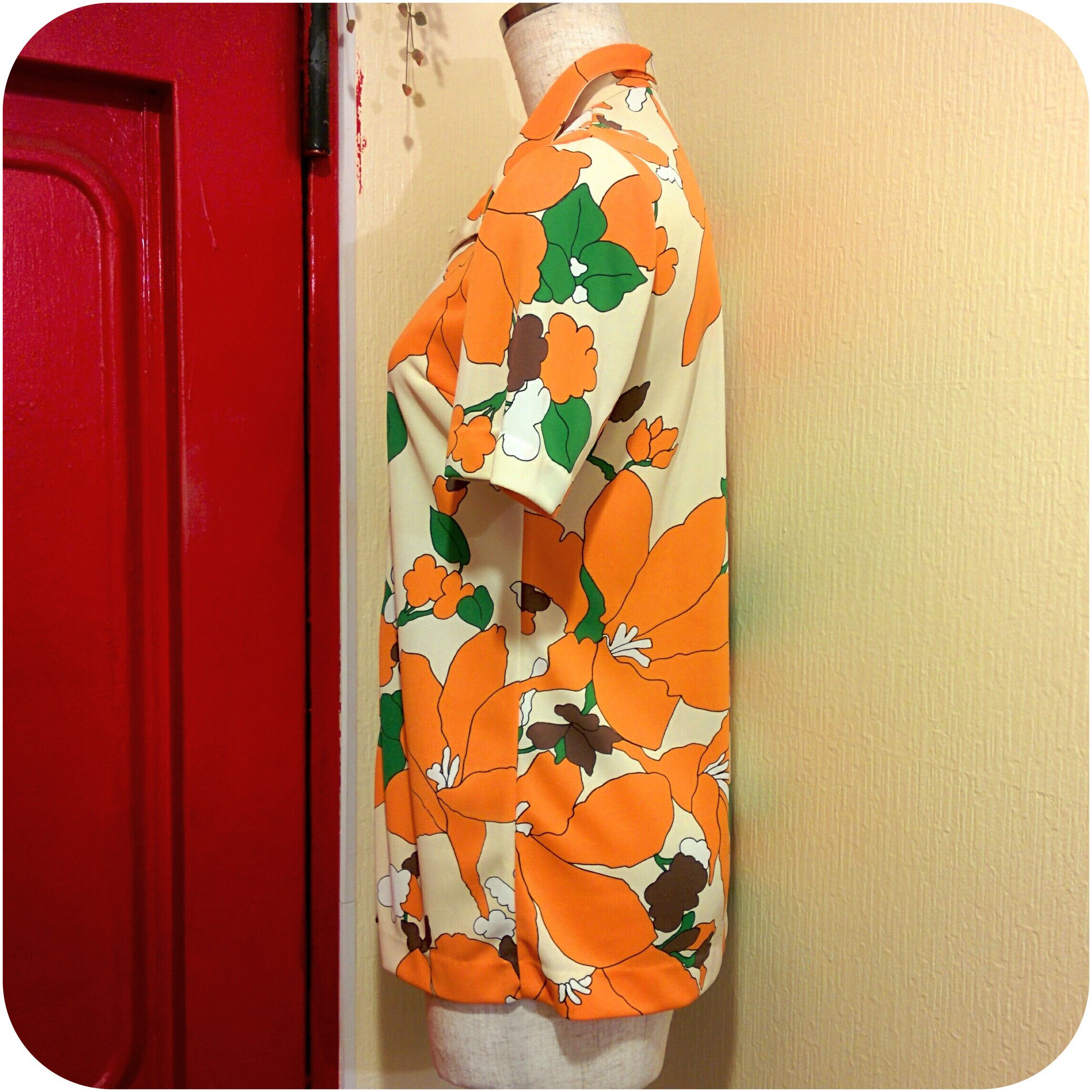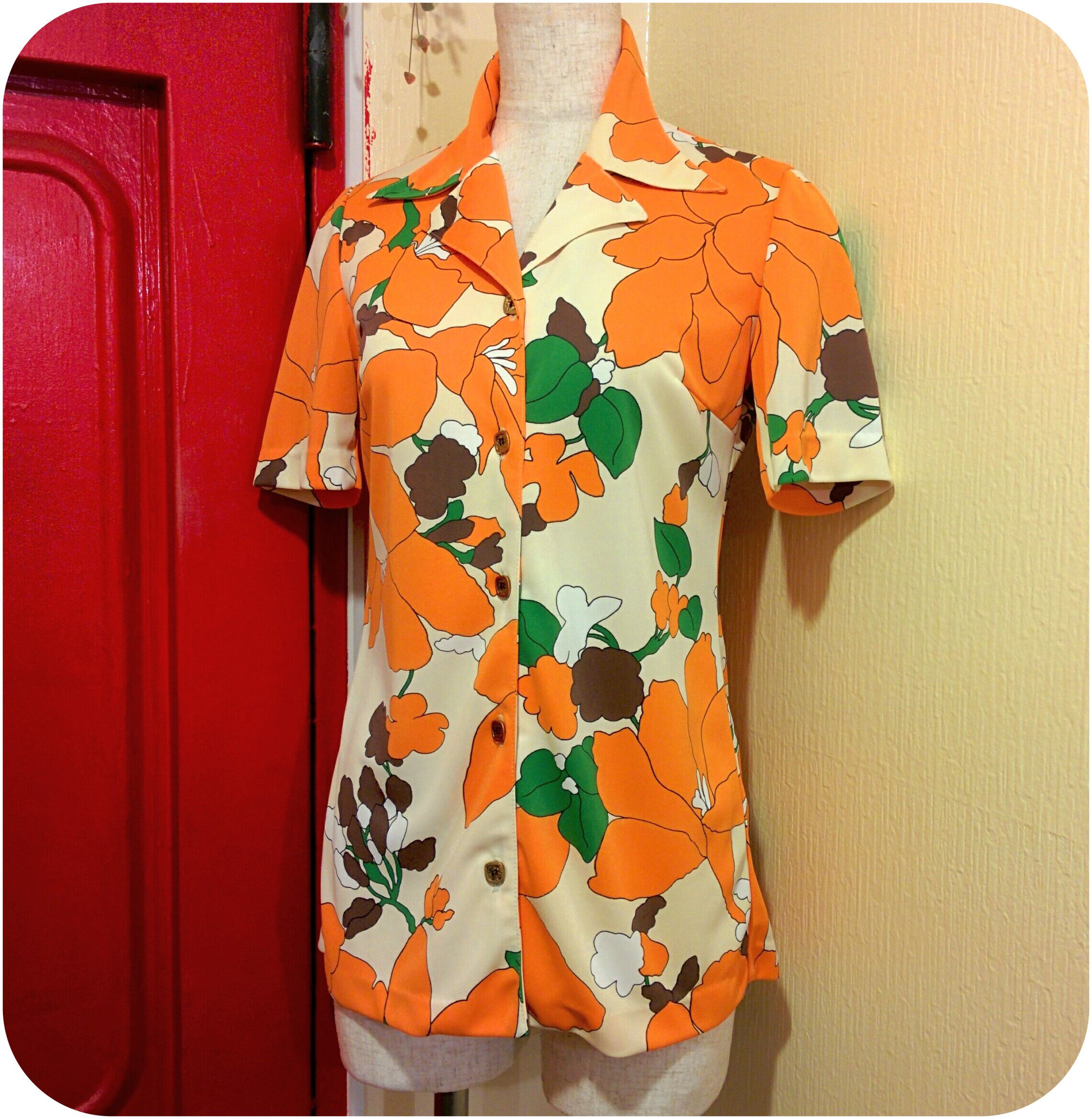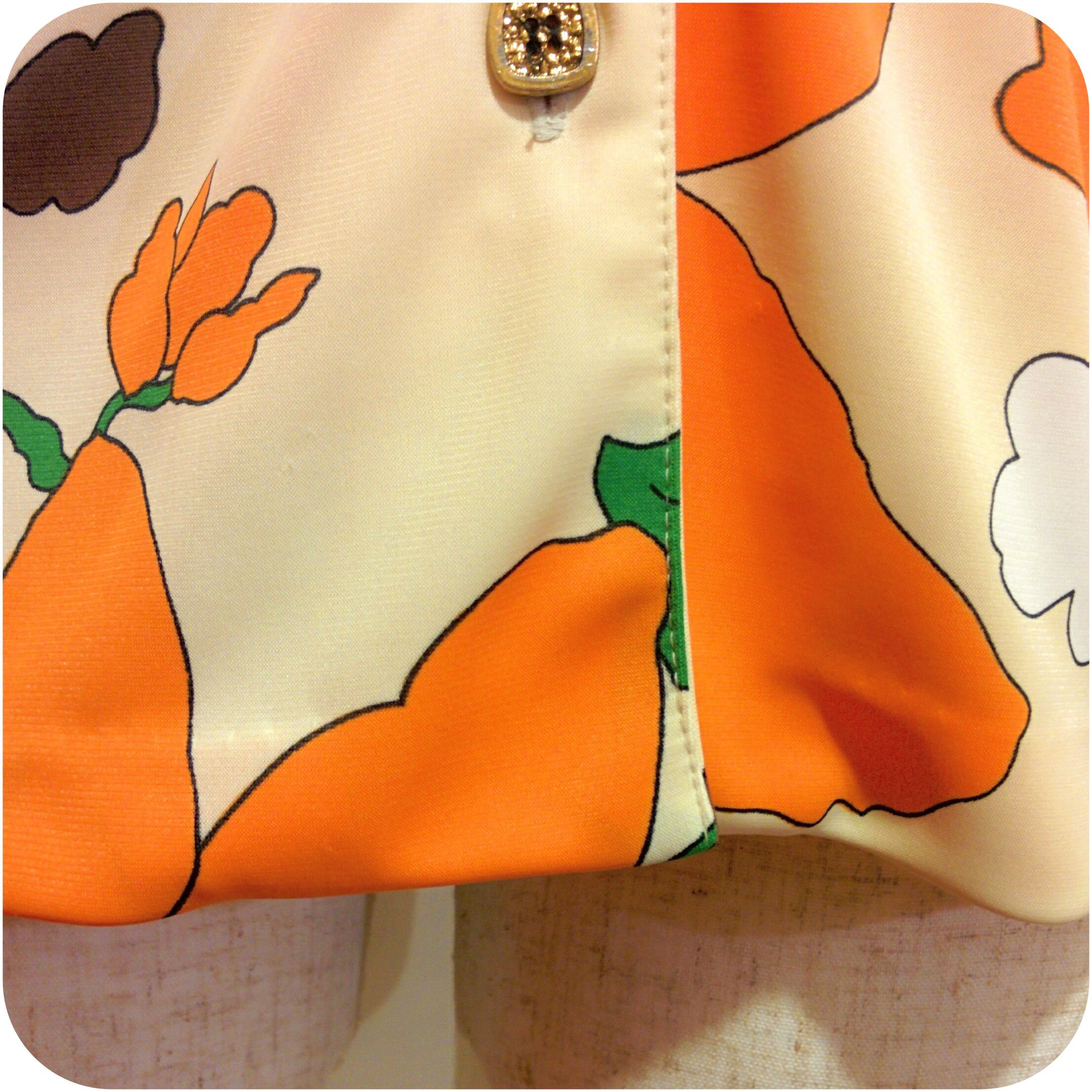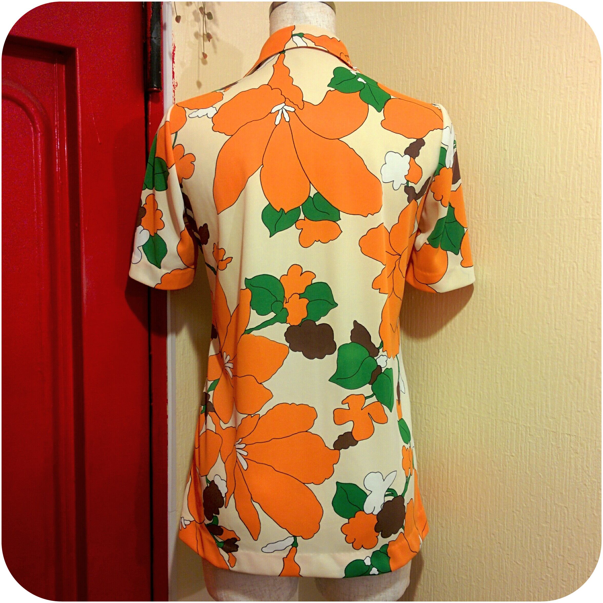 昭和レトロなオレンジ×クリームベージュのフラワープリントブラウス