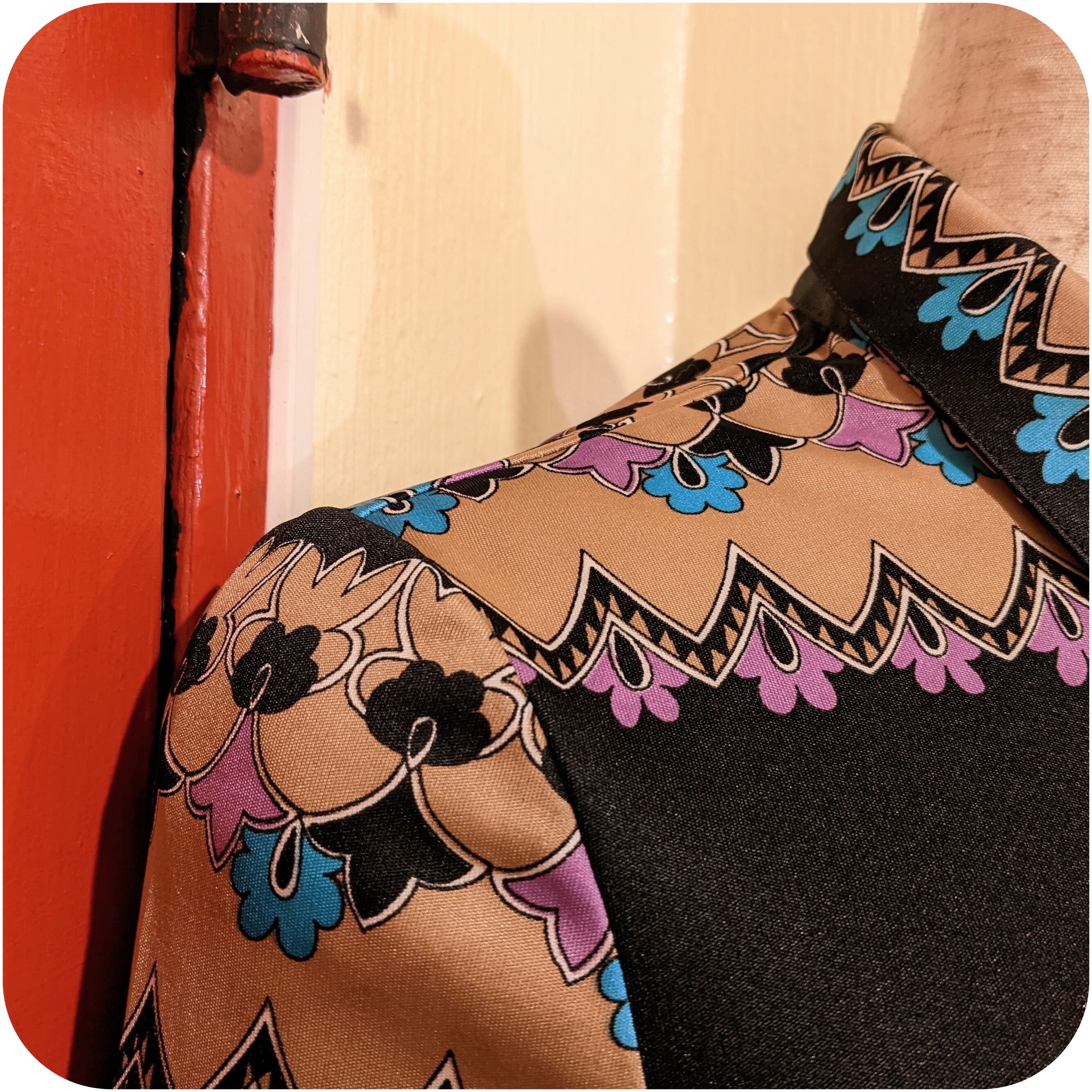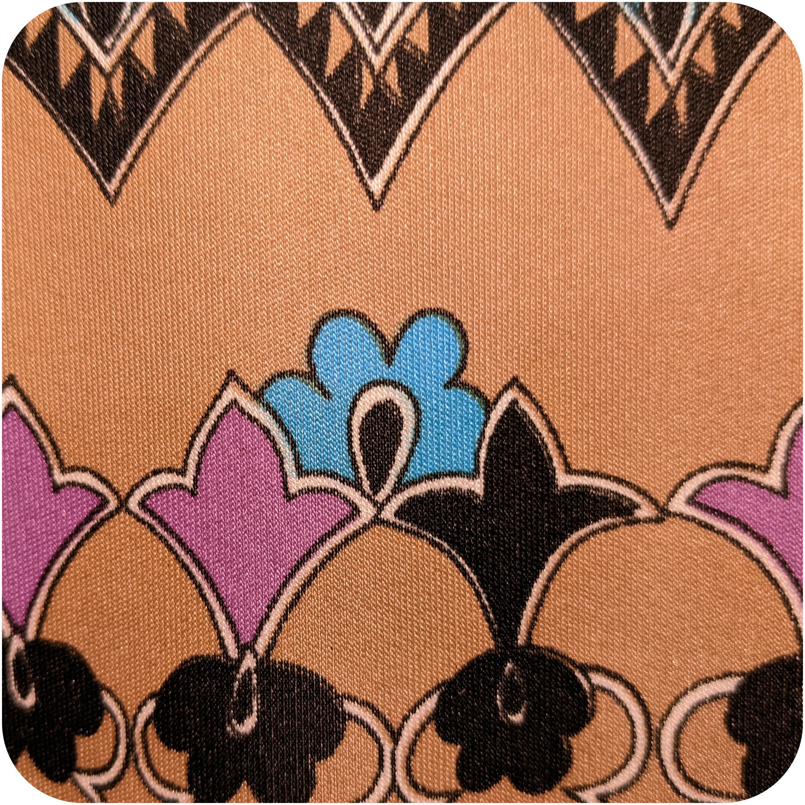 少し大人っぽい色合いのレトロなパネル柄と、ストレッチのきいた美しいシルエットがとっても素敵。