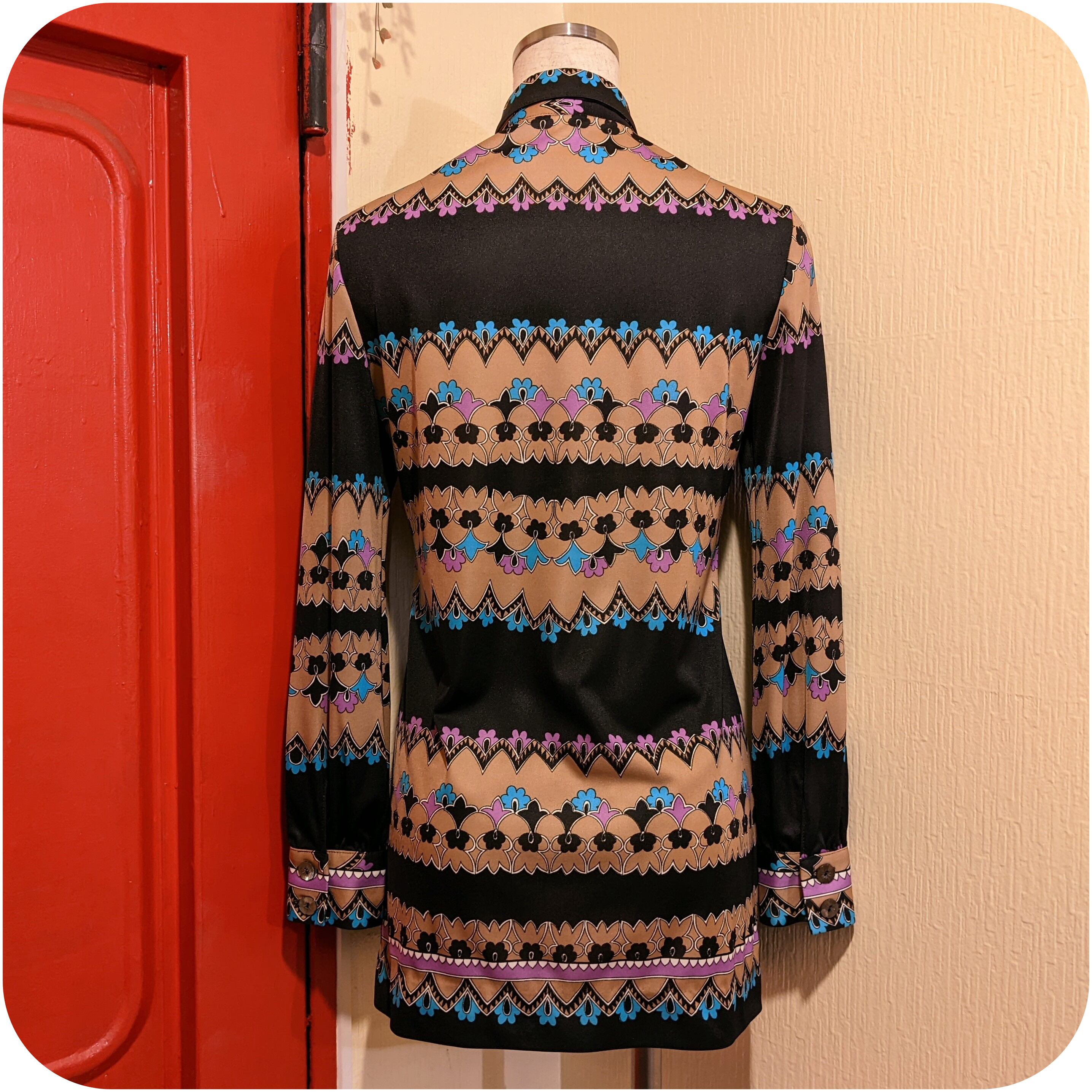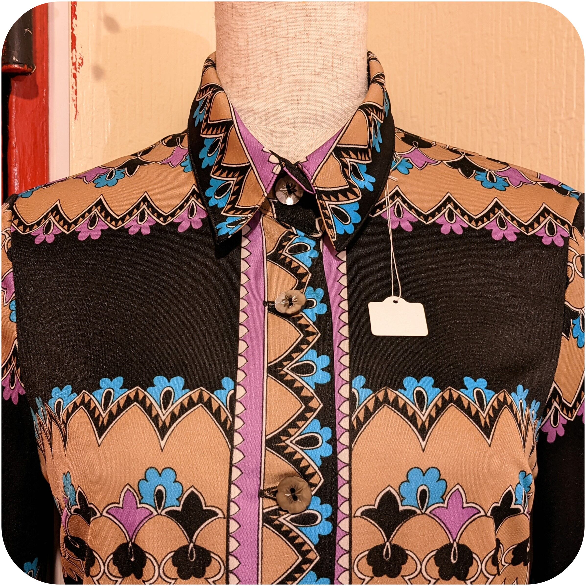 レトロなベージュ×ピンクパープル×ライトブルーのフラワーパネル柄ブラウスです。