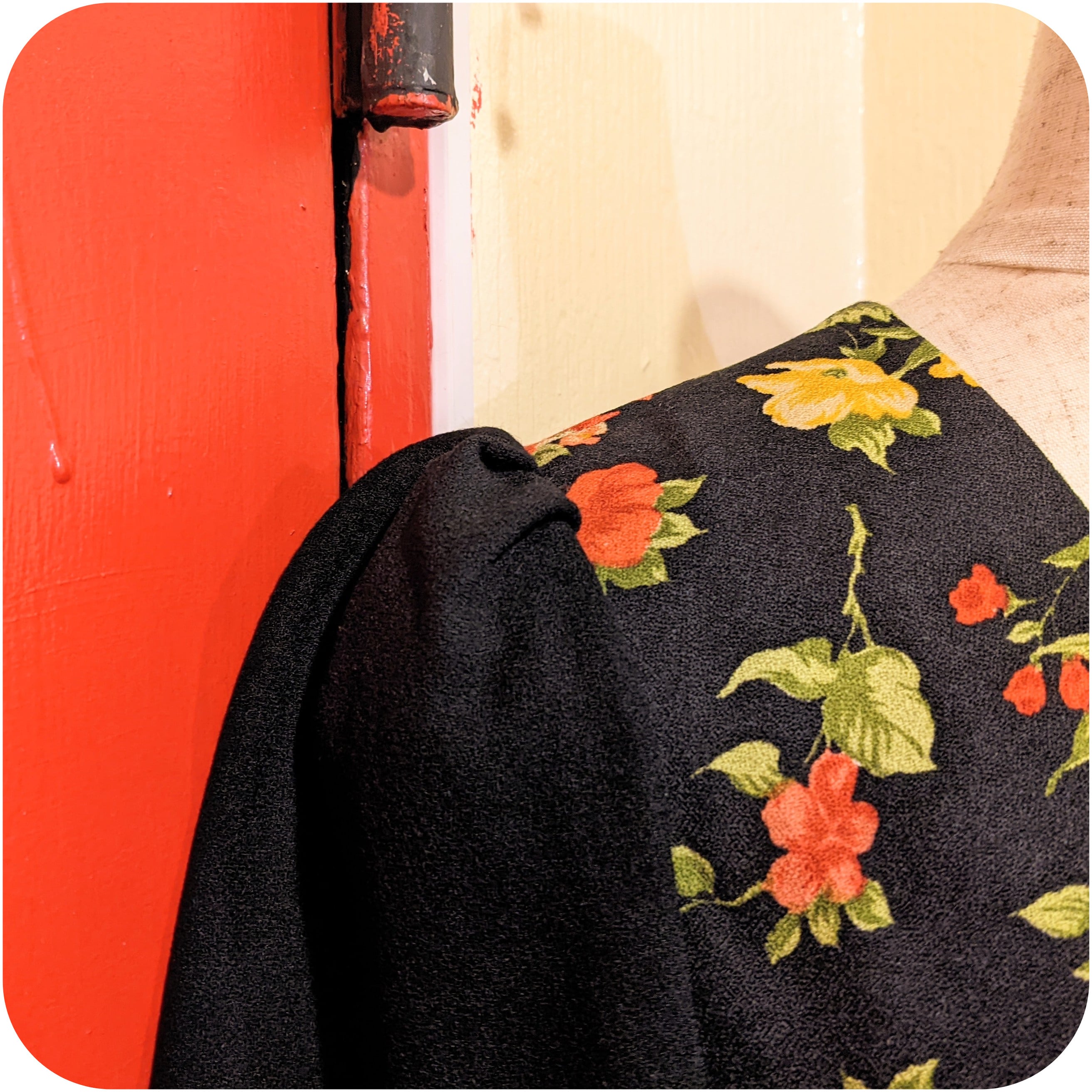 レトロなブラック×レッド×グリーンのフラワー柄ヨークデザインチュニックワンピース