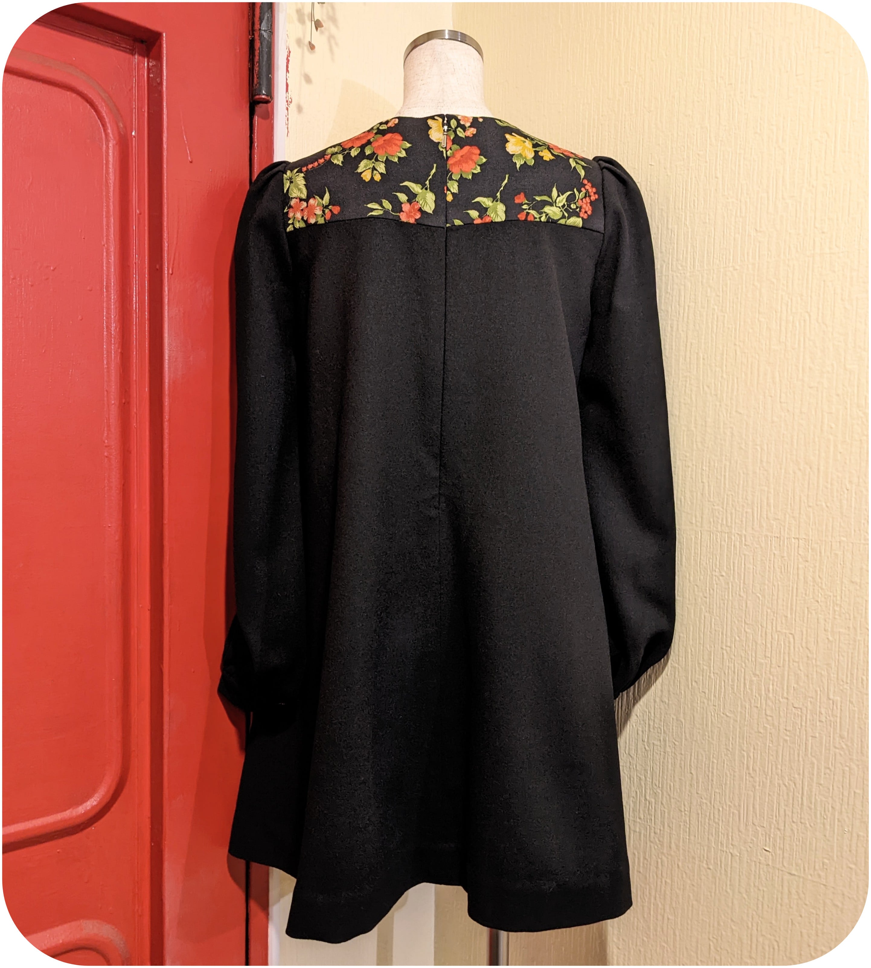 レトロなブラック×レッド×グリーンのフラワー柄ヨークデザインチュニックワンピースです。