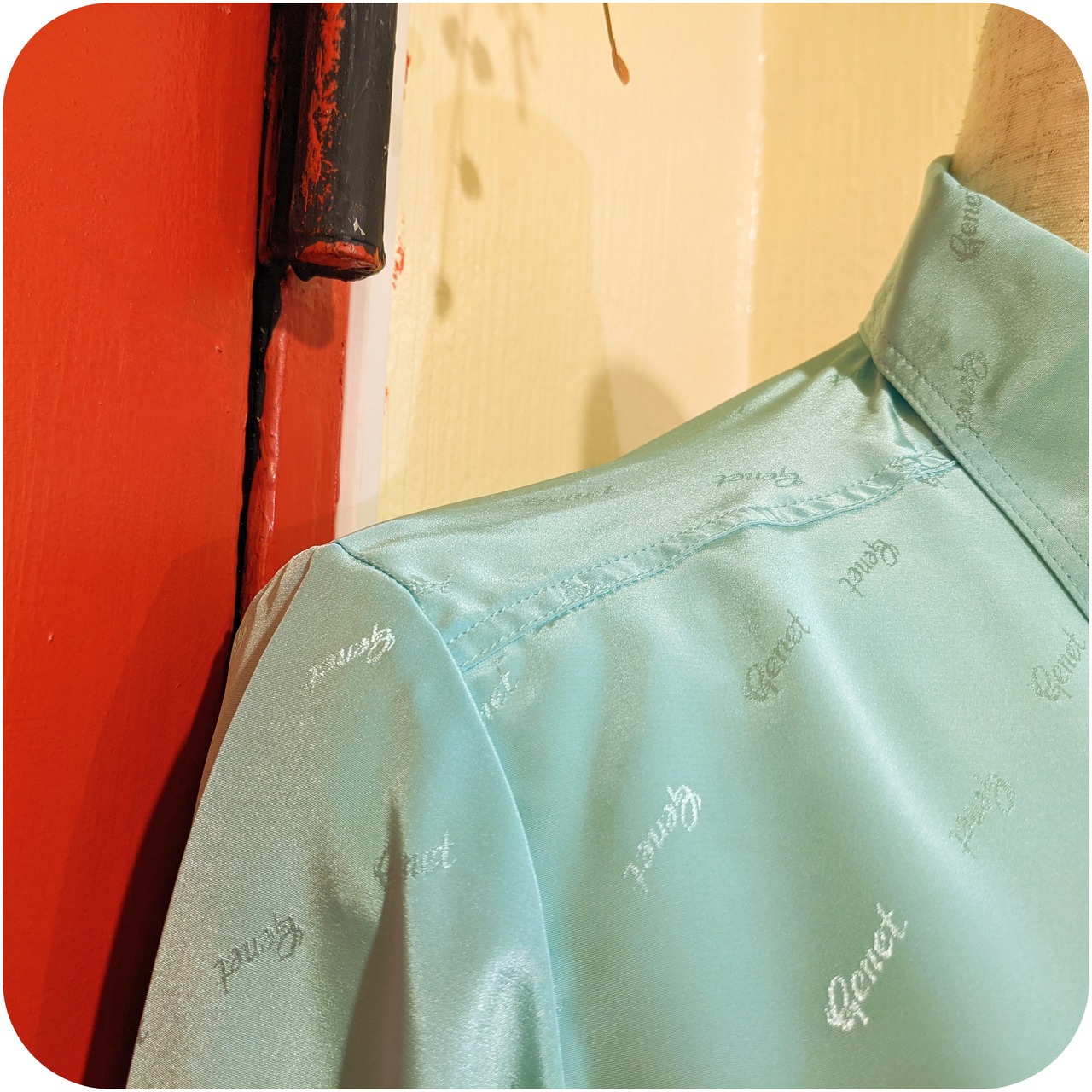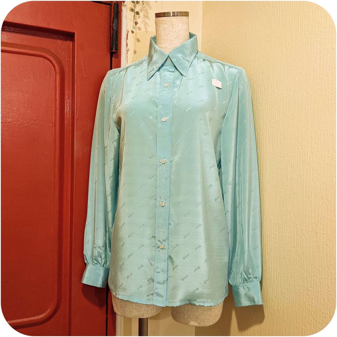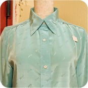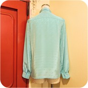 クラシカルなアイルトーンブルーのロゴモチーフ柄ブラウスです。
