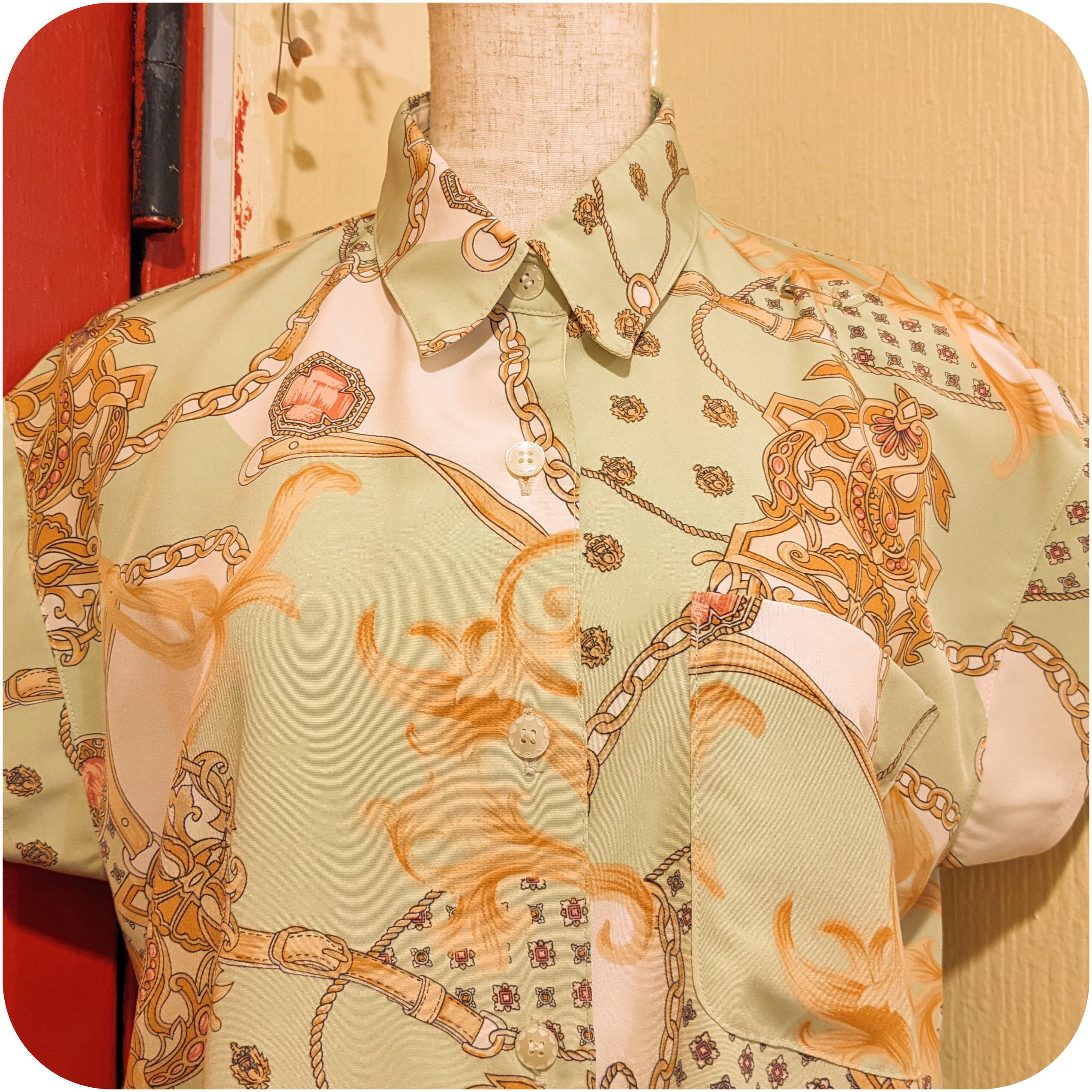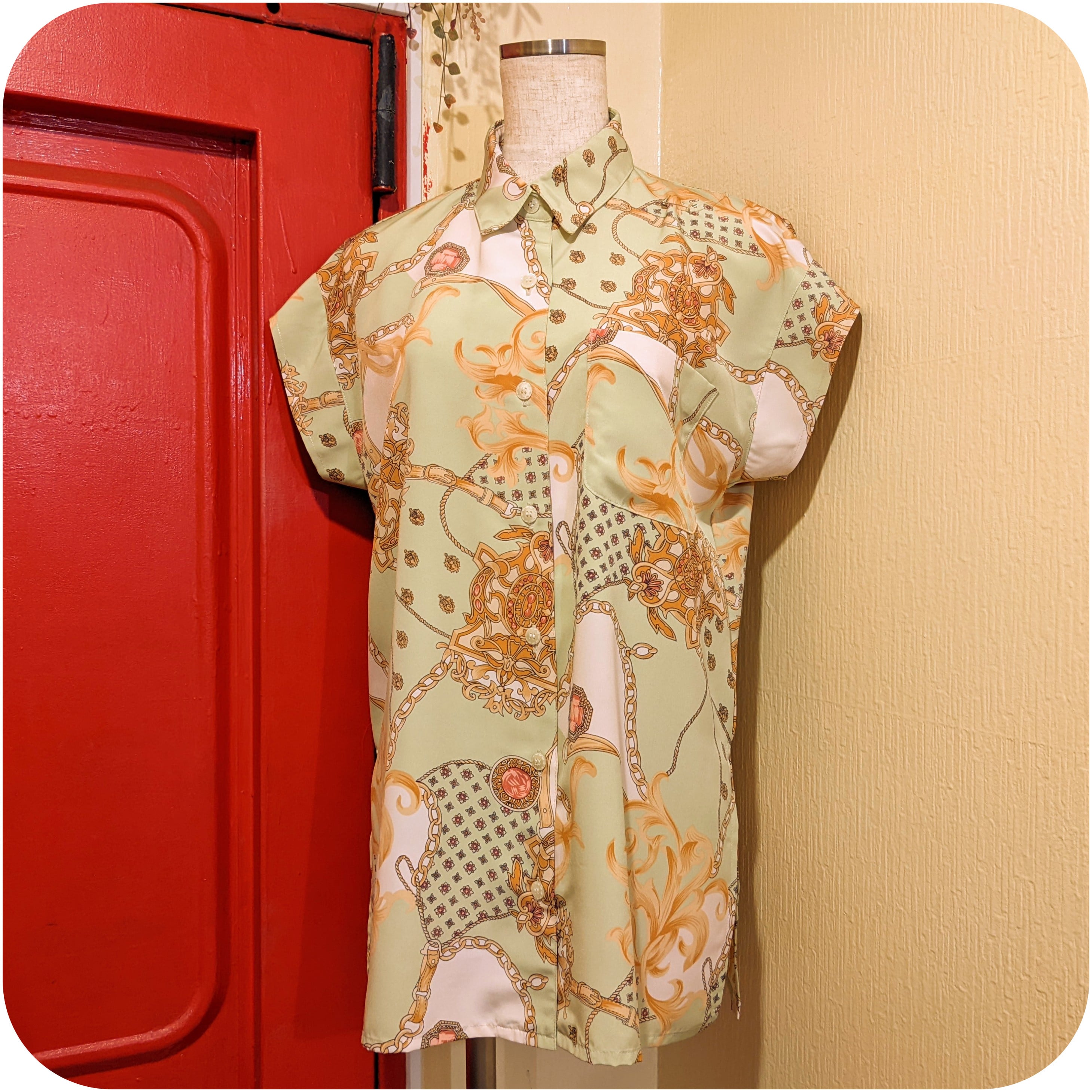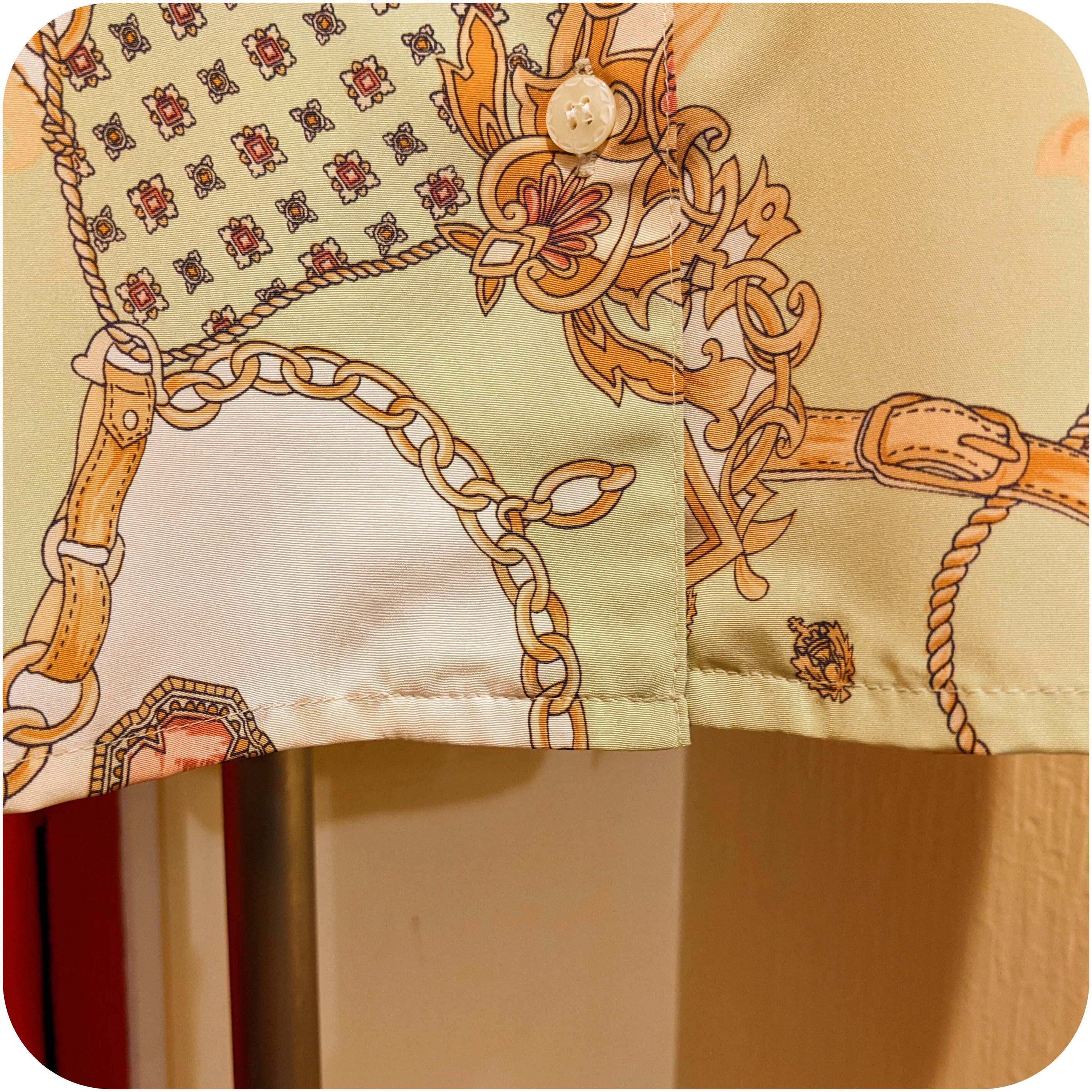 モードなパステルグリーン×イエローベージュのスカーフ柄ブラウスです。