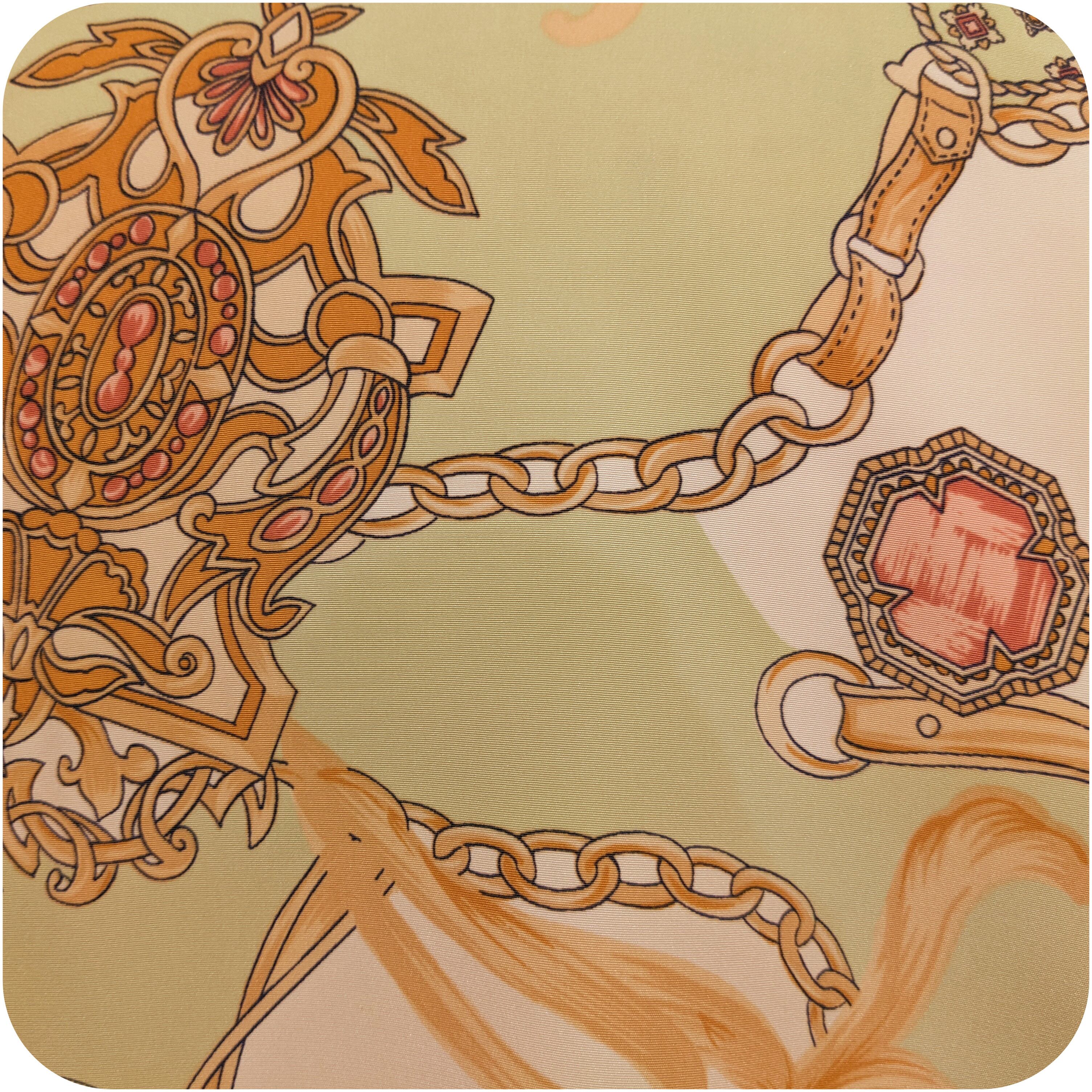 モードなパステルグリーン×イエローベージュのスカーフ柄ブラウス