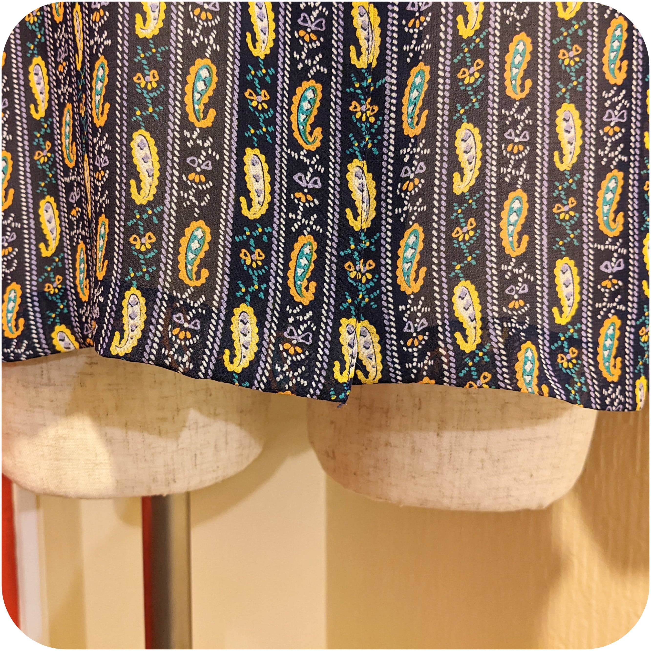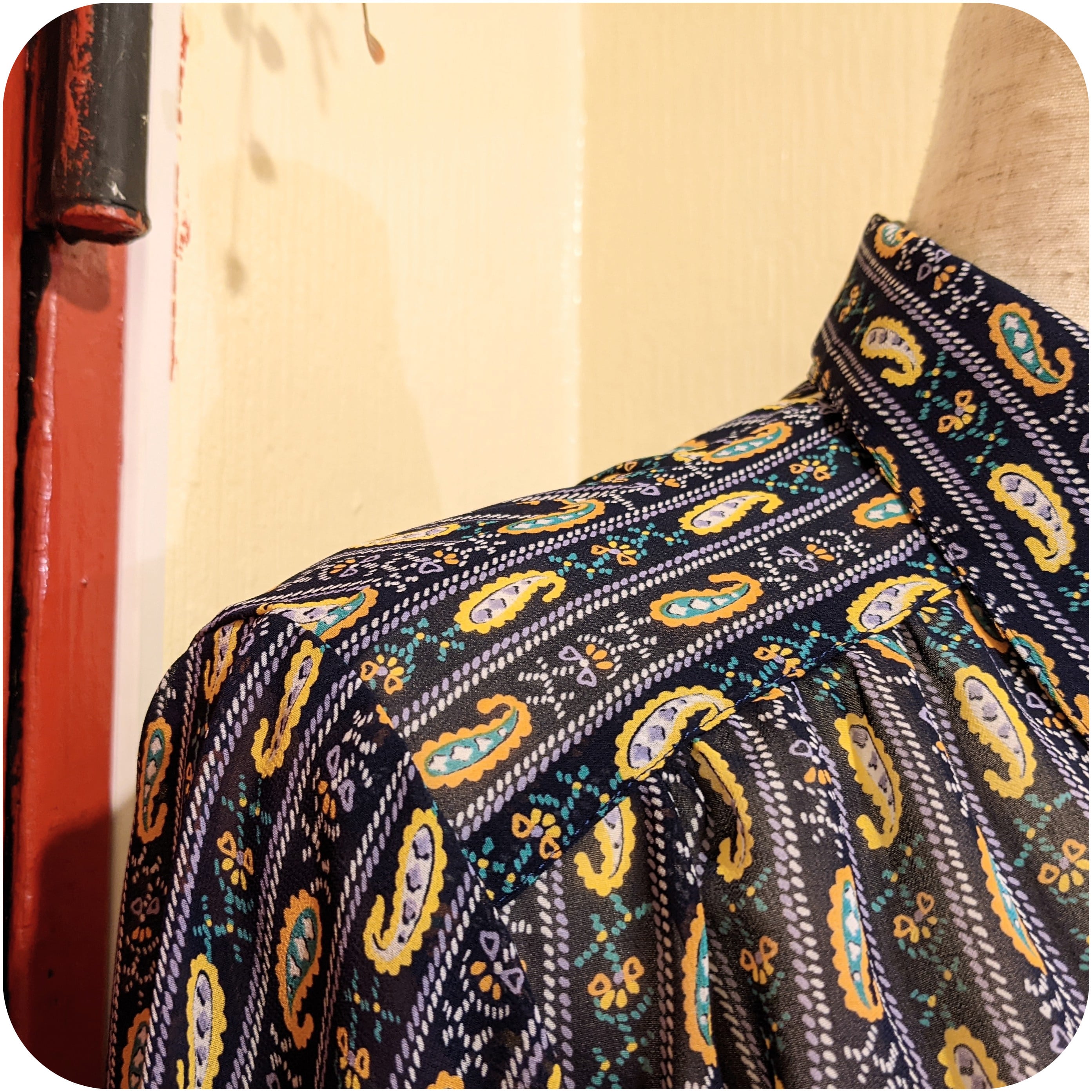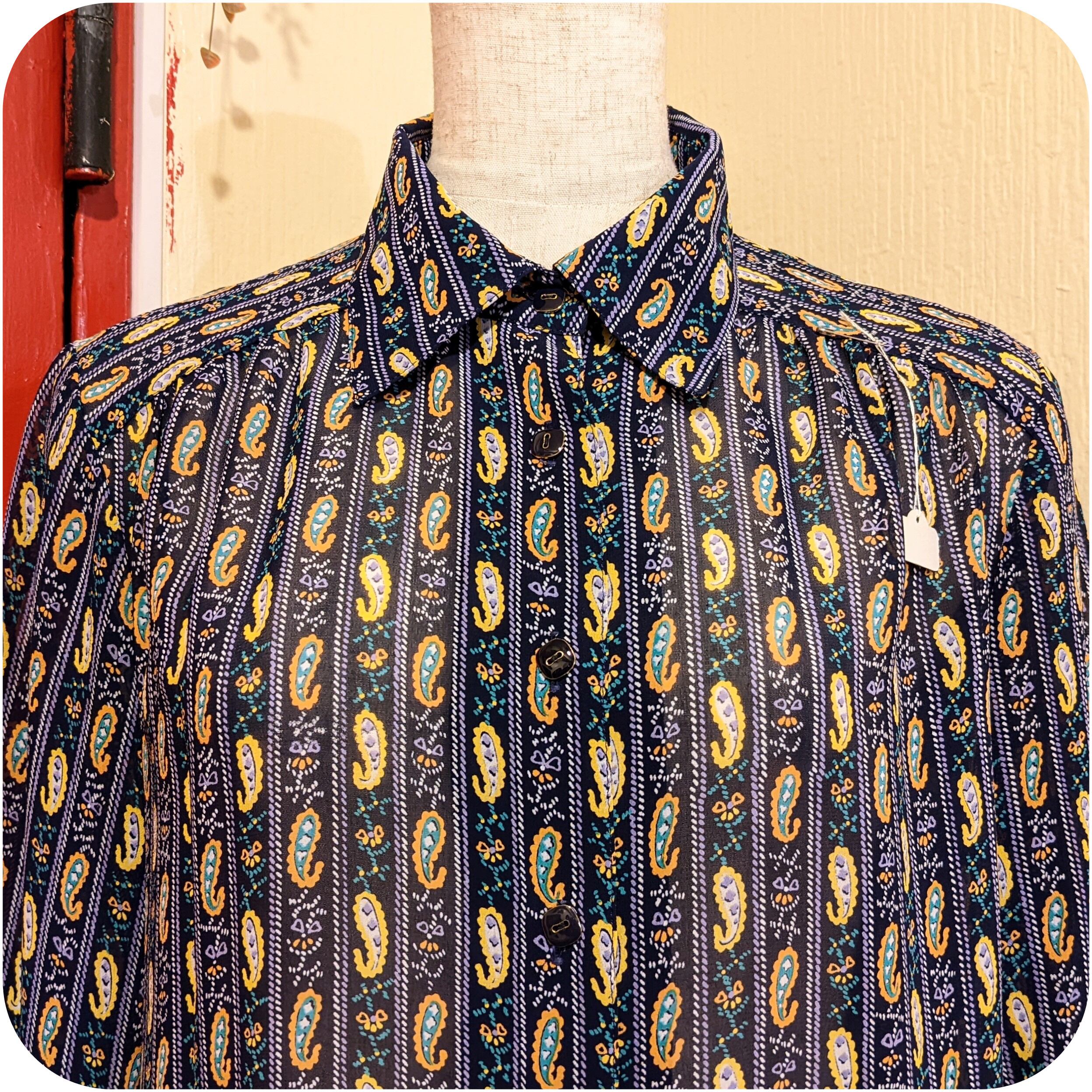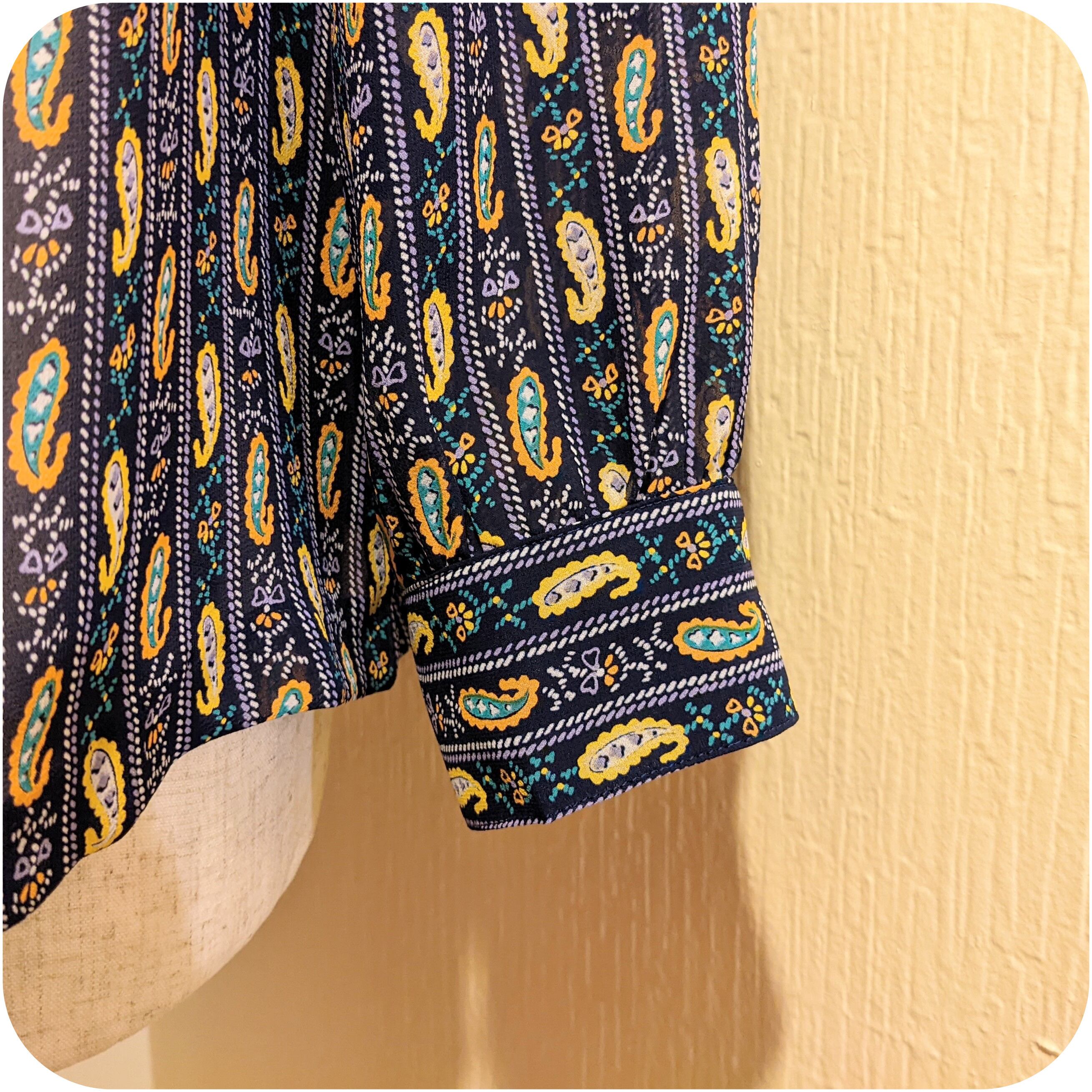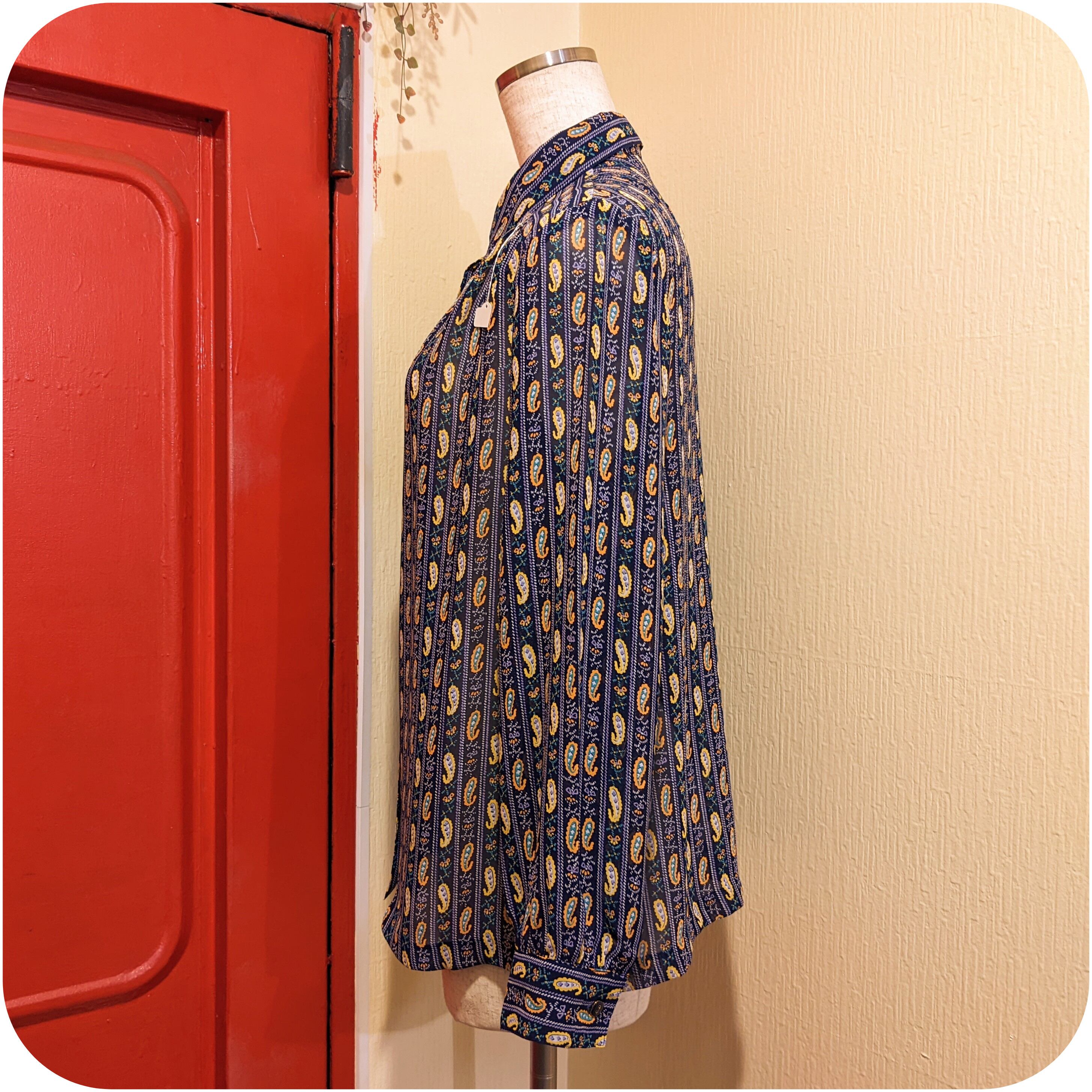 レトロなネイビー×オレンジ×イエローのペイズリー柄シフォンブラウスです。