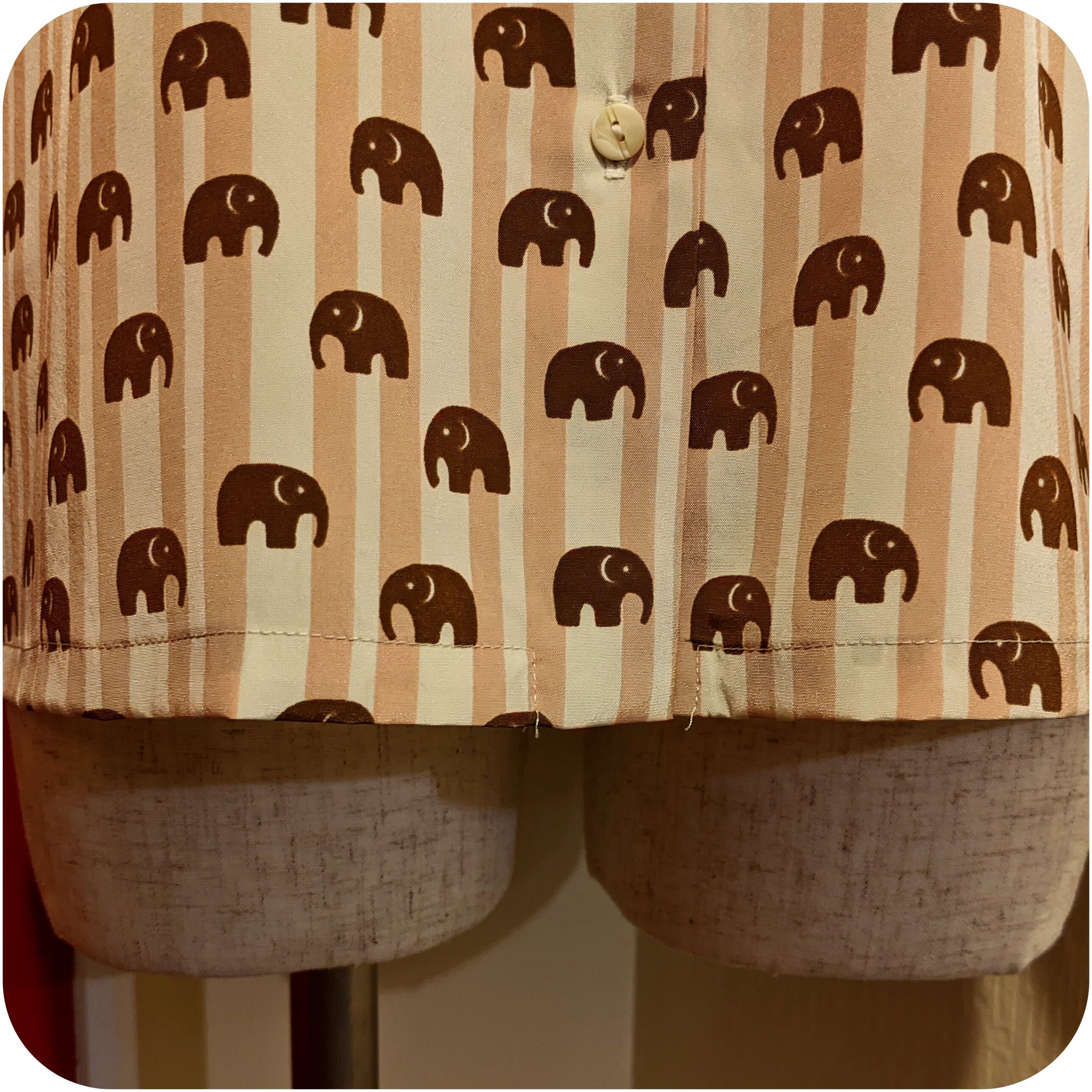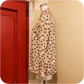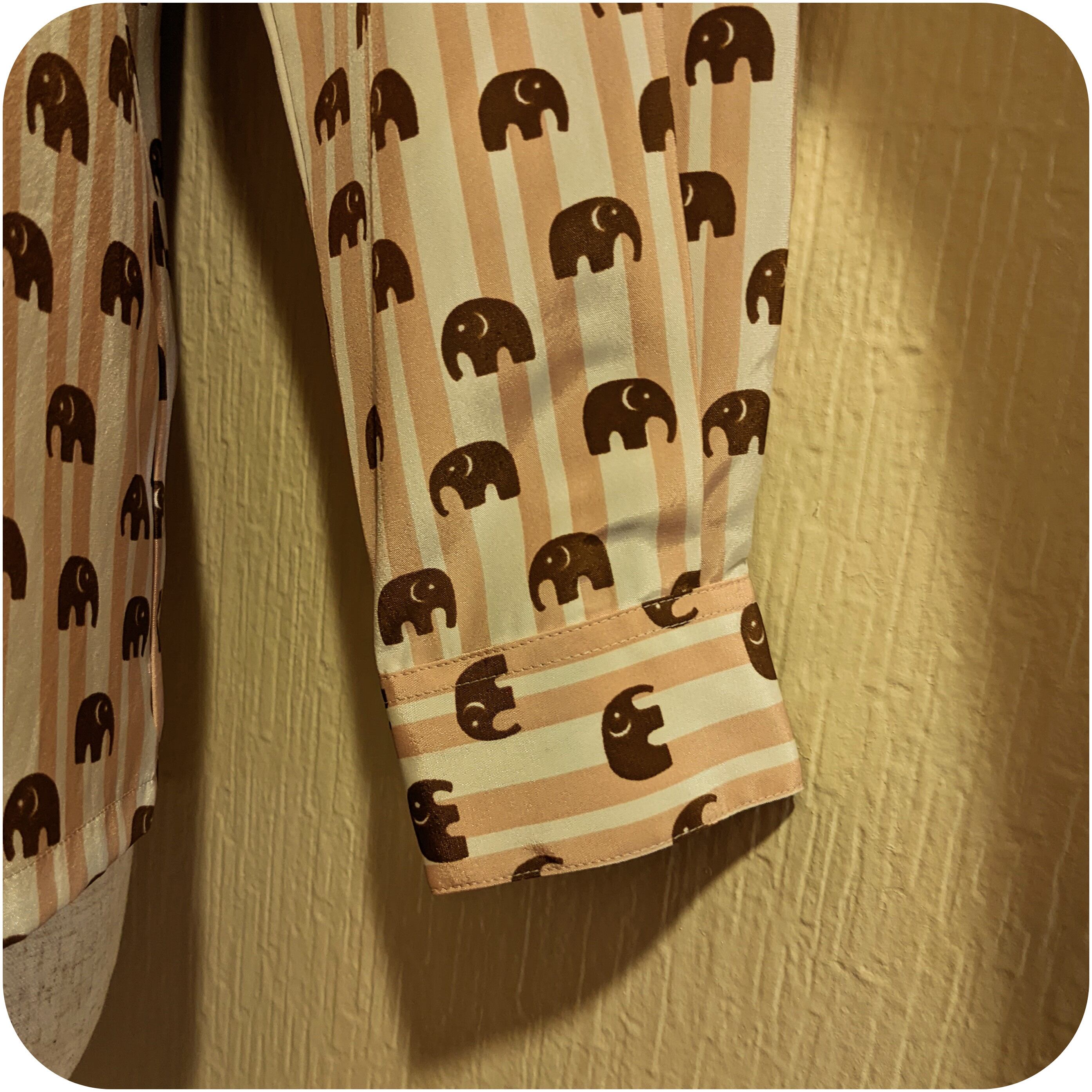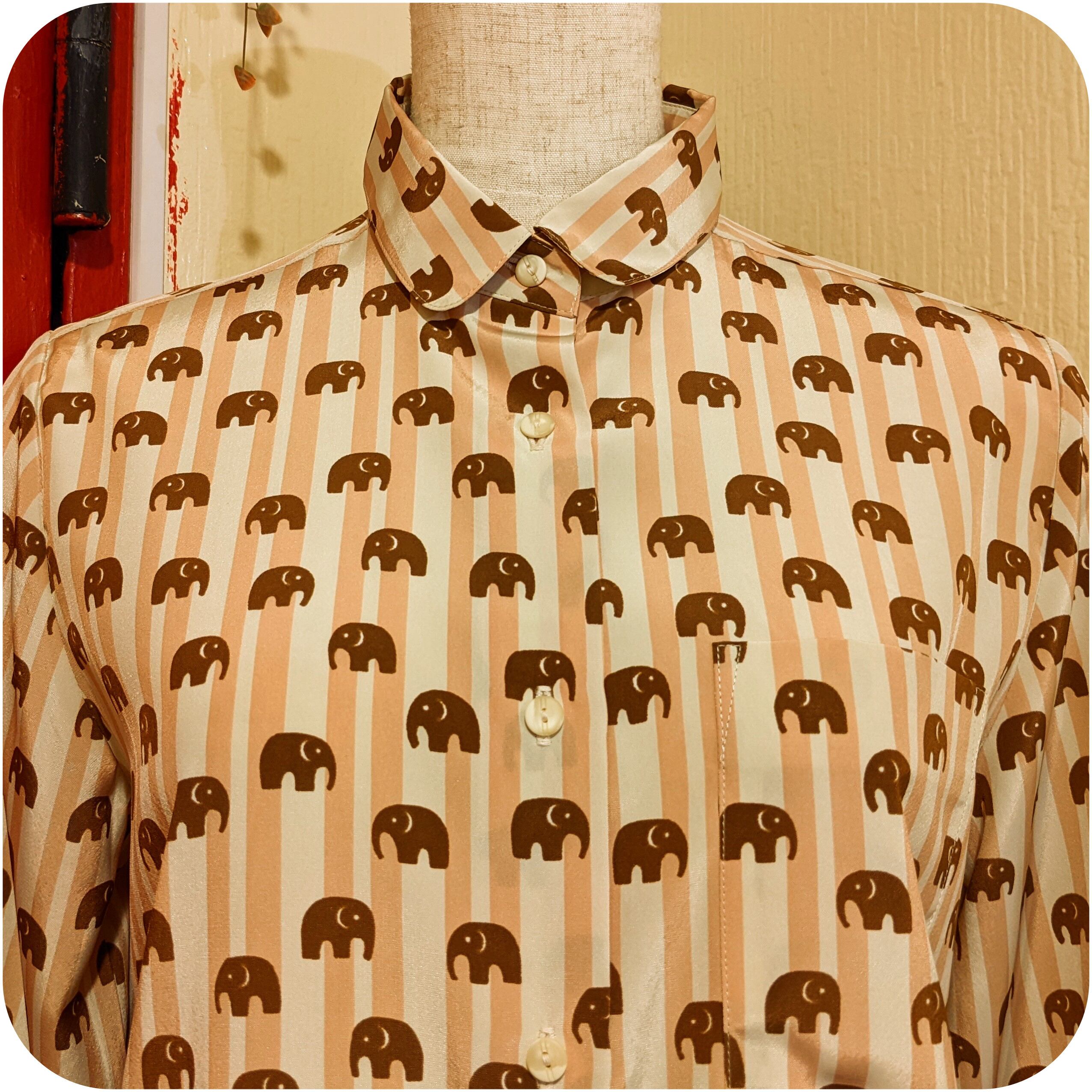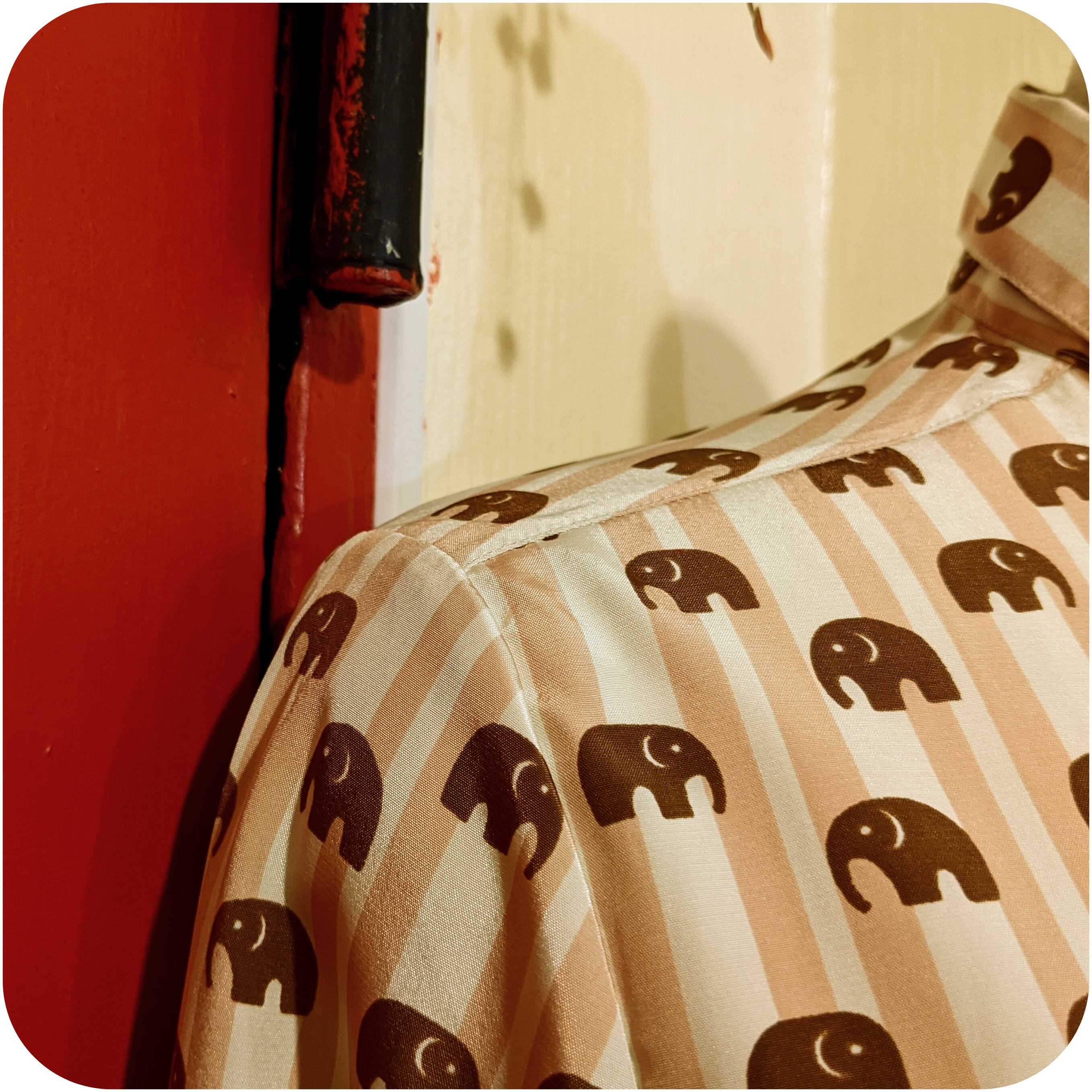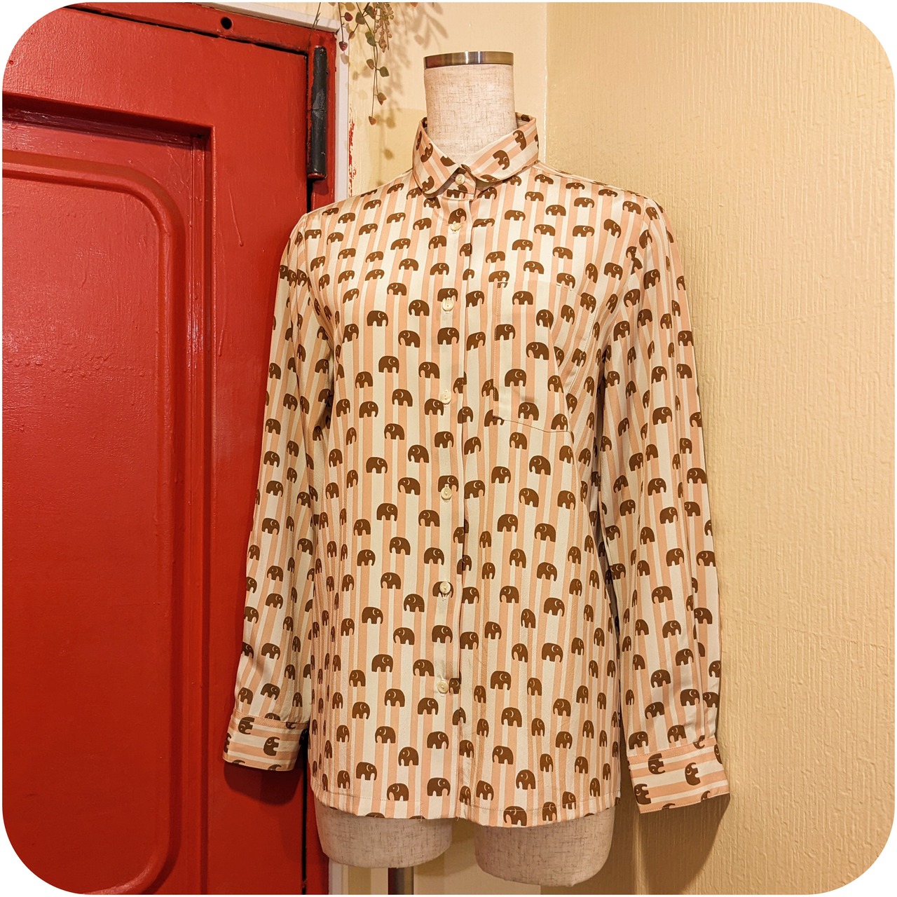 レトロなイエローベージュ×ホワイト×ブラウンのエレファント柄ブラウスです。