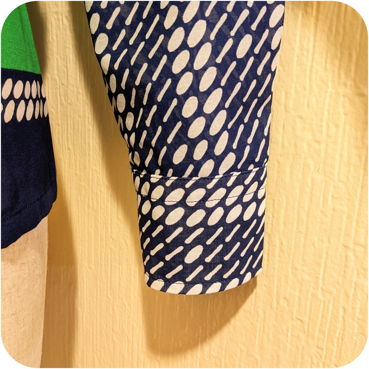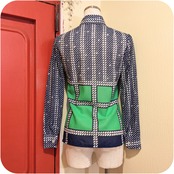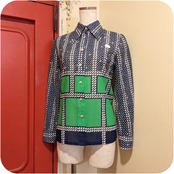 レトロなネイビー×グリーン×ホワイトのパネル柄ブラウスです。