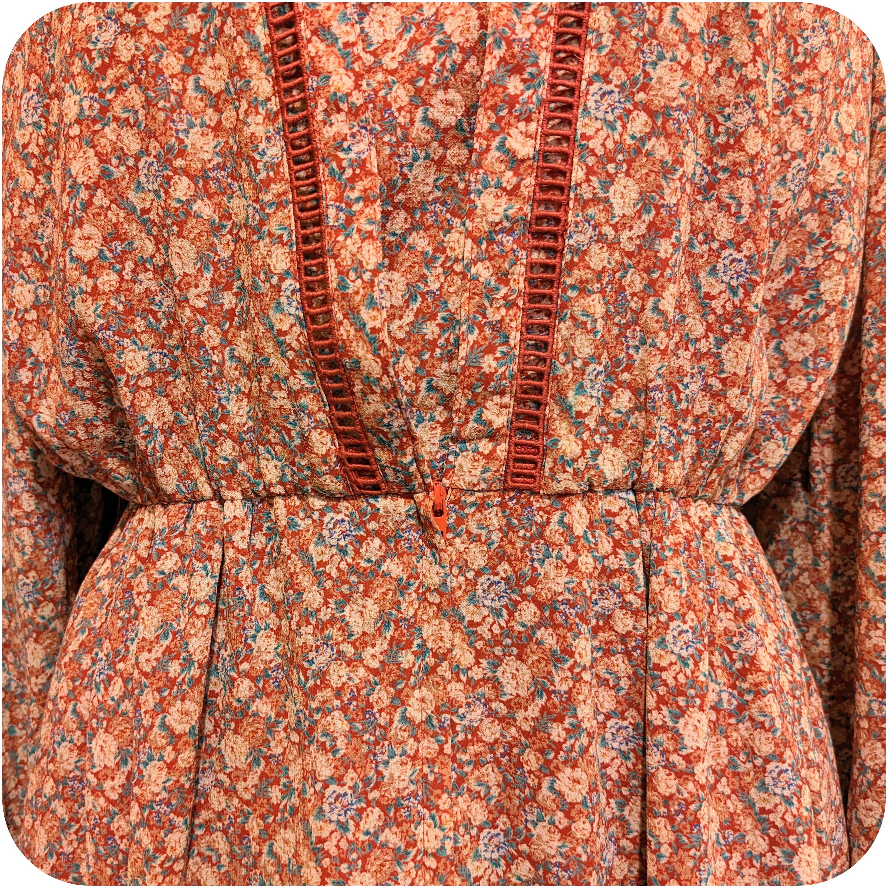 どこかノスタルジックな雰囲気が漂う優しい色合いのフラワープリントと、フロントにあしらわれたレトロなハシゴレースがとっても素敵。
