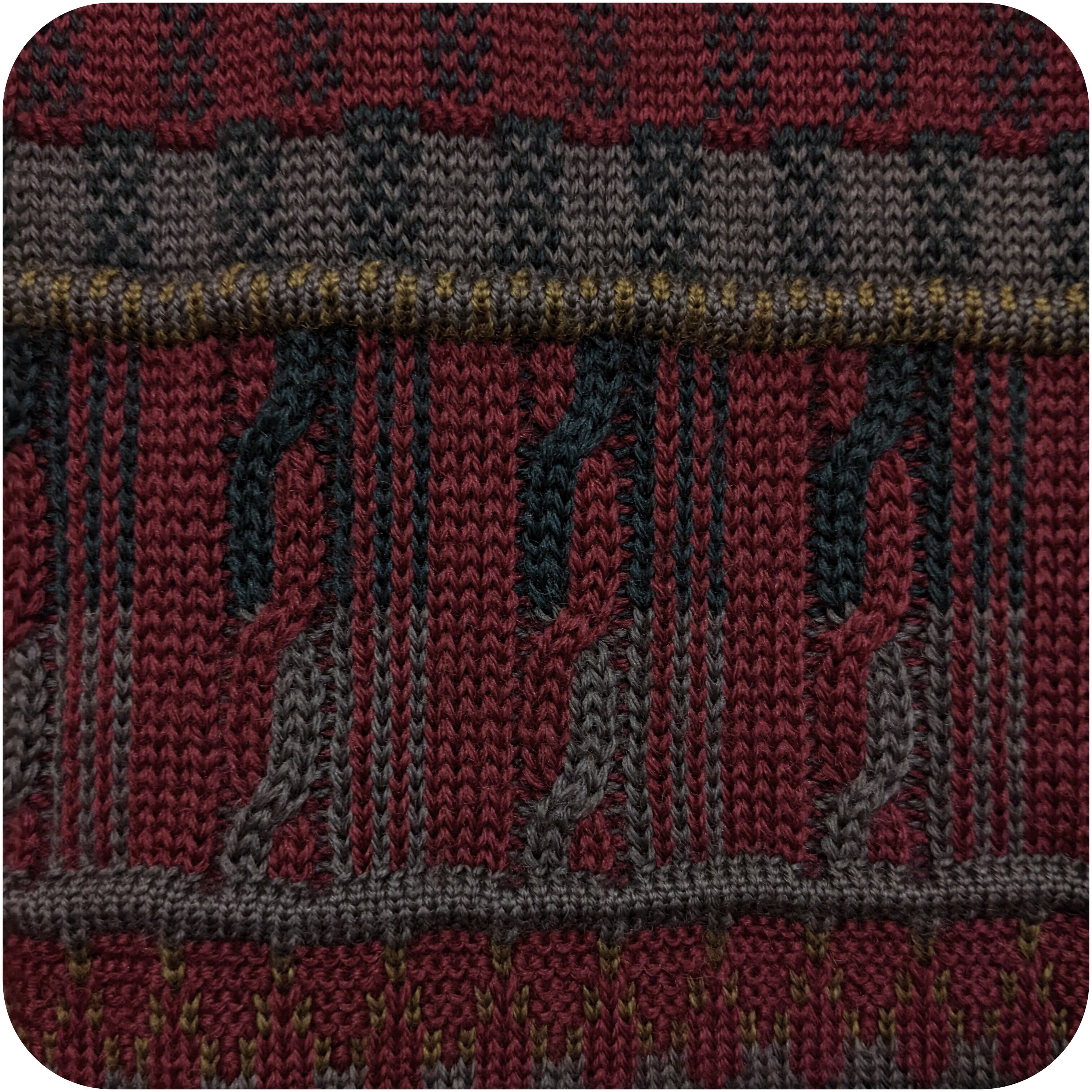 モードなボルドー×グレー×ブルーグリーンのイレギュラー柄ニット