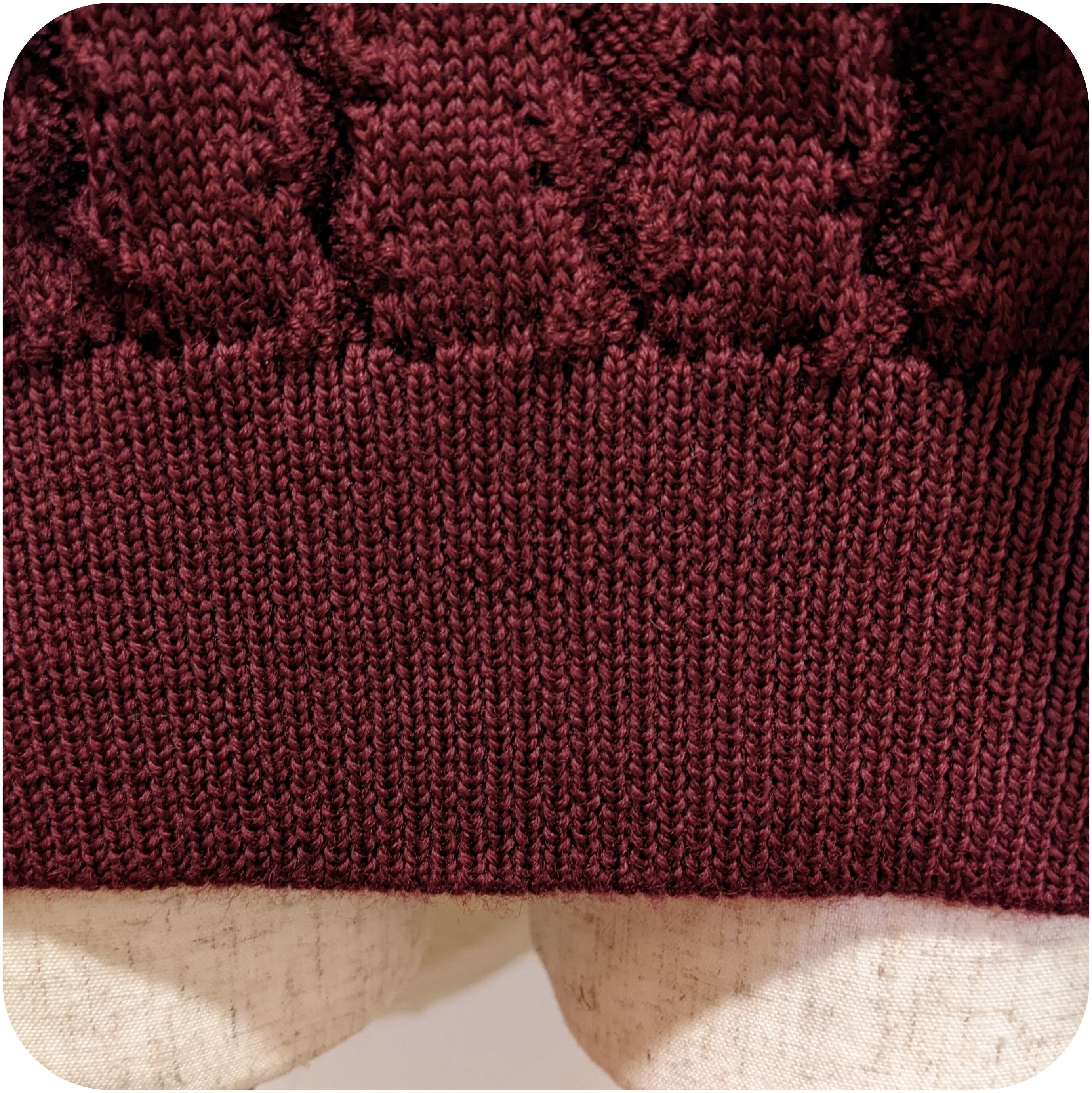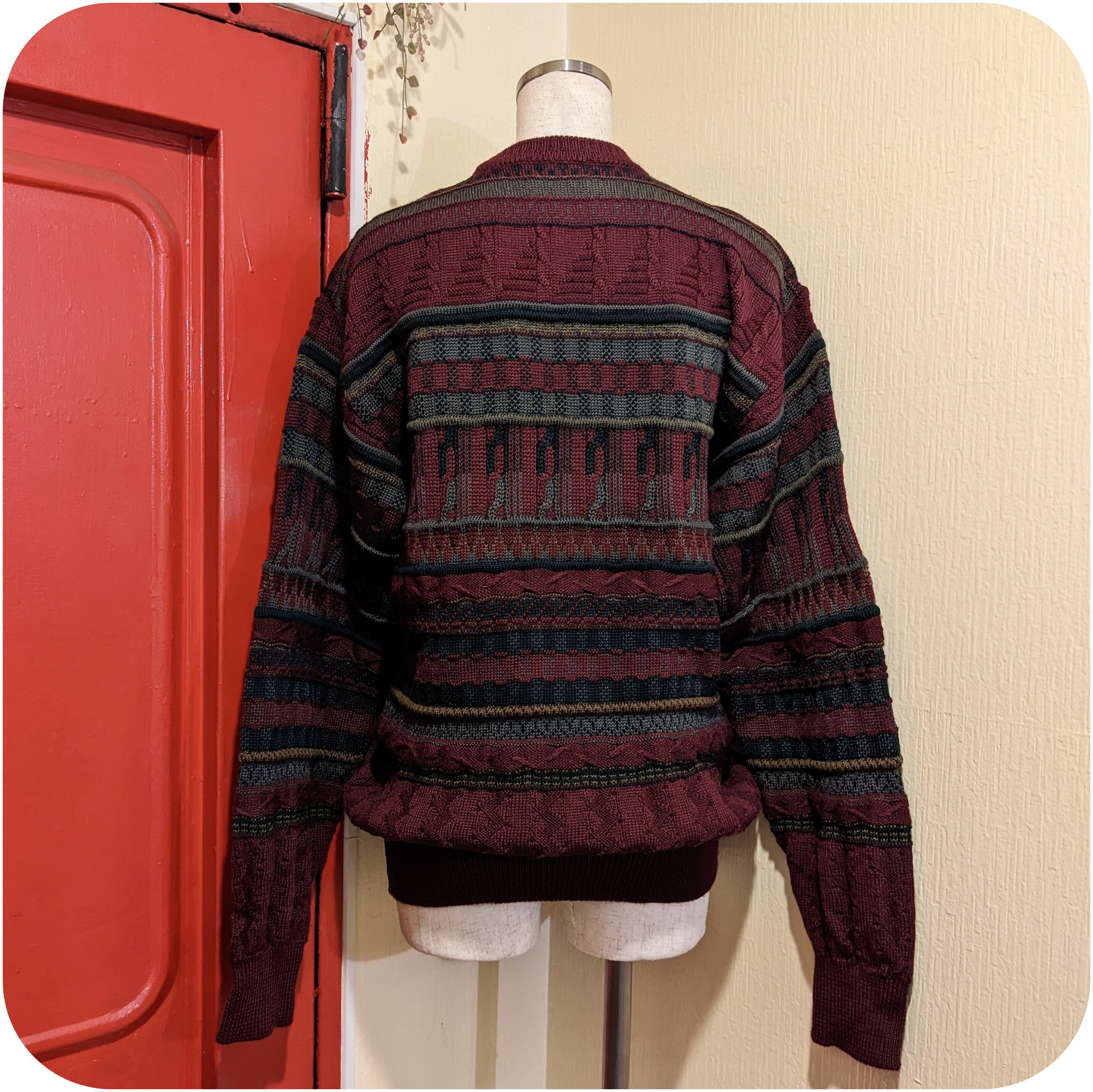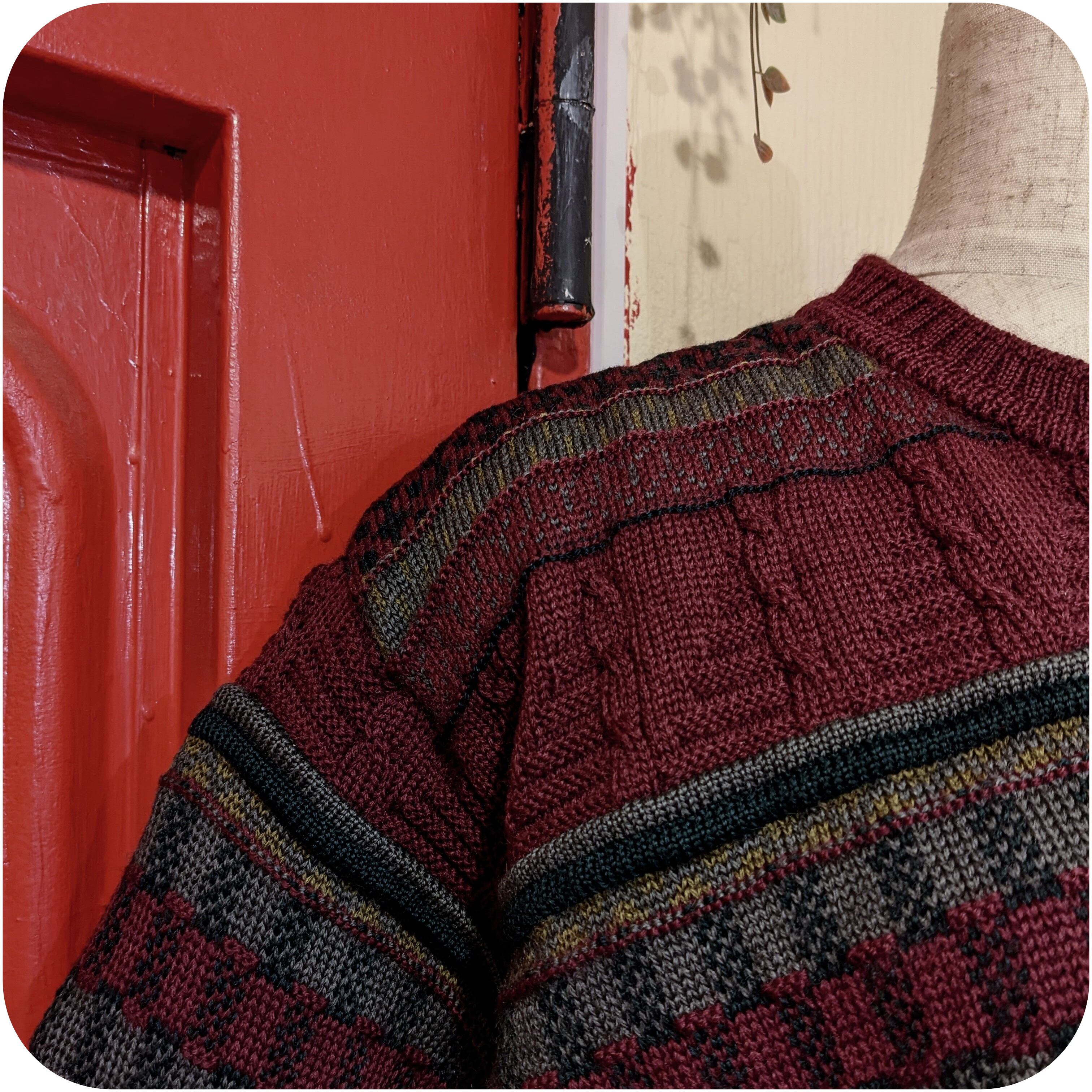 モードなボルドー×グレー×ブルーグリーンのイレギュラー柄ニットです。