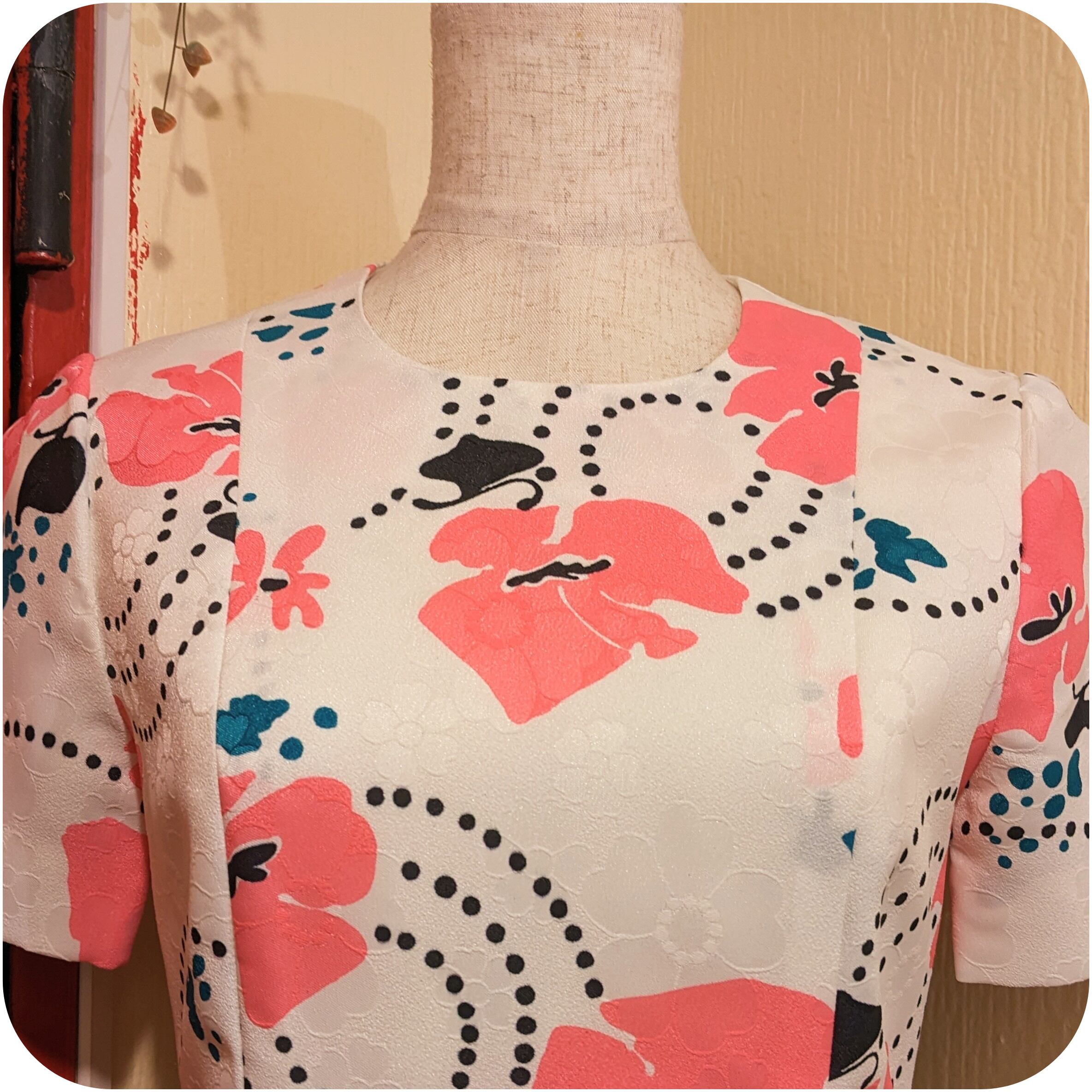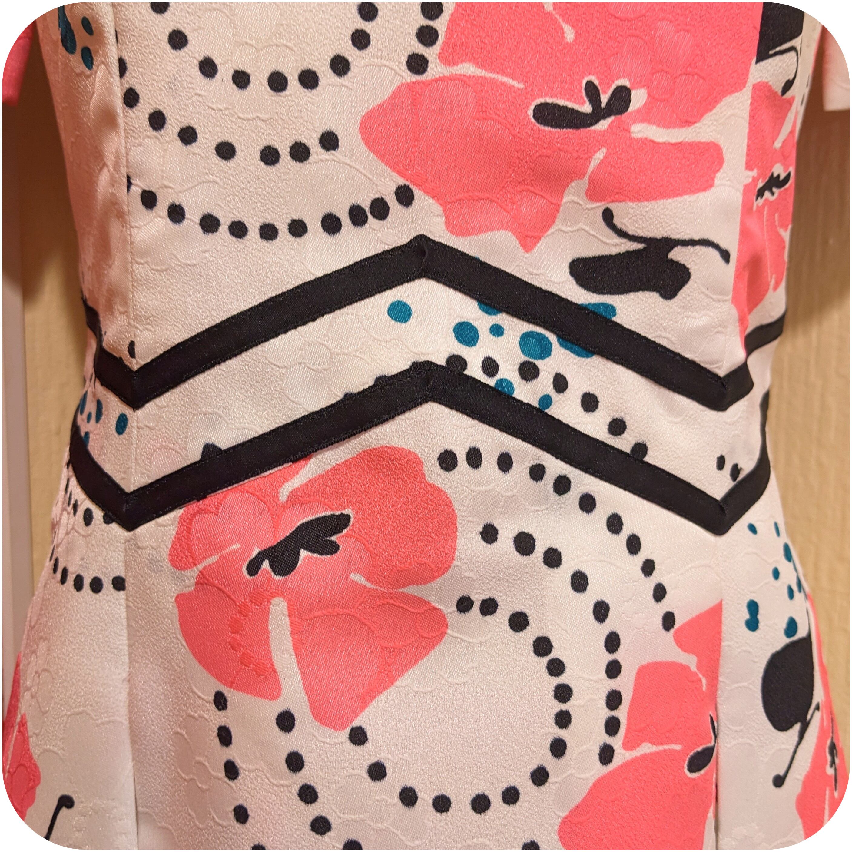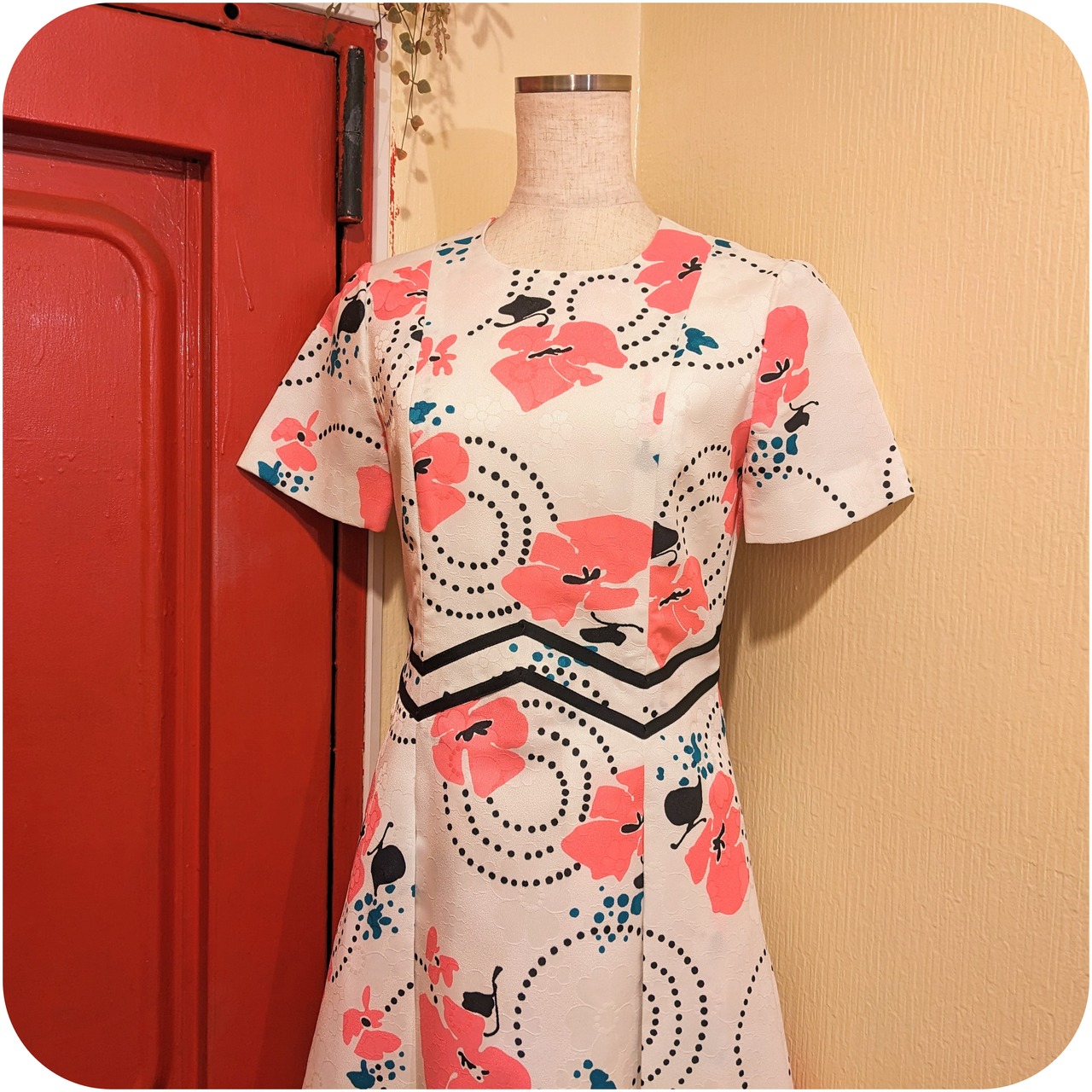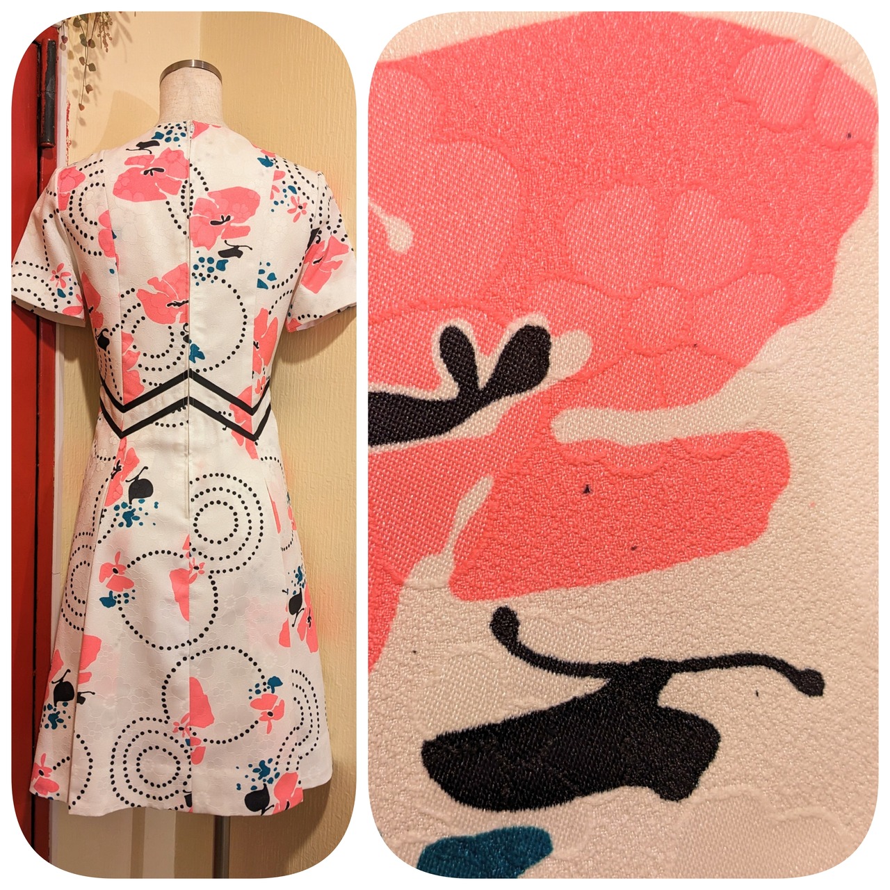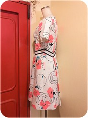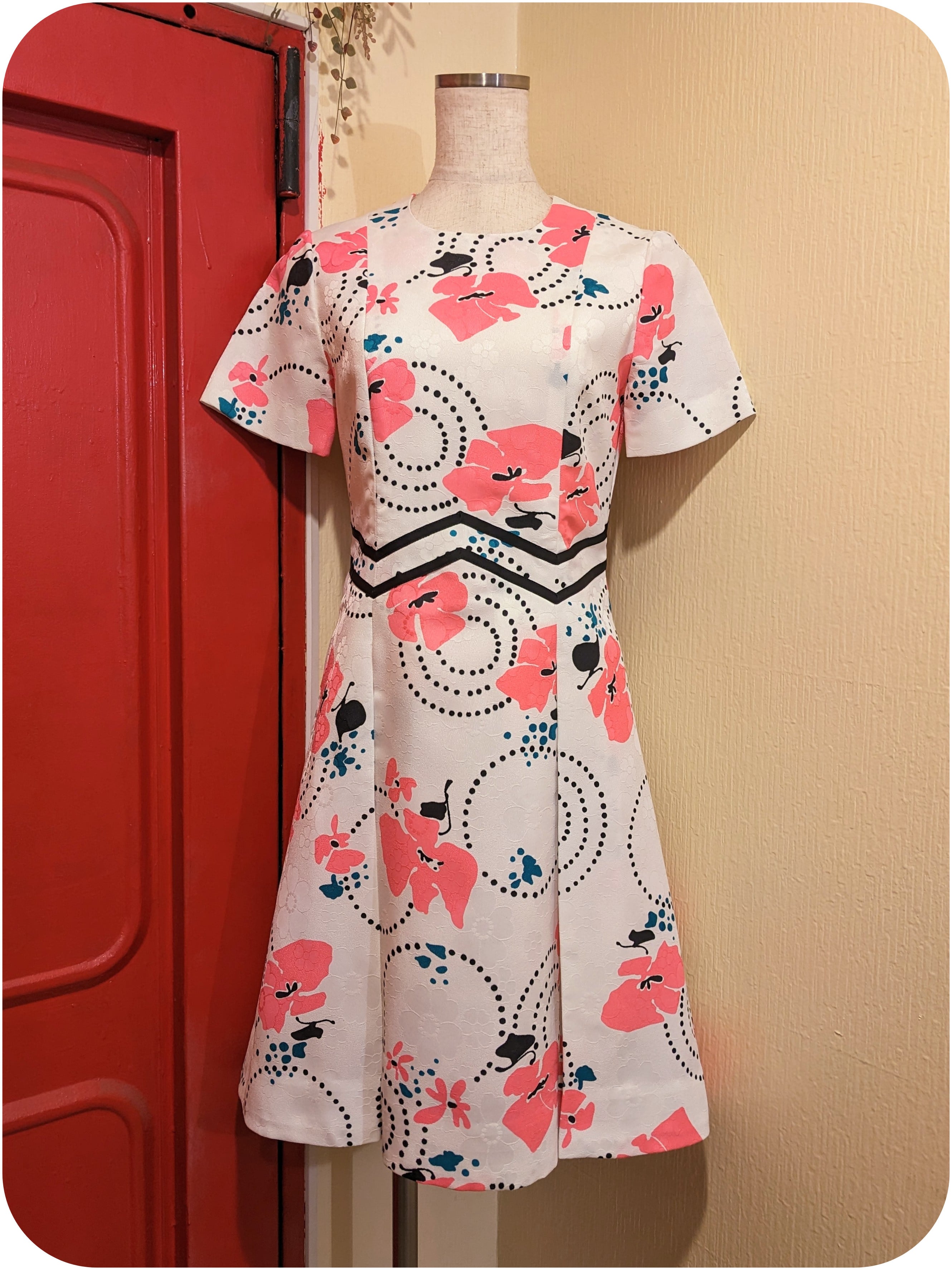 レトロなホワイト×ピンク×ブラックのフローラル柄ボックスプリーツワンピースです。