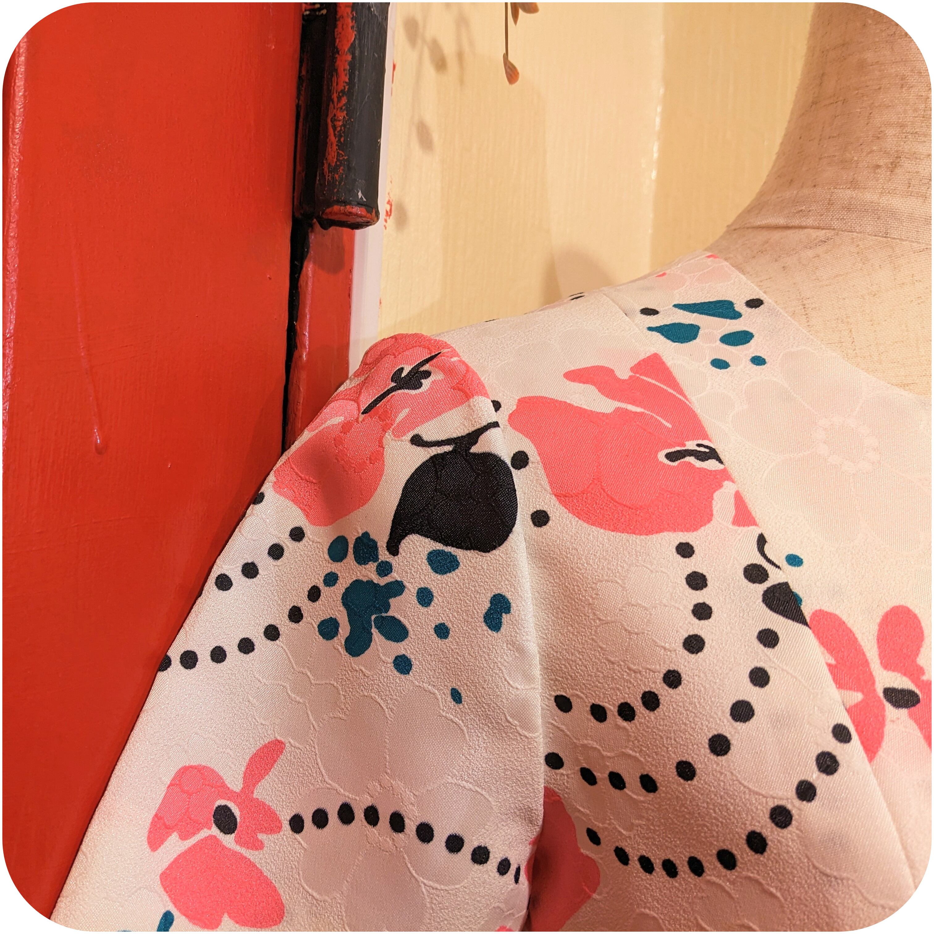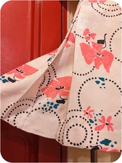 白地の繊細なフローラルモチーフが織り込まれた上にさらにカラフルなフローラル柄がプリントされた贅沢なマテリアルと、歩くたび美しく広がるボックスプリーツデザインがとっても素敵。