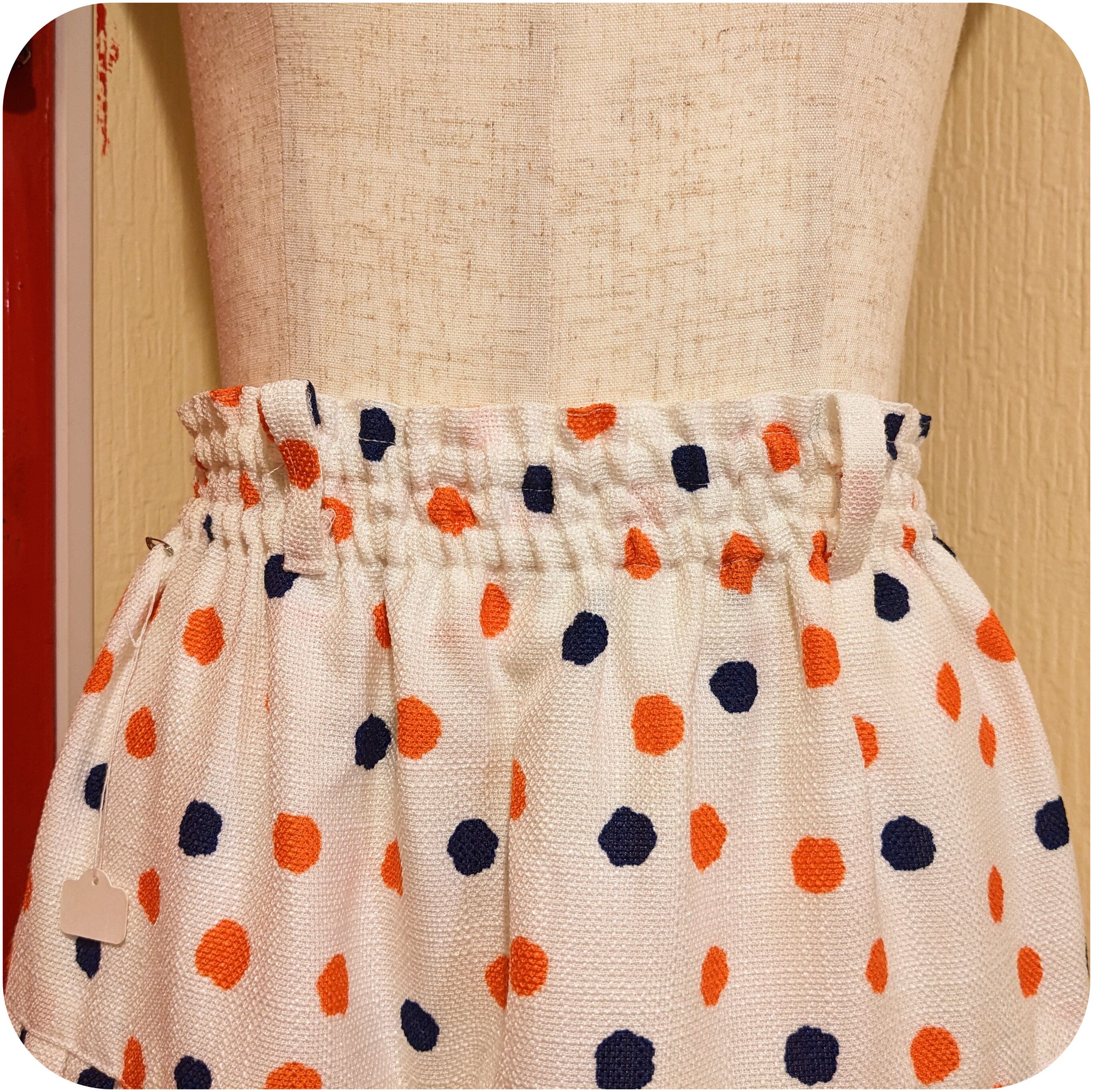 レトロなオフホワイト×バーミリオン×ネイビーのドット柄プリーツスカートです。