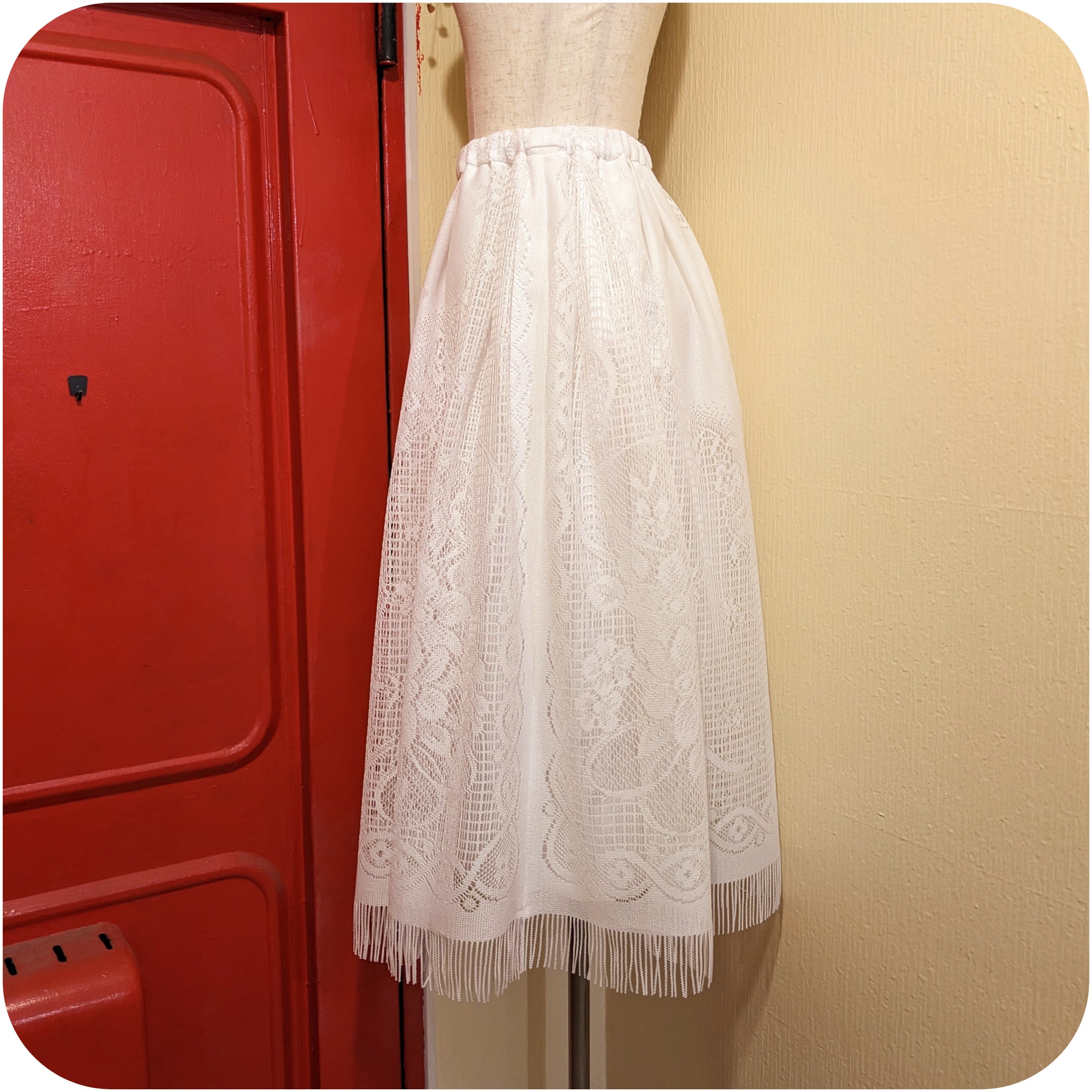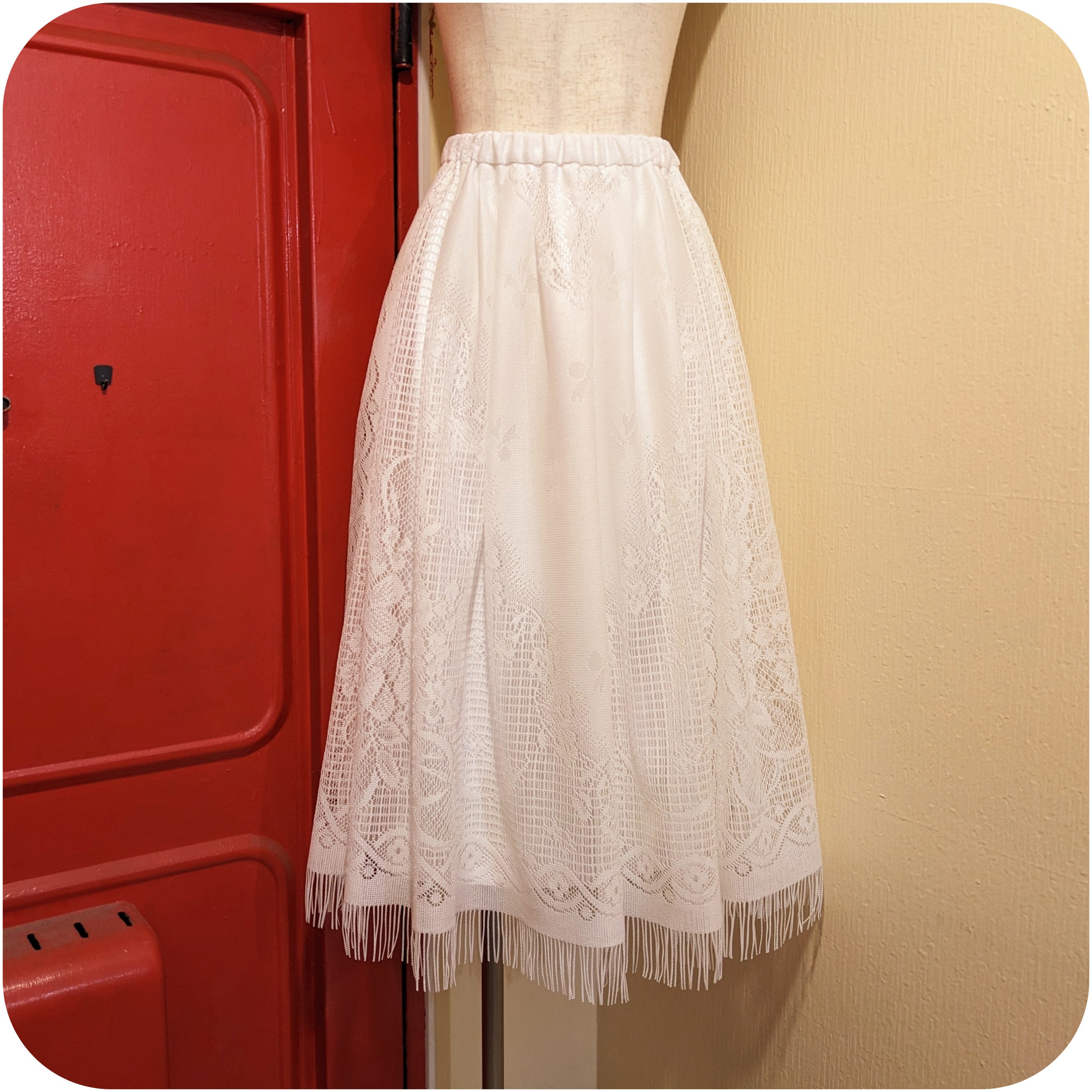 ※こちらのスカートには裏地が付いておりますが、白色という特質上、インナーの色が透けやすくなっております。ご着用の際は肌色に近い色など透けにくい色味のインナーをお召しになられますようお勧め致します。