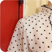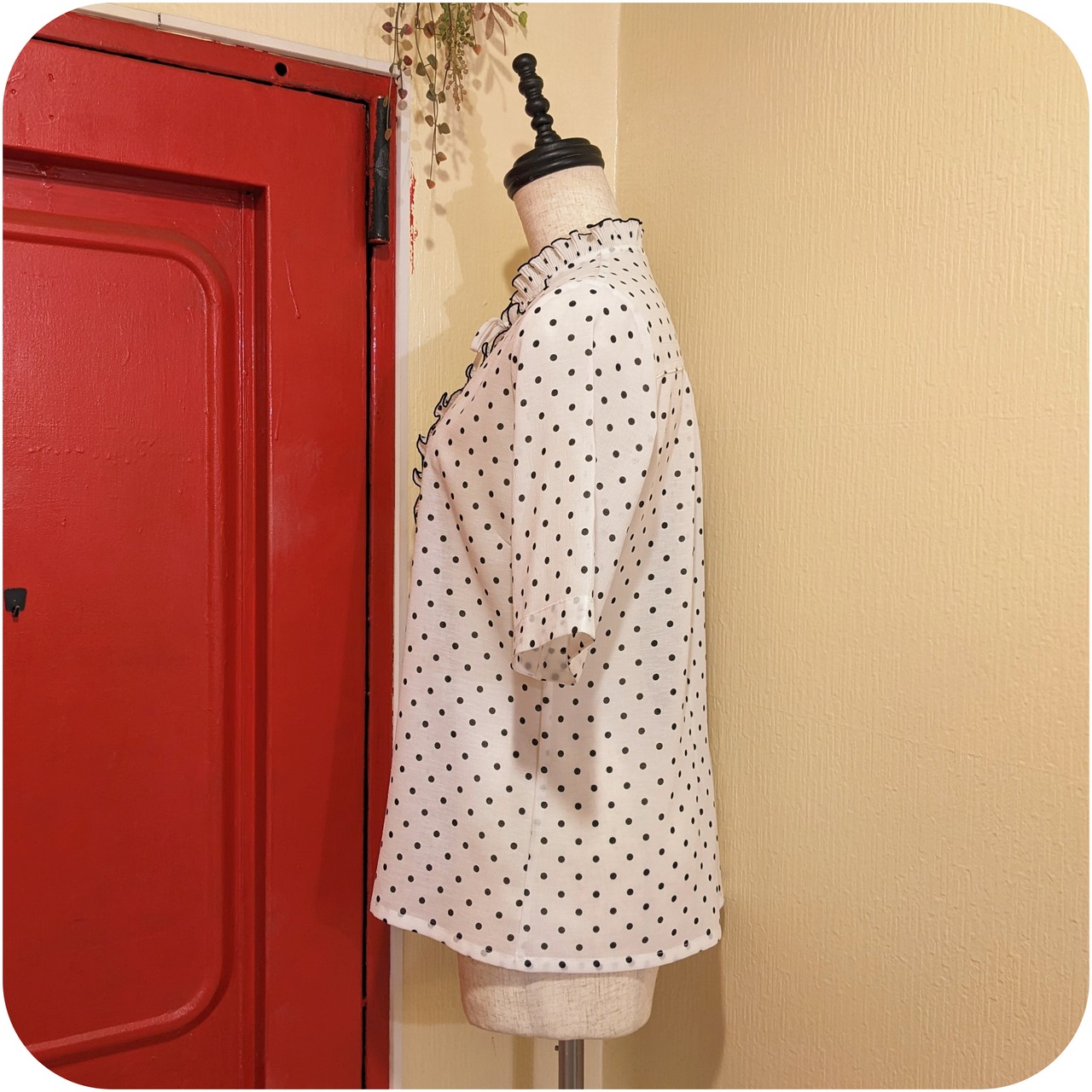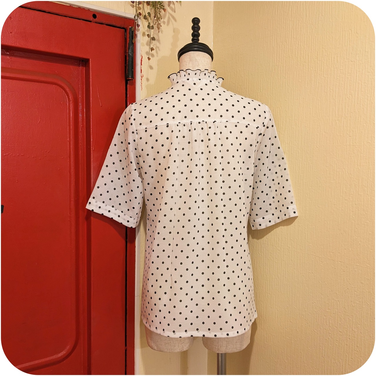 エレガントなホワイト×ブラックのドット柄フリルデザインブラウスです。