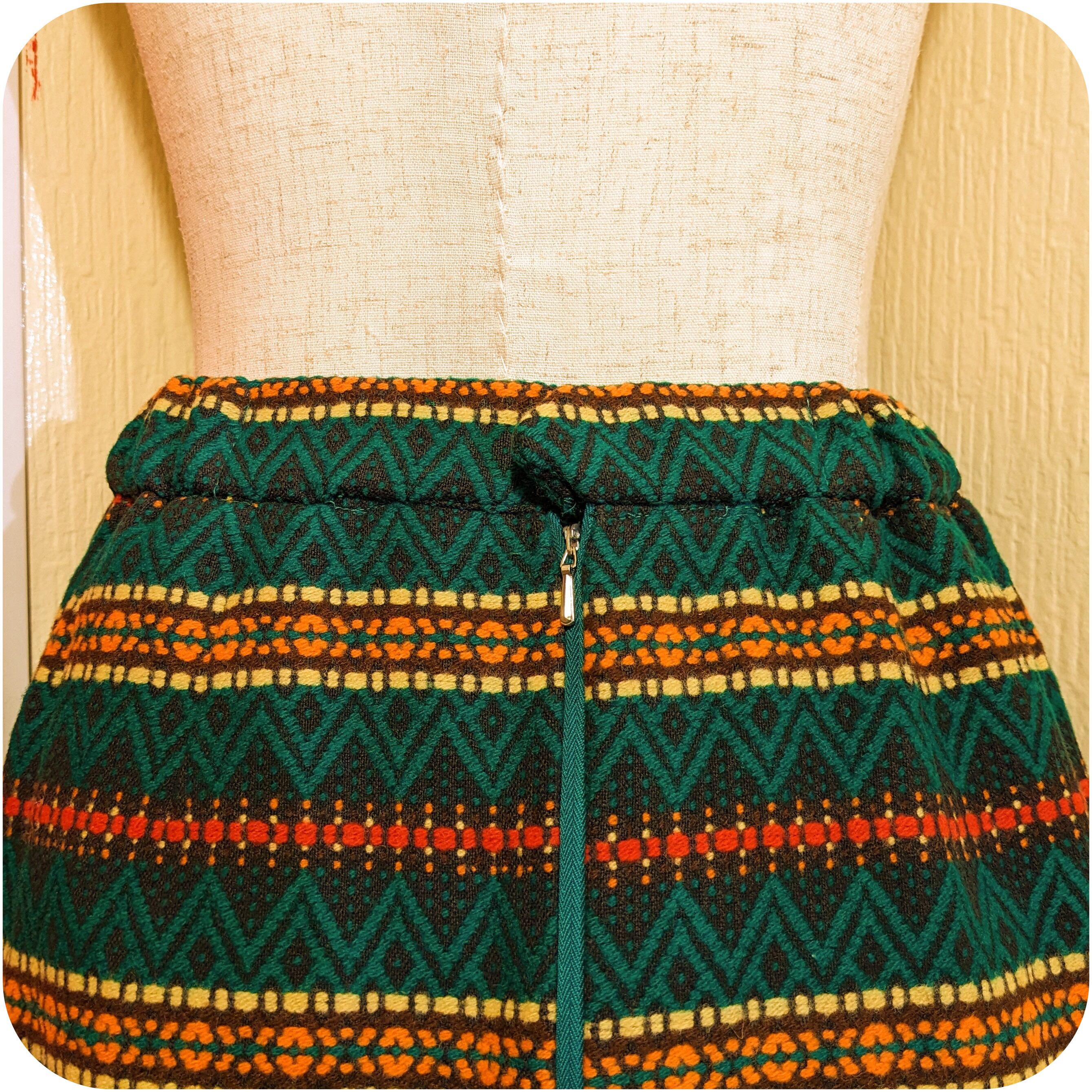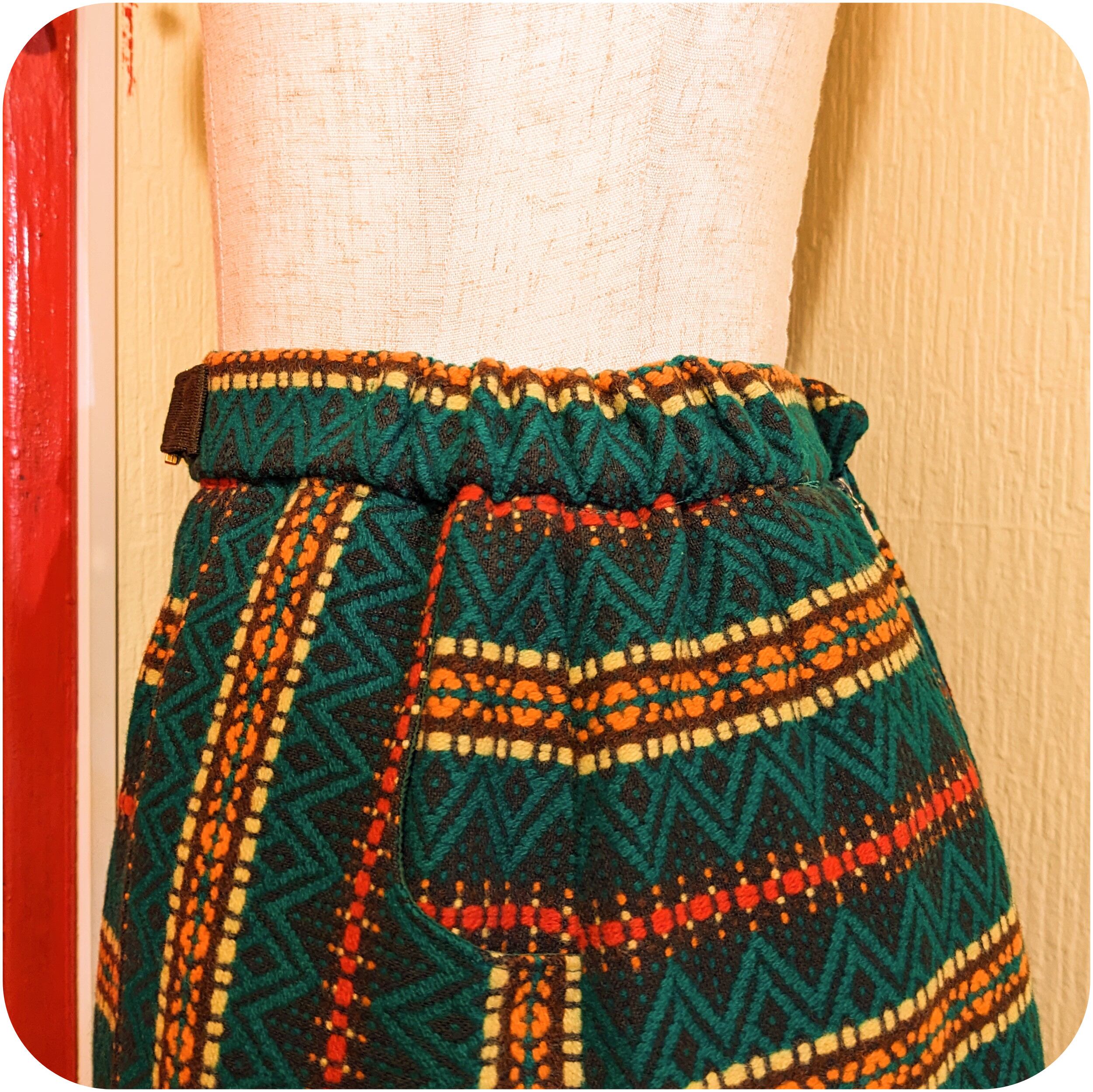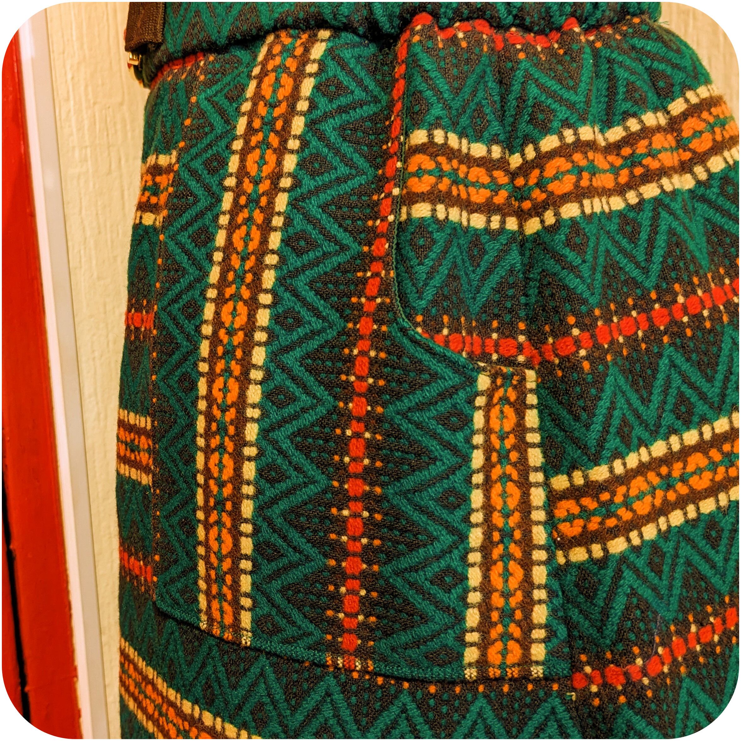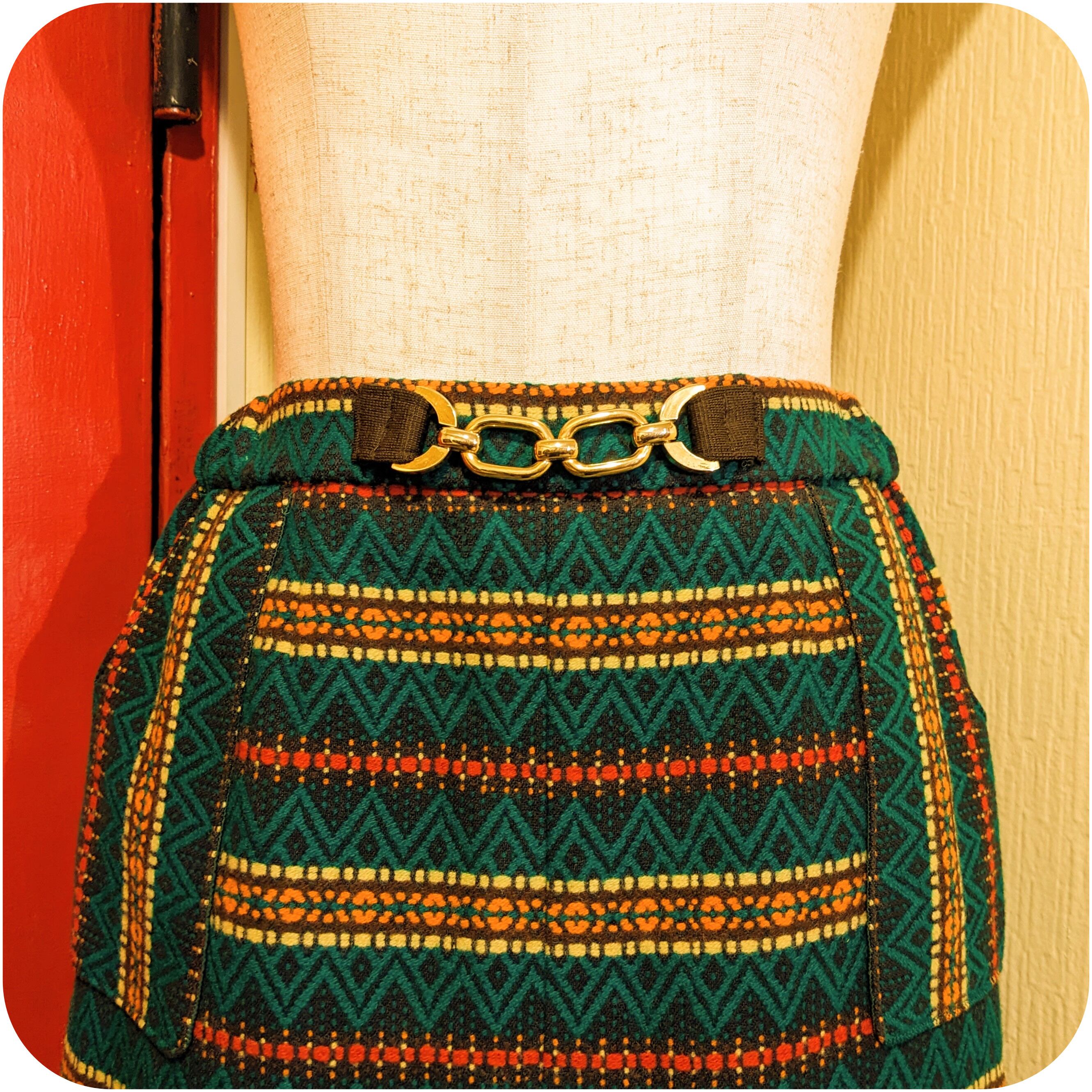 古着ならではの綺麗な色使いの織り柄と、ウエストにあしらわれたゴールドチェーンがとっても素敵。