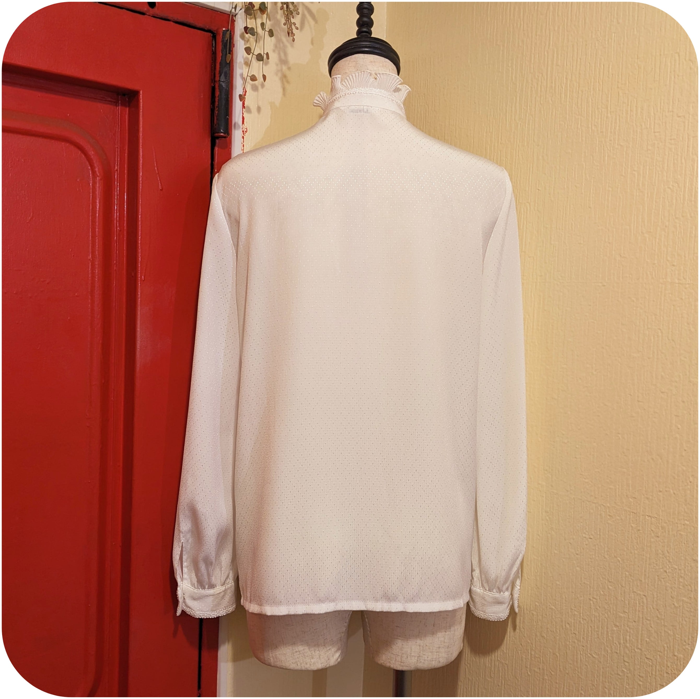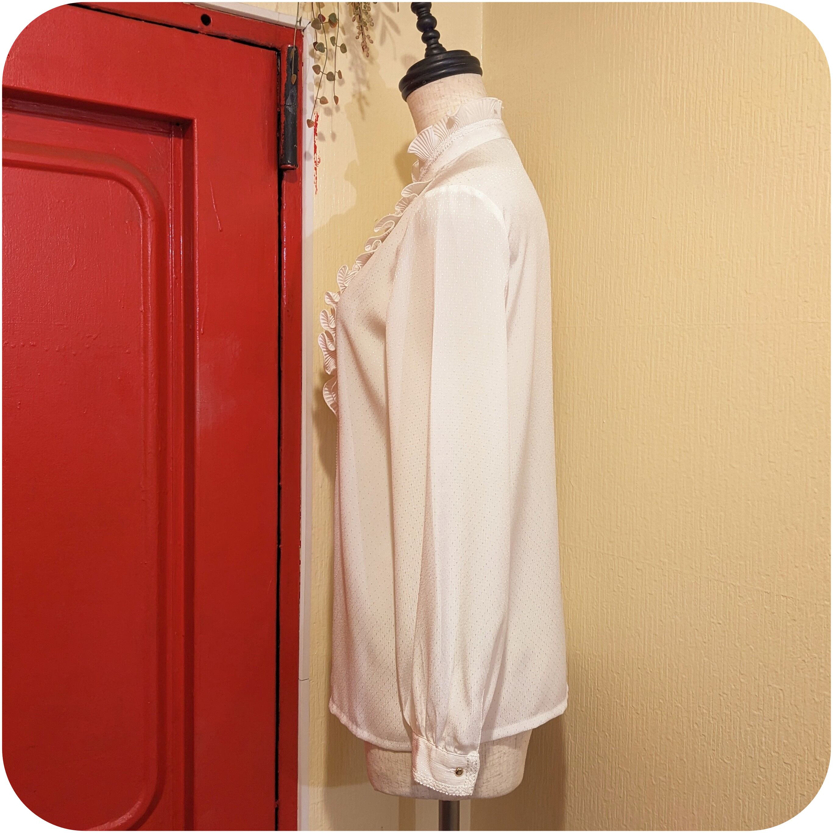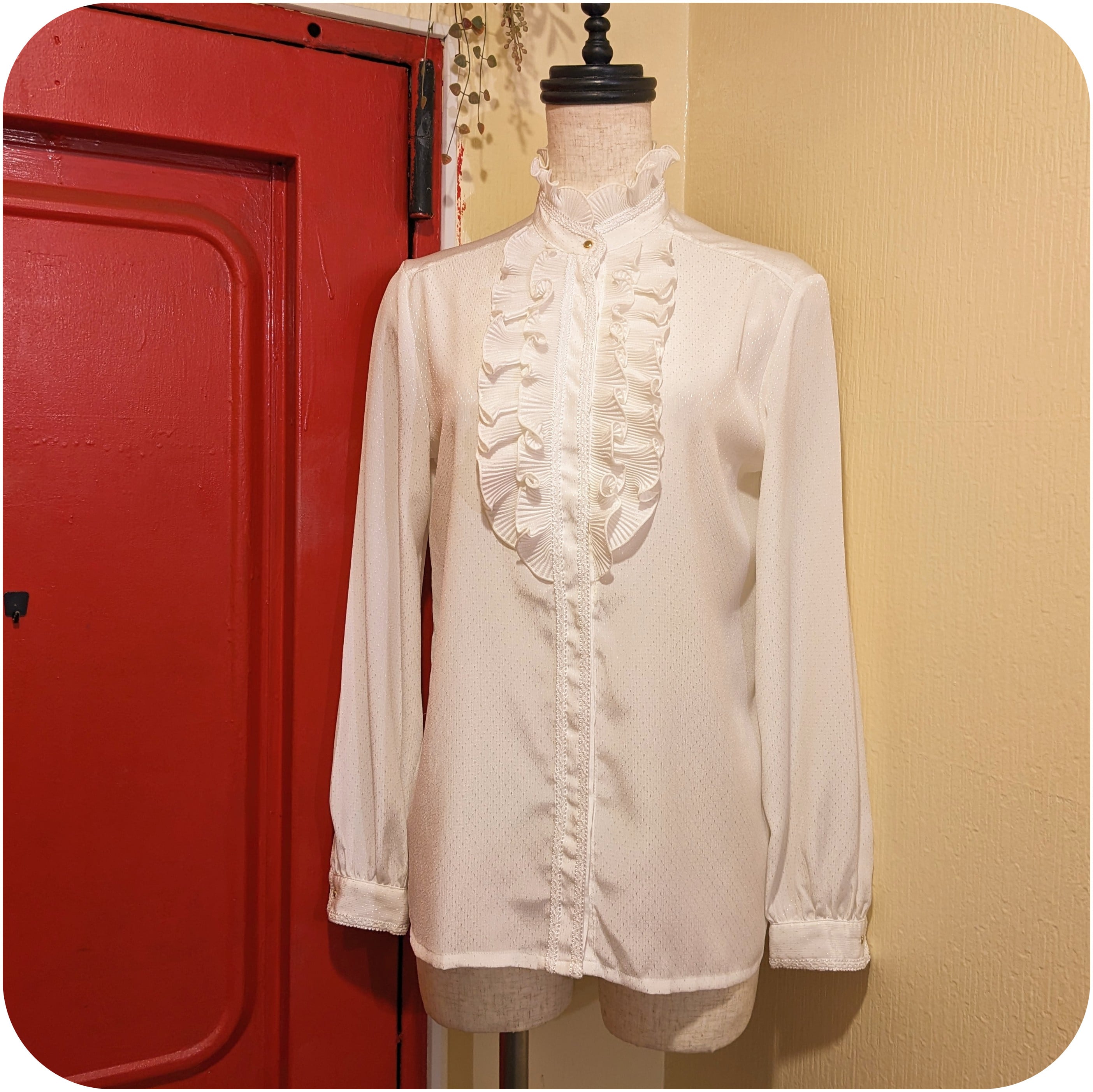 フロントにたっぷりと贅沢にあしらわれたプリーツフリルと、どこかノスタルジックなムードが漂うスタンドカラーデザインがとっても素敵。