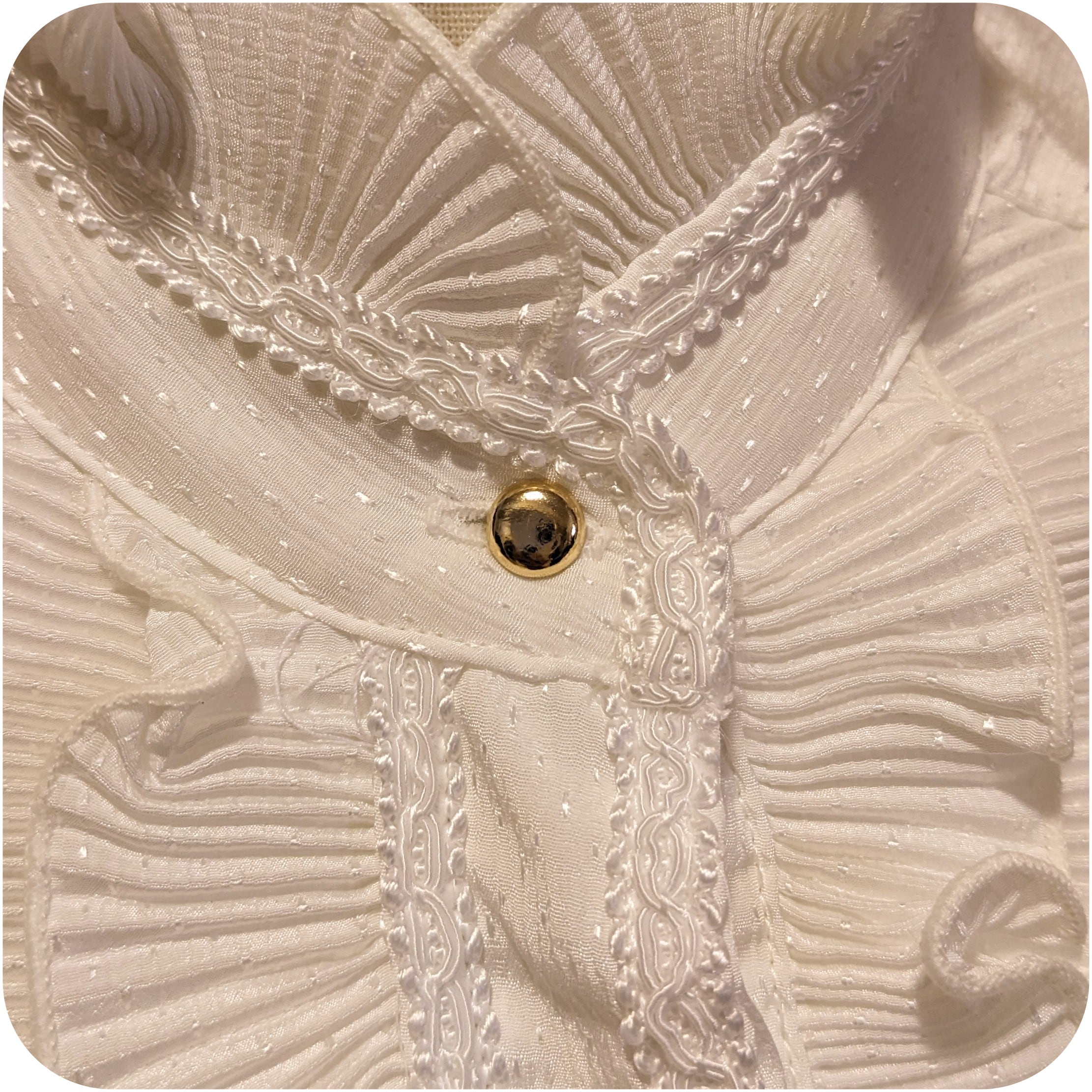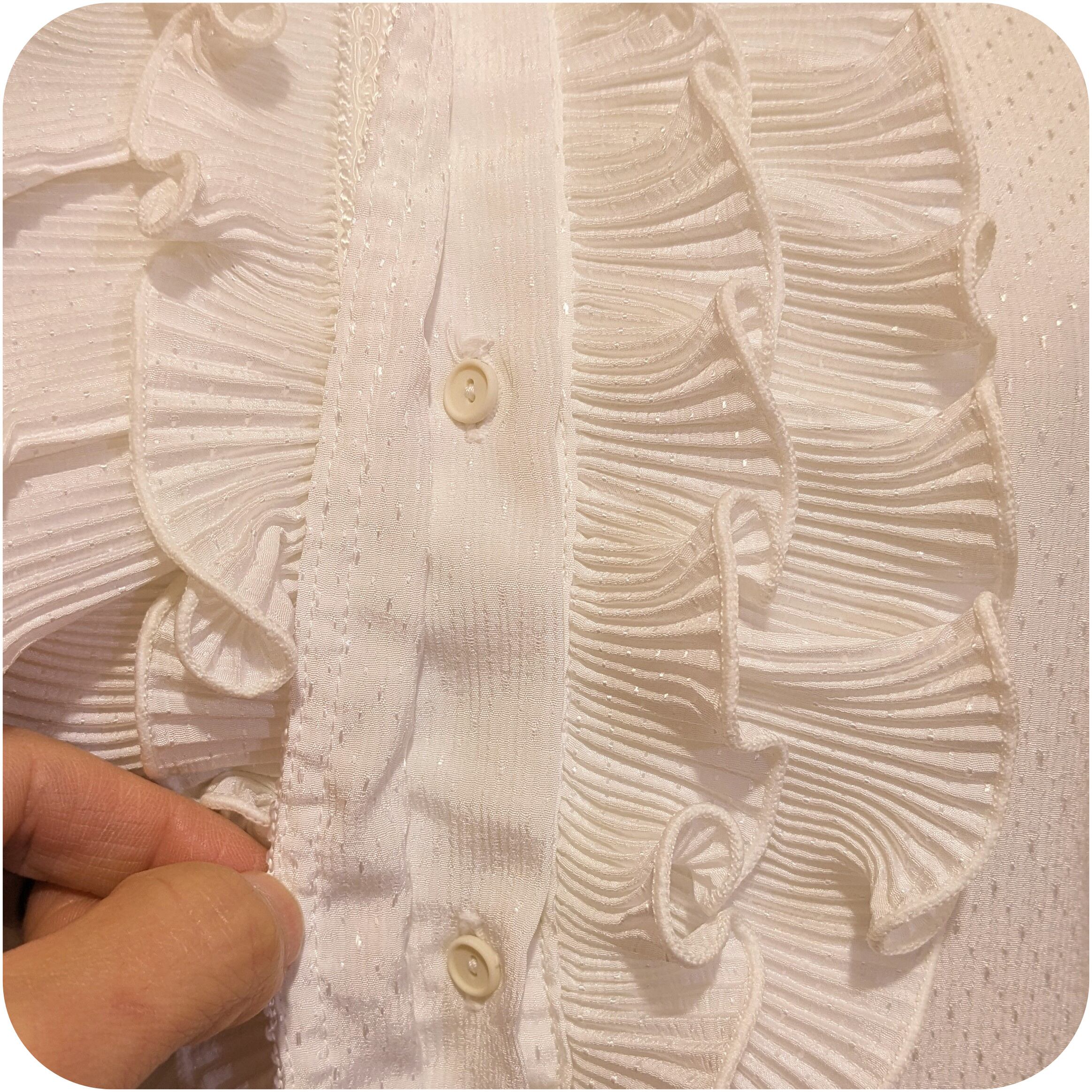 エレガントなホワイトのプリーツフリルデザインブラウスです。