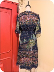 レトロなライトネイビー×ピンク×グリーンのメルヘン柄スリットベルスリーブワンピースです。