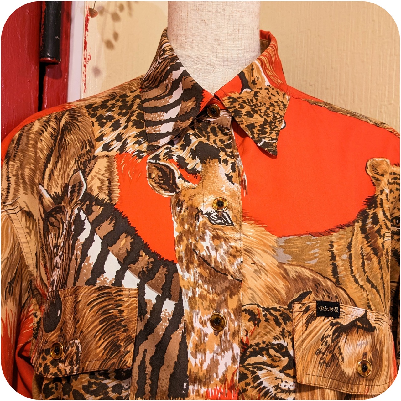 モードなトマトレッド×ライトブラウンのアニマル柄ブラウスです。