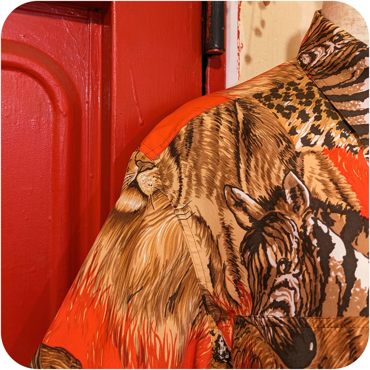 古着ならではのユニークなプリント柄と、肩の落ちたリラックス感のあるシルエットがとっても素敵。