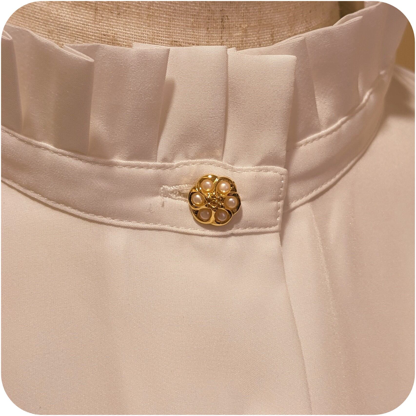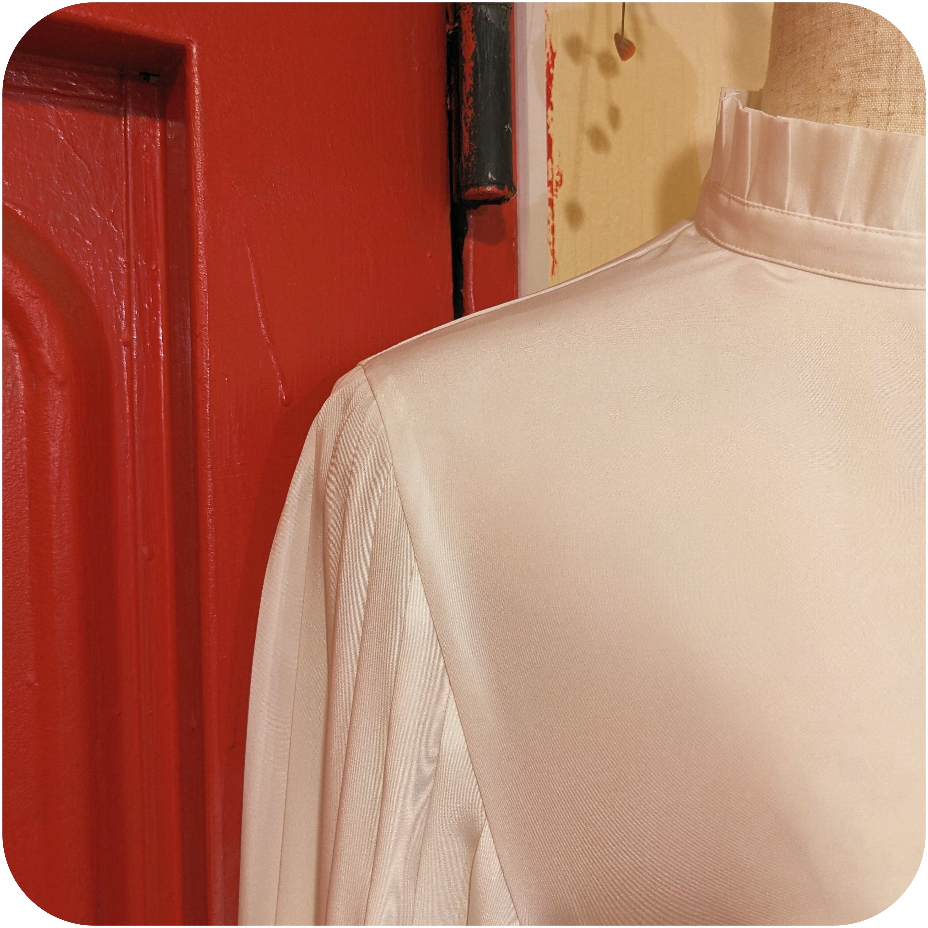 袖部分にプリーツがほどこされたユニークなデザインと、上品なパールボタンがとっても素敵。