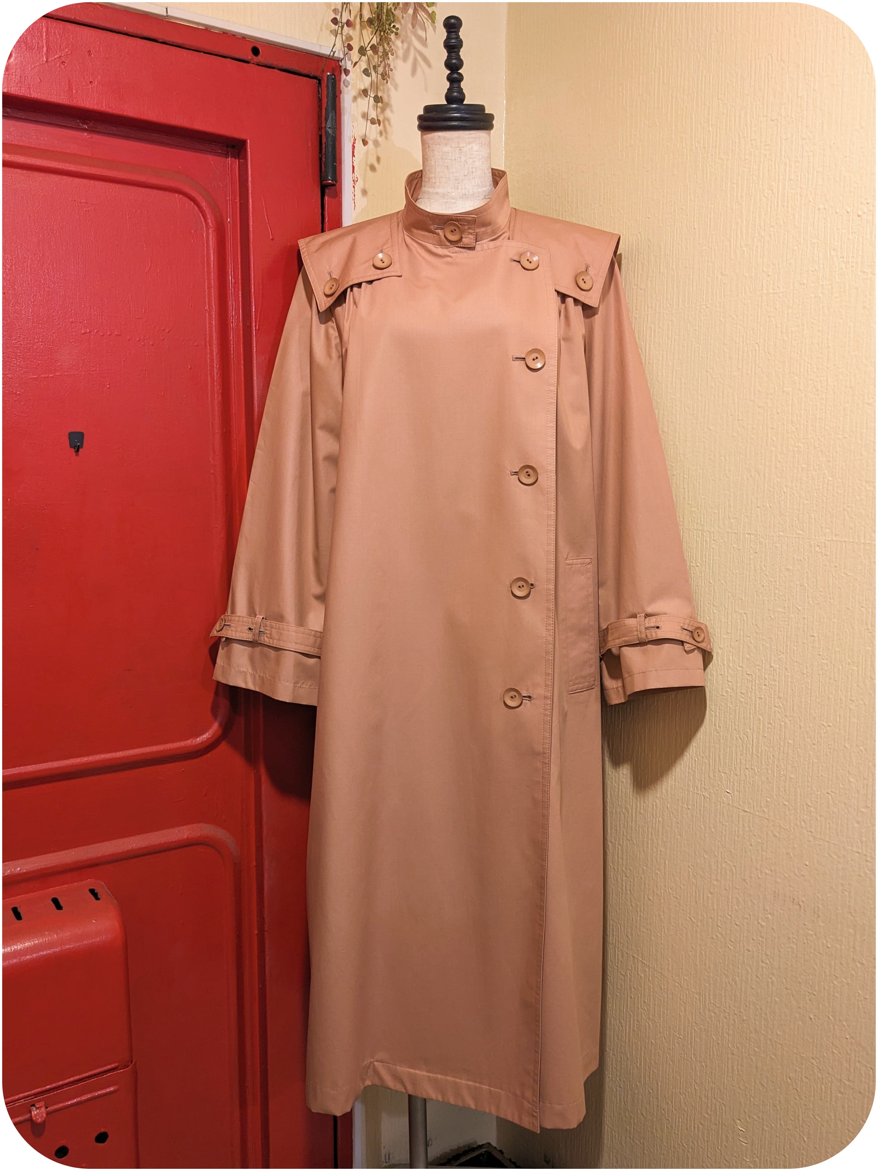 モードなサーモンピンクのボタンデザインコートです。