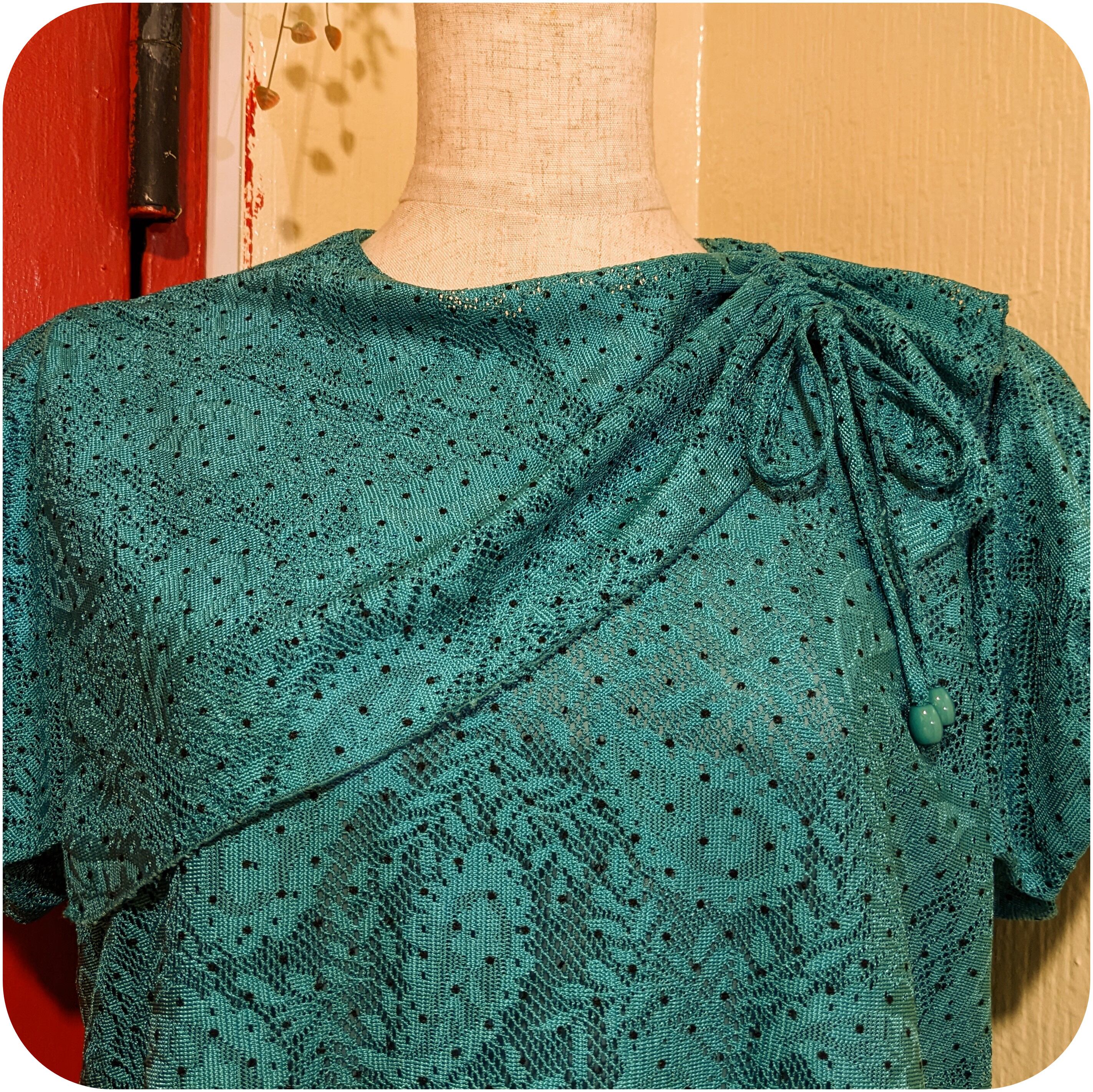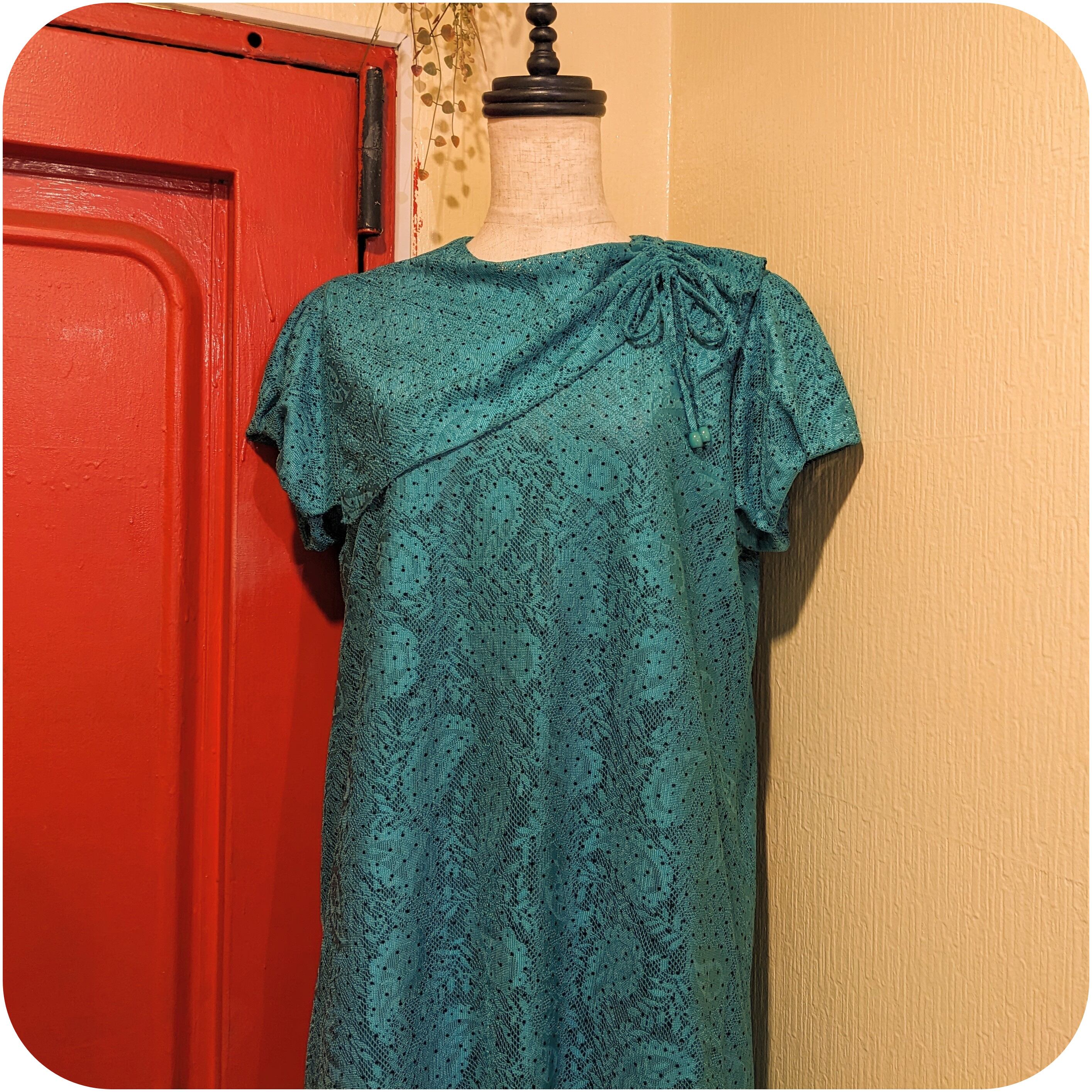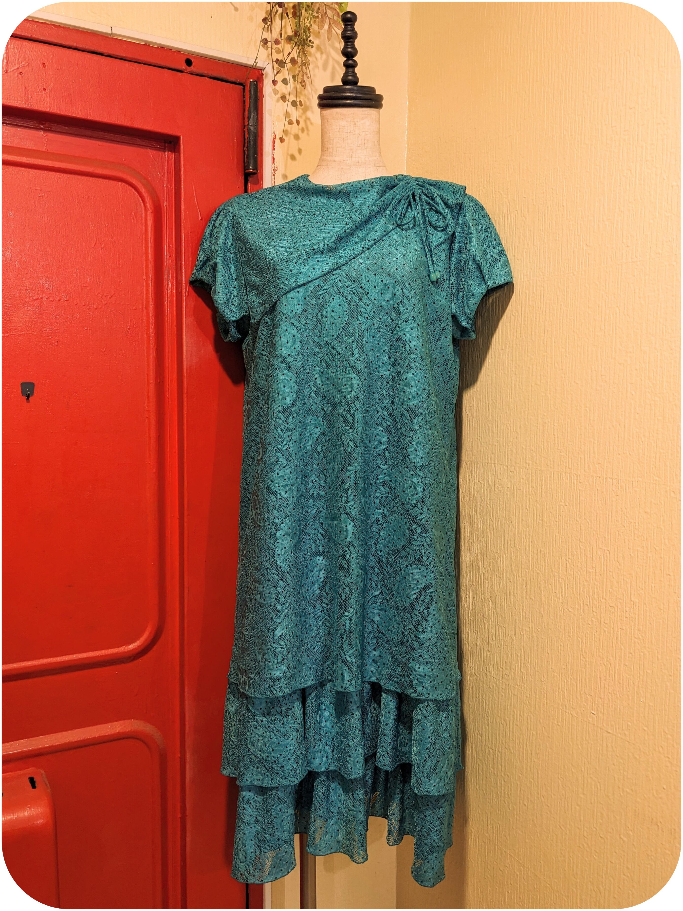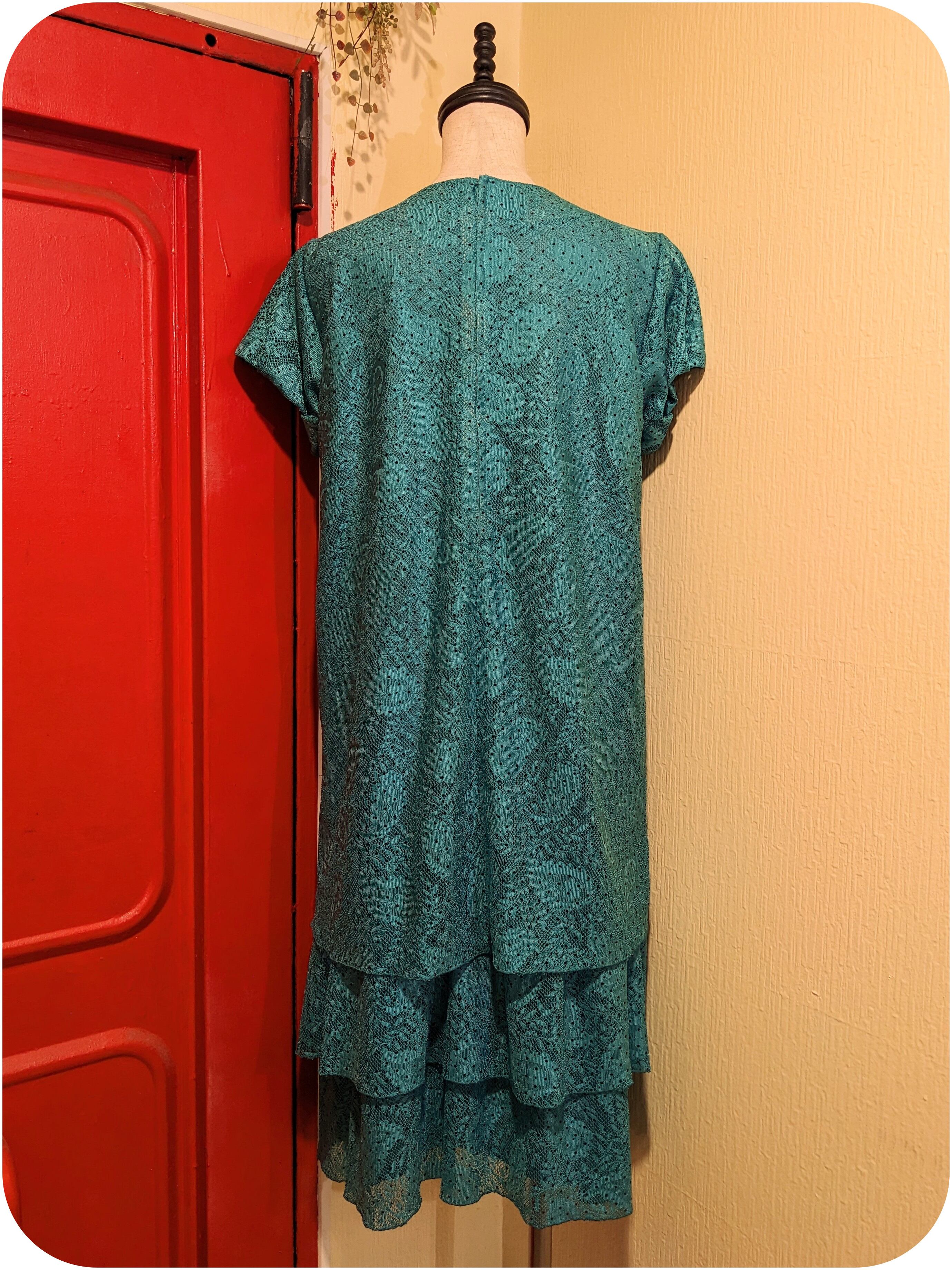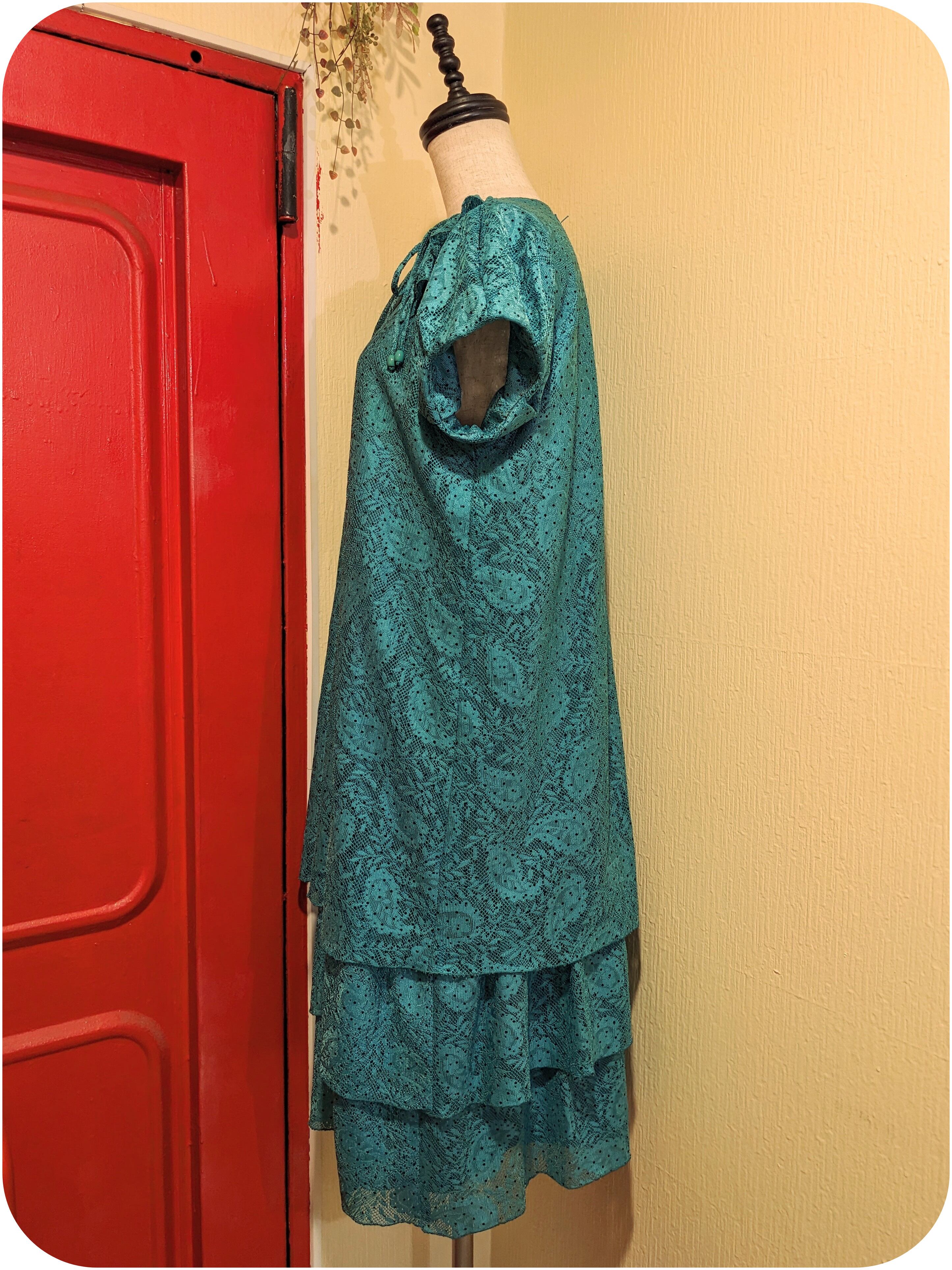 クラシカルなピーコックグリーンのティアードレースワンピースです。