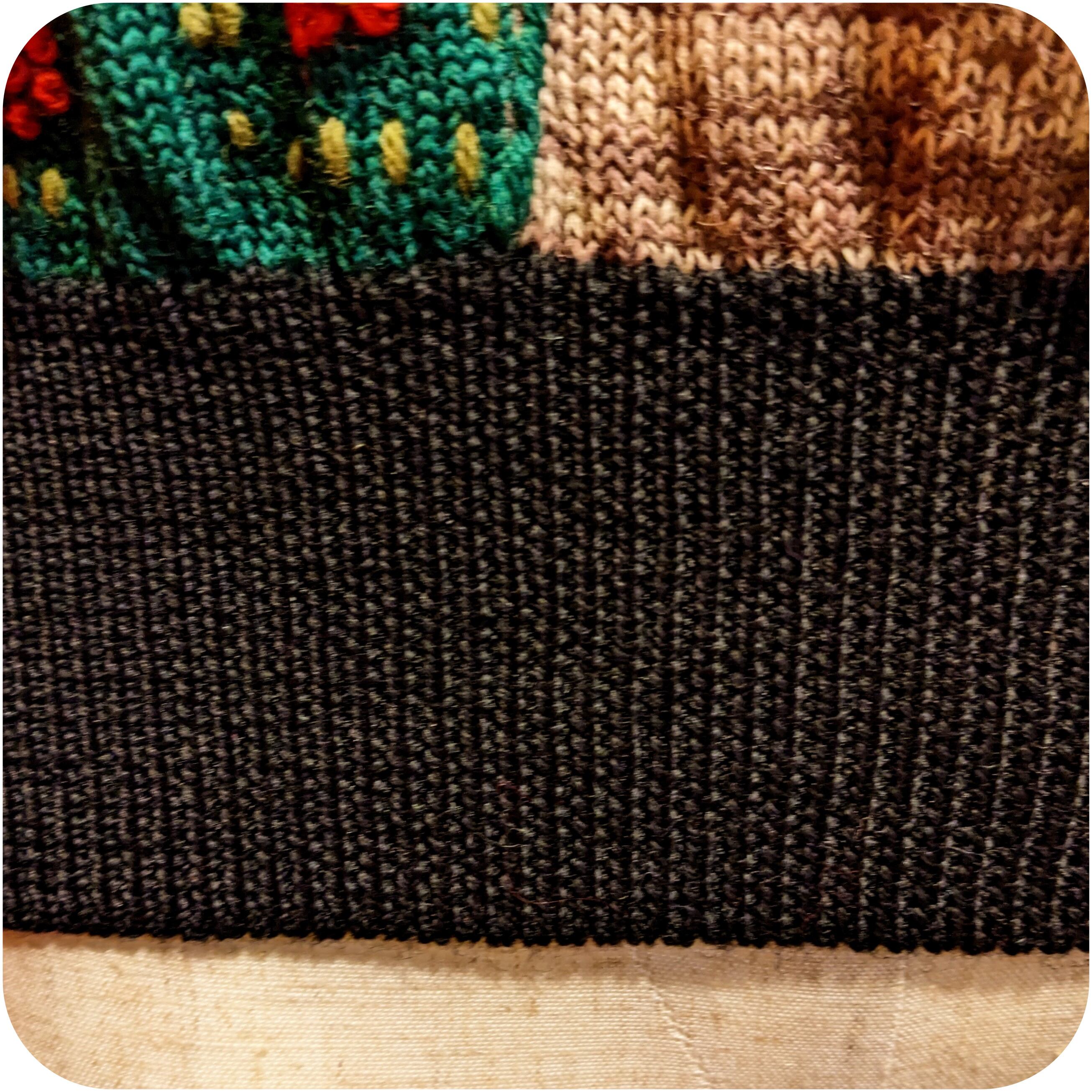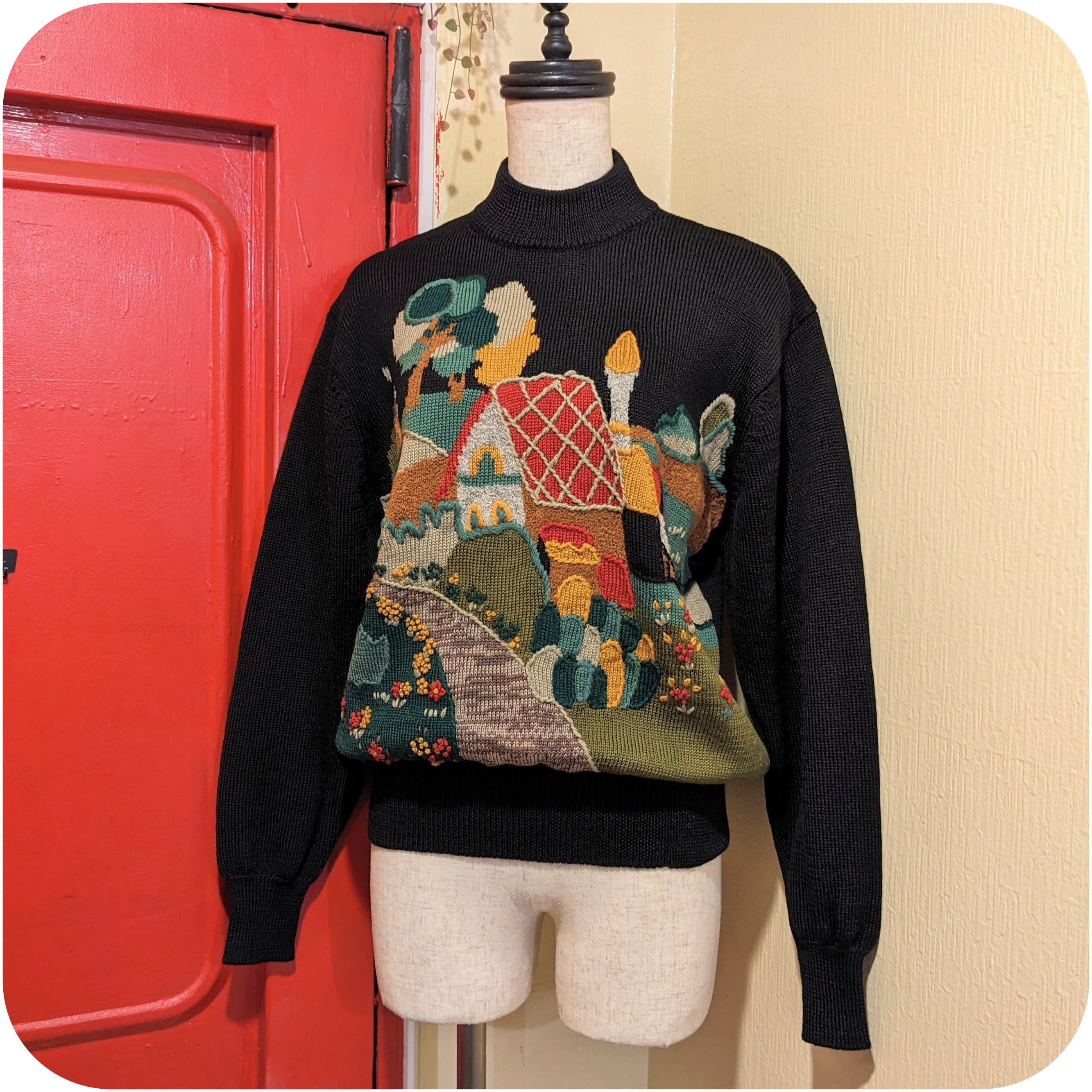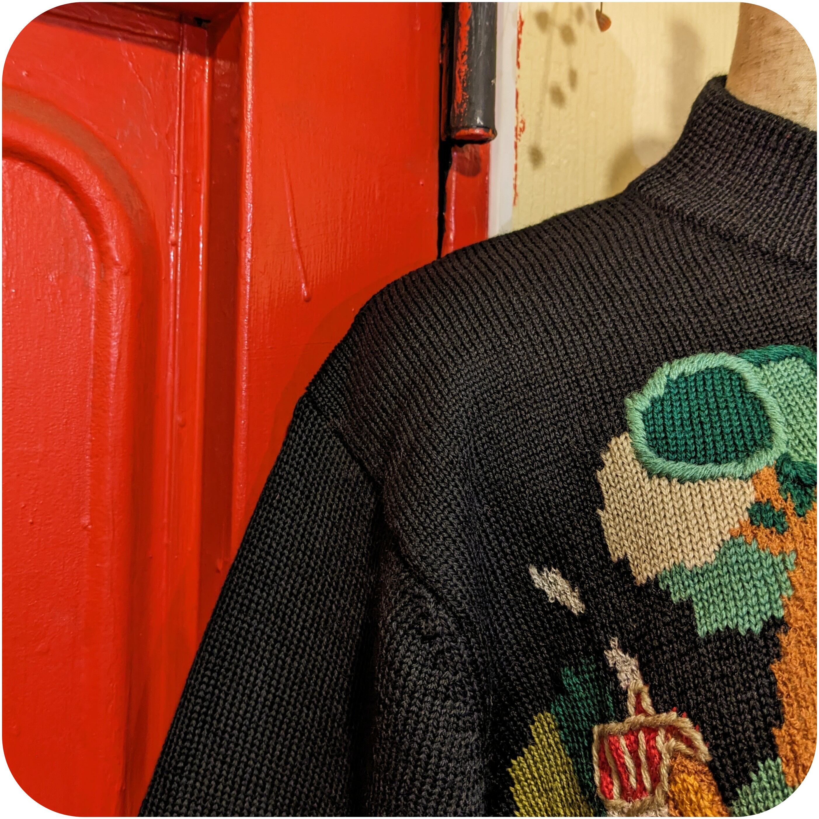 昭和レトロなブラック×レッド×グリーンのメルヘン柄ニット