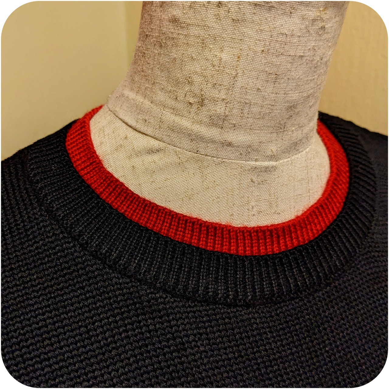 モードなブラック×レッドのボタンホール刺繍入りニット