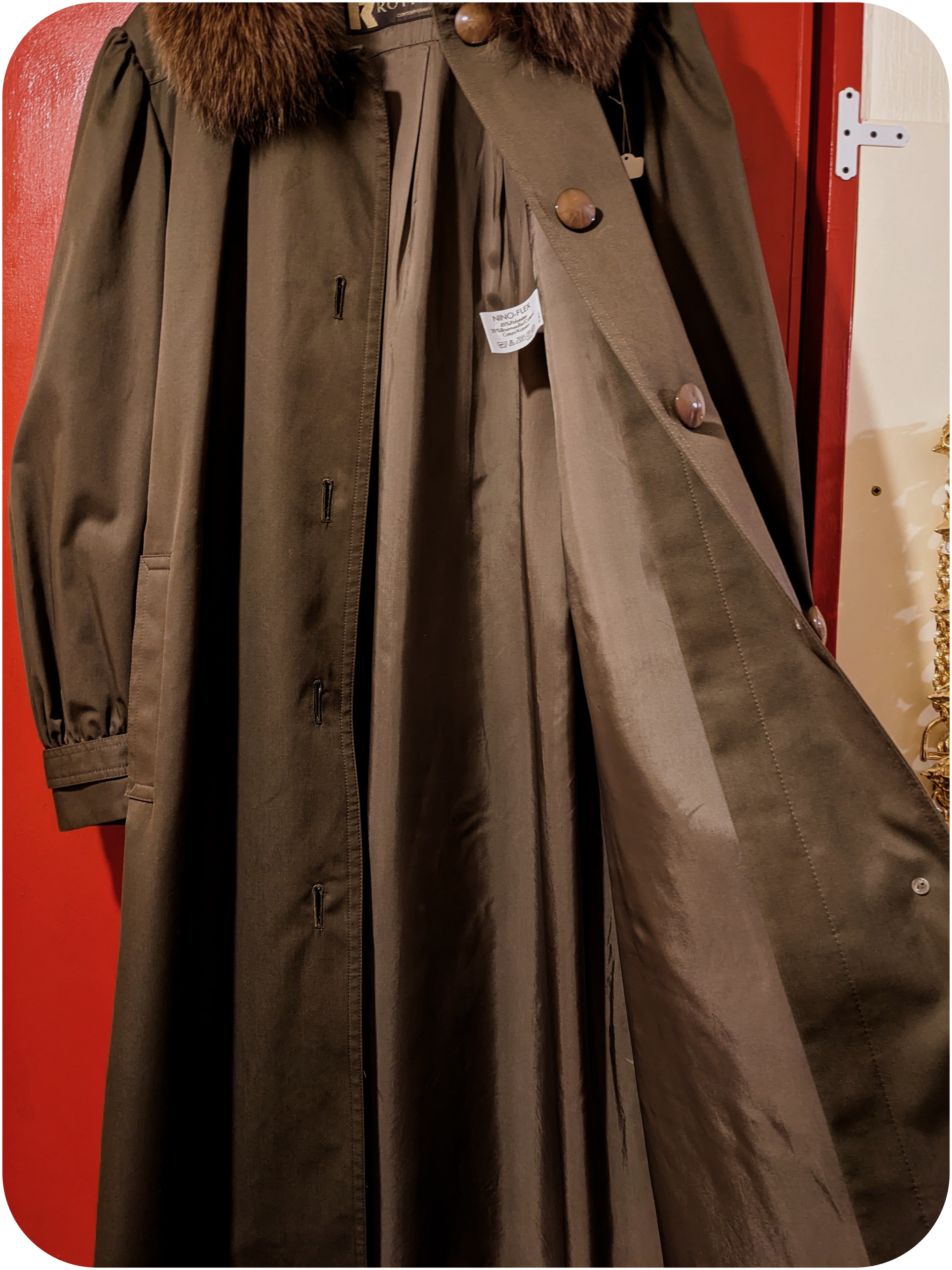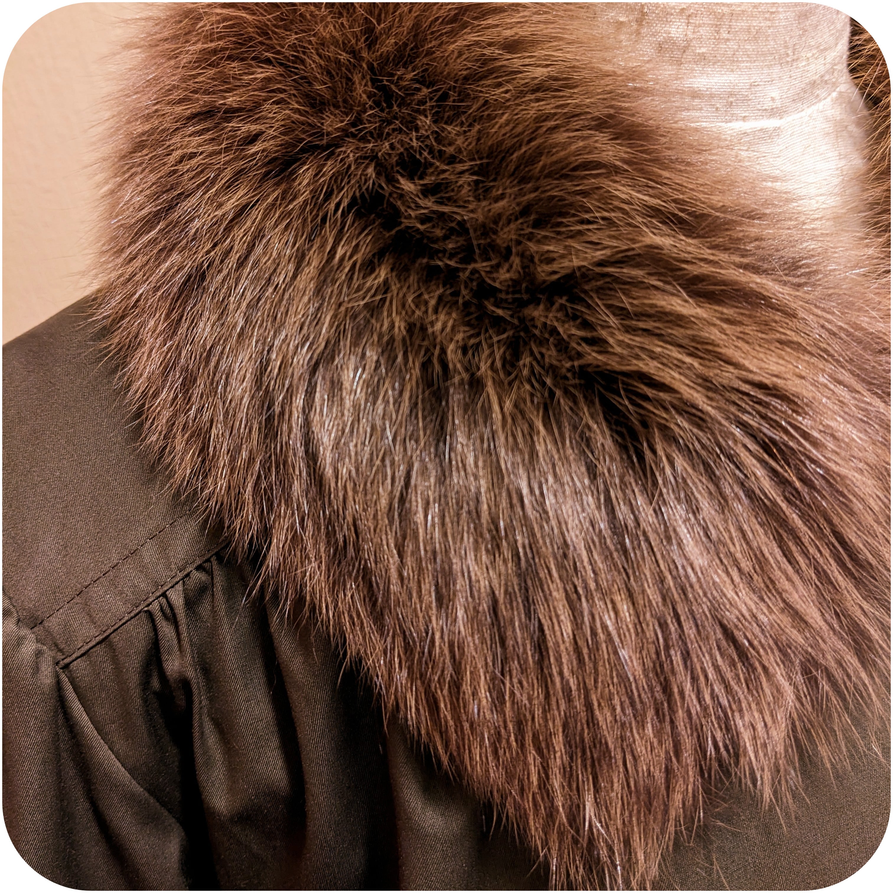 エレガントなダークカーキブラウンのファーデザインコート