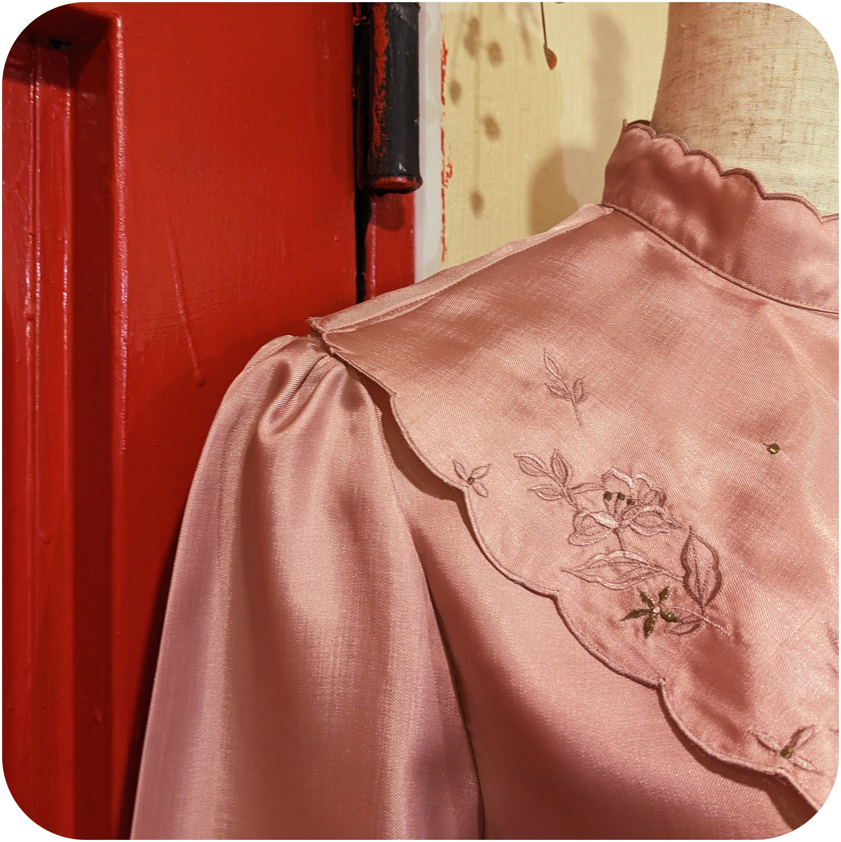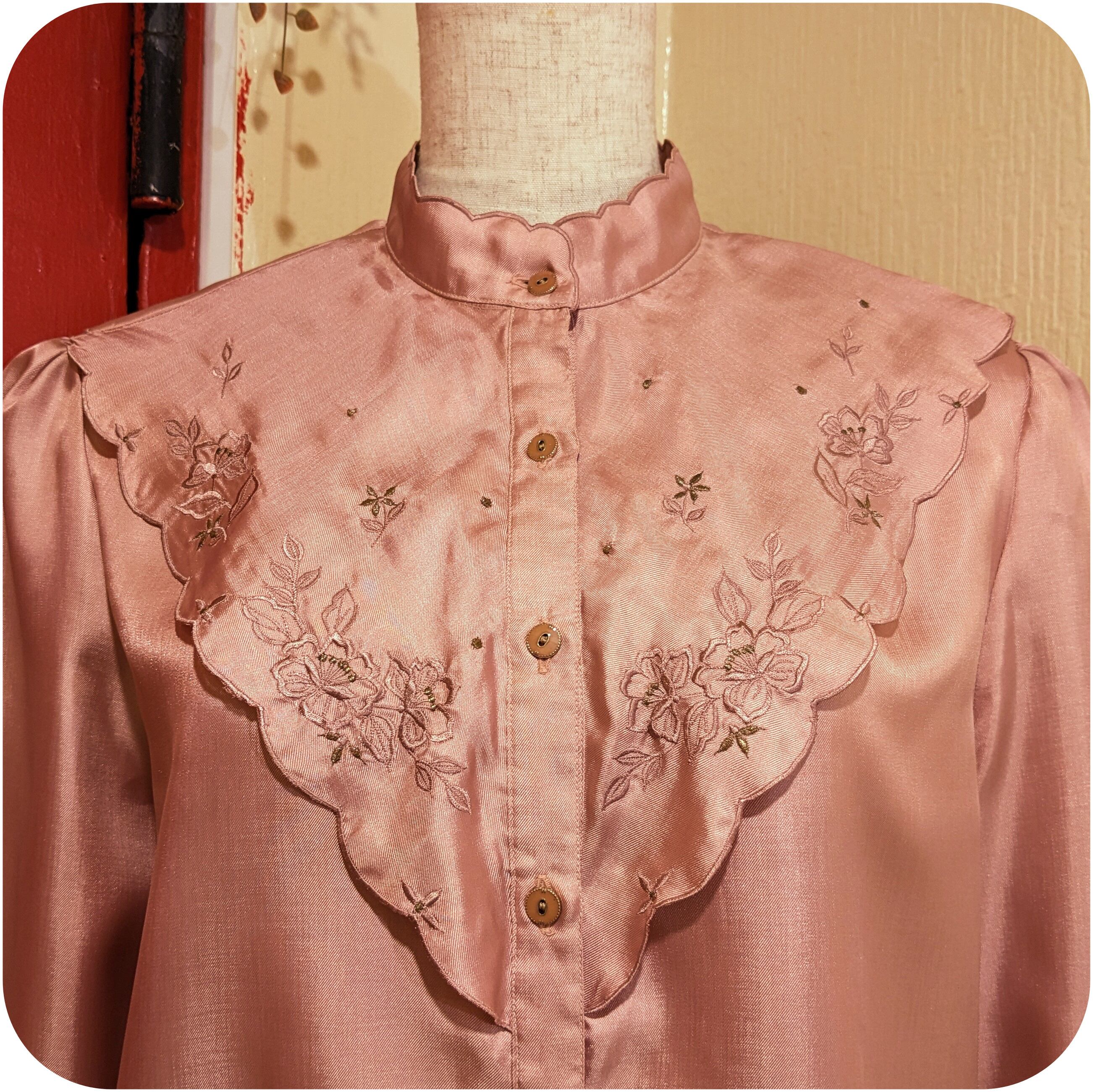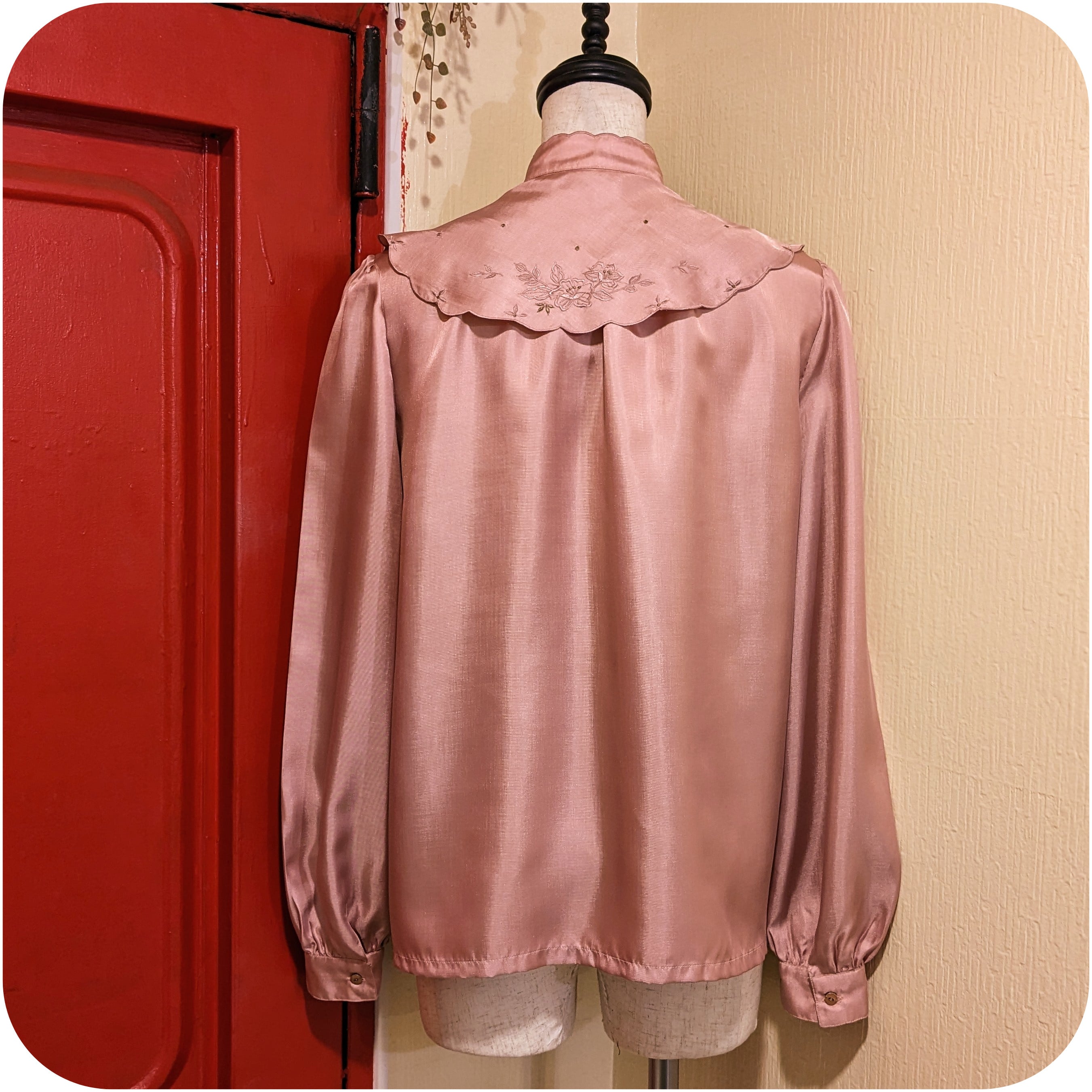 クラシカルなスモーキーピンクのフラワー刺繍入りブラウス